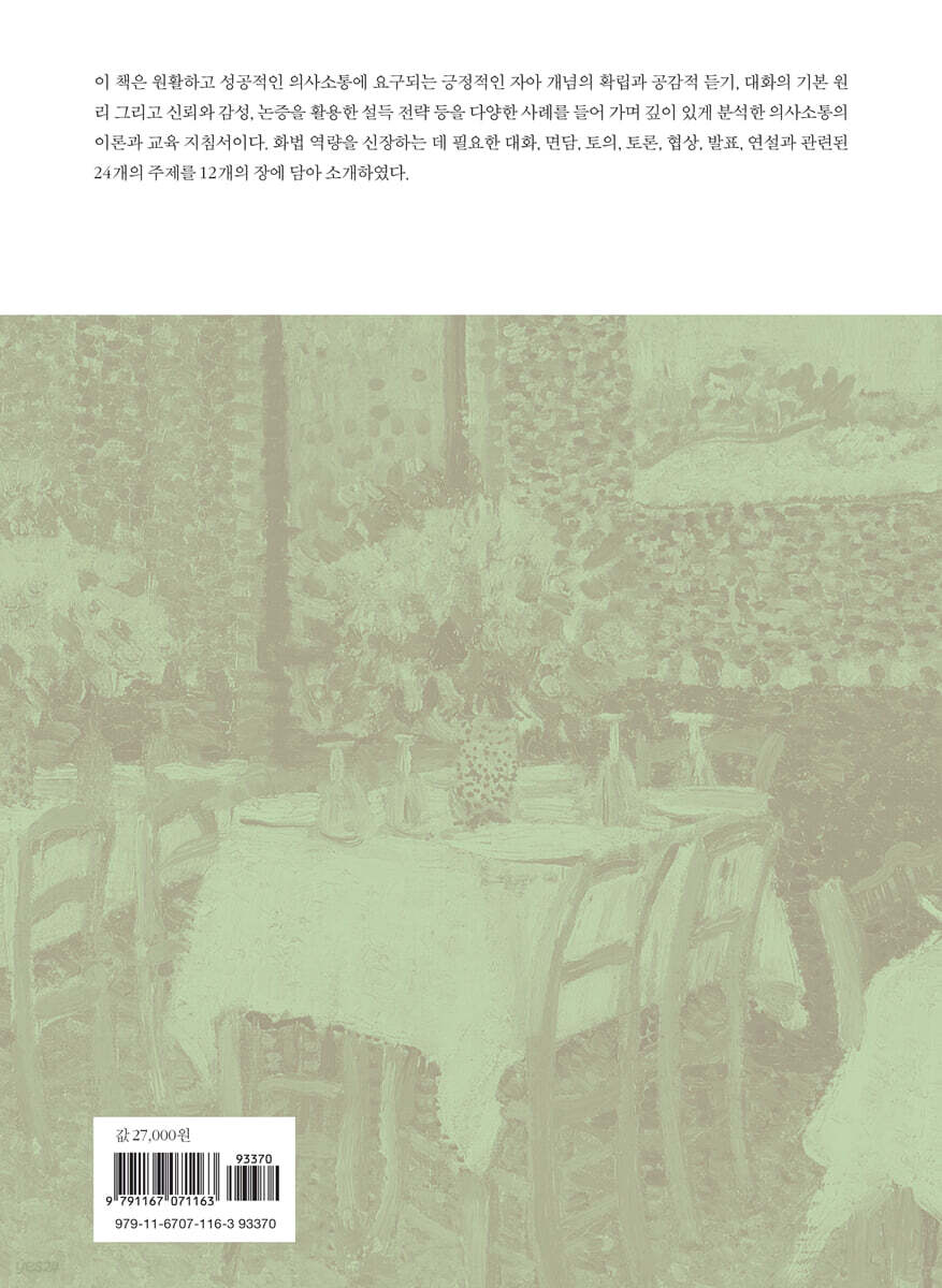 머리말 I. 자아 개념과 의사소통 불안 1. 의사소통과 자아 개념 1) 자아 개념의 형성 과정 2) 자아 개념과 의사소통 방식 2. 의사소통 불안 1) 의사소통 불안의 개념 2) 의사소통 불안의 유형 3) 의사소통 불안의 원인 4) 의사소통 불안의 대처 방법 II. 자기 노출과 공감적 대화 1. 자기 노출 1) 자기 노출의 개념 2) 자기 노출의 효능 3) 자기 노출의 차원 4) 자기 노출의 방법 2. 공감적 대화 1) 공감적 듣기의 개념 2) 공감적 듣기의 방법 3) 감정 표현의 방법: 비폭력 대화 III. 대화의 원리 1. 협력의 원리 1) 협력의 원리 2) 대화 함축 2. 예의의 원리 1) 예의 규칙 2) 공손성의 원리 3) 예의 이론 IV. 비언어 의사소통 1. 비언어 의사소통의 본질 1) 비언어 의사소통의 개념 2) 비언어 의사소통의 유형 2. 비언어 의사소통의 사용 1) 비언어 의사소통의 기능 2) 비언어 의사소통의 사용 원리 V. 의사소통 문화와 언어 공동체 1. 문화적 차원 1) 고-맥락 문화와 저-맥락 문화 2) 문화적 차원 이론 2. 언어 공동체 1) 언어 공동체의 사전적 정의 2) 언어 공동체의 변수 3) 언어 공동체의 조건: 담화 관습 4) 언어 공동체의 범위: 중층과 중복 5) 담화 공동체 VI. 발표와 연설을 위한 설득 메시지 조직 1. 동기화 단계 조직 1) 설득 메시지 조직의 유형 2) 동기화 단계 조직의 기원 3) 동기화 단계 조직의 세부 단계 4) 동기화 단계 조직의 특성 5) 청자 입장에 따른 동기화 단계 2. 내용 연결 표현 1) 내용 연결 표현의 개념 2) 내용 연결 표현의 성격 3) 내용 연결 표현의 유형 4) 내용 연결 표현의 기능 VII. 청자 분석 1. 청자 분석의 원리 1) 청자 분석의 중요성 2) 정교화 가능성 모형 2. 청자 분석과 메시지 조직 1) 메시지 조직의 핵심 변인 2) 핵심 변인의 종합적 적용 VIII. 화자의 공신력과 감성적 설득 전략 1. 화자의 공신력 1) 화자의 공신력의 기원 2) 화자의 공신력의 개념 3) 화자의 공신력의 차원 4) 화자의 공신력 신장 방안 2. 감성적 설득 전략 1) 감성적 소구의 개념 2) 감성적 소구의 중요성 3) 감성적 소구의 유형 4) 감성적 소구의 사용 전략 IX. 논증: 이성적 설득 전략 1. 논증의 원리 1) 논증의 개념 2) 논증의 조건 3) 논증의 요소 4) Toulmin의 논증 모형 2. 논증의 방법과 오류 1) 연역 논증 2) 귀납 논증 3) 인과 논증 4) 유추 논증 5) 기타 오류 유형 X. 토론 1. 토론의 본질 1) 토론의 성격 2) 토론의 목적 3) 토론의 논제 4) 토론의 규칙 5) 토론의 유형 2. 토론의 방법 1) 입증 책임 2) 필수 쟁점 3) 입론 모형 4) 반대 신문 XI. 토의와 협상 1. 토의 1) 토의의 개념과 유형 2) 토의 참여자의 역할과 태도 3) 토의의 절차 4) 토의의 소통 방법 5) 토의 문제 상황 대처 방법 6) 집단사고의 증상과 예방 7) 회의의 원칙 2. 협상 1) 협상의 개념 2) 협상의 원리 3) 협상의 절차 4) 협상의 전략 XII. 면담과 발표(프레젠테이션) 1. 면담 1) 면담의 본질 2) 면담의 절차 3) 면담 질문 방법 4) 면접 5) AI 면접 2. 발표 1) 발표의 본질 2) 발표의 내용 구성 3) 매체 자료 설계와 제작 4) 발표의 표현 전략 5) 청중과 상호작용 참고문헌 찾아보기 |