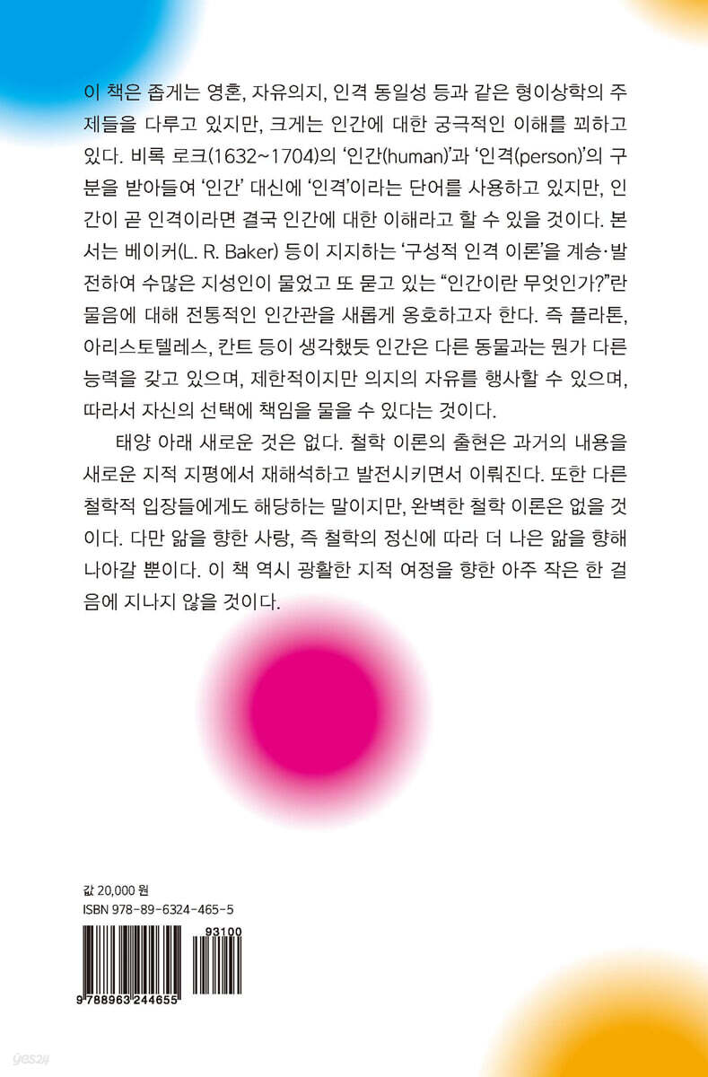 프롤로그 제1장 창발적 이원론의 도전과 그에 대한 평가 1. 서론 2. 데카르트의 인간론과 그 난점들 3. 창발적 이원론의 도전 4. 창발적 이원론의 난점들 5. 결론 제2장 구성적 인격 이론 1. 서론 2. 동물주의 vs. 인격 본질주의 3. 구성 개념과 인간인격 4. 결론 제3장 확장된 자아 이론과 도덕적 주체 1. 서론 2. 확장된 마음 이론과 확장된 자아 3. 도덕적 행위와 그 조건 4. 도덕적 주체로서의 인간인격 5. 결론 제4장 강한 결정론의 도전과 그에 대한 대안 1. 서론 2. 강한 결정론의 도전 3. 합리주의적 양립론 4. 결론 제5장 니체의 자기조형 프로젝트에 대한 평가 1. 서론 2. 니체를 둘러싼 두 가지 해석: 양립주의 vs. 비양립주의 3. ‘자기통제’ 없는 ‘자기조형’? 4. 결론 제6장 능력주의와 새로운 귀족주의: 사건-인과 자유주의자로서의 니체 1. 서론 2. 비일관성의 문제 3. 사건-인과 자유론자로서의 니체 4. 결론 제7장 인공물에게 책임을 물을 수 있는가 1. 서론 2. 데이빗슨과 프로케소바 3. 도덕적 행위자의 조건 4. 결론 제8장 구성적 인격 이론과 인격적 삶의 서사적 구조성 1. 서론 2. 쉑트먼의 자기서사 이론과 그 난점들 3. 구성적 인격 이론과 인격적 삶의 서사적 구조 4. 결론 제9장 자유의지 문제는 경험과학의 문제인가: 발라규어의 사건 인과 자유론에 대한 반론 1. 서론 2. 자유론적 자유와 경험과학 문제로서의 자유의지 3. 평가 4. 결론 제10장 섹스로봇은 인격적 동반자가 될 수 있는가: ‘상징-결과 논변’에 대한 반론 1. 서론 2. 상징-결과 논변 3. 반론 4. 결론 제11장 구성 이론의 응용 I: 부활체 문제 1. 부활과 인격 동일성 2. 유아주의와 죽음의 에토스 3. 부활체와 부활체의 동일성 제12장 구성 이론의 응용 II: 신의 형상과 인간 인격 1. 부활과 인격 동일성 2. 신적 행위와 신의 형상 3. 인간 인격과 새로운 인간론 4. 결론 |