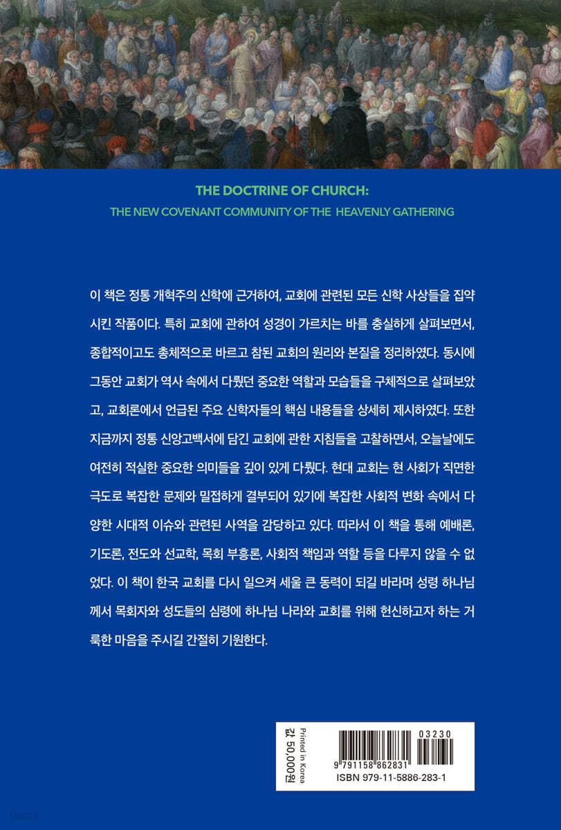 제 1 부 교회에 관한 성경적인 가르침들 제 1 장 교회의 신적 기초20 1. 최초로 교회를 세우신 예수 그리스도 22 2. 말씀 위에 세워진 교회 35 3. 구약의 이스라엘에서 신약의 교회로 48 4. 신앙고백 위에 세워진 교회 64 5. 예수 그리스도의 인격과 사역 68 제 2 장 광야 교회 80 1. 모세와 함께하던 시대 83 2. 광야 생활의 교훈들 88 3. 예수님께서 승리하신 광야 92 4. 그리스도의 중보 사역 97 5. 고난과 시험 중에 승리하는 교회 104 제 3 장 교회의 개념110 1. “에클레시아”의 의미 111 2. “에클레시아”의 용례 119 3. “그리스도인” 128 4. “그리스도 안에” 138 5. 구원받은 하나의 공동체 156 제 4 장 교회의 비유들159 1. 머리와 몸 164 2. 성전 173 3. 하나님의 집 189 4. “하늘”의 “예루살렘” 198 5. 진리의 기둥과 터 207 6. 피 흘려 사신 교회 214 7. 그리스도의 신부 218 8. 남은 자 221 제 5 장 교회의 본질229 1. 세 위격을 가진 한 하나님 231 2. 하나님의 백성들238 3. 그리스도의 몸 265 4. 성령의 전 272 제 6 장 교회의 비전 285 1. 승천 교리의 중요성 289 2. 승천은 교회의 비전이다304 3. 승천과 교회의 긴밀성 323 4. 그리스도의 존귀케 되심338 5. 승천 교리의 왜곡된 해석들355 6. 구속 역사가 세상에 빛을 주다364 제 7 장 교회의 출현407 1. 약속의 성취410 2. 예수님의 임재 가운데 있는 교회415 3. 하늘나라의 확산425 4. 성령 강림은 예수님의 특수한 임재 방식이다434 5. 성령은 오직 그리스도만 증거한다439 6. 생명을 주시는 성령443 7. 오순절과 영혼의 수확 448 8. 성령의 교통하심 458 제 2 부 교회에 관한 신앙고백서의 교훈들 제 8 장 교회의 속성들 478 1. 교회의 통일성 490 2. 교회의 거룩성 540 3. 교회의 보편성 577 4. 교회의 사도성 605 제 9 장 참된 교회의 표지들 629 1. 신앙고백서에 담긴 표지들 632 2. 제 3의 표지, 권징의 시행 651 제 10 장 새 언약과 교회 677 1. 언약의 통일성과 연속성 678 2. 두 가지 언약 681 3. 언약 관계의 기본 구조 689 4. 언약의 통일성과 유기적 연속성 707 5. 언약 신학의 논제들 739 6. 새 언약의 공동체 747 7. 새 언약과 교회 755 제 11 장 교회와 하나님의 나라 763 1. 교회와 하나님의 나라와의 관계 767 2. 주님의 통치, 권위, 임재 778 3. 현재 내재성과 미래 종말론적 특성 790 4. 하나님 나라의 공동체로서 교회 795 제 3 부 역사 속에서 교회 제 12 장 초대 교부들의 교회 건설 804 1. 사도의 복음과 교회의 확산 807 2. 핍박당하는 곳에 세워진 교회 814 3. 정통 교리 체계의 핵심, 삼위일체 하나님 830 4. 초기 감독제의 역할 846 제 13 장 교회의 회복과 위대한 신학 사상들 854 1. 어거스틴의 교회론과 신학 사상 856 2. 어거스틴의 신학 사상과 교훈들 880 3. 종교개혁자들의 교회 회복 893 4. 루터의 교회 개혁 906 5. 교회의 자치권을 쟁취한 칼빈 916 6. 청교도들의 교회론 948 제 14 장 존 오웬의 교회론과 신학 사상 969 1. 영적인 삶에 관한 교훈들 971 2. 오웬의 교회론과 분열에 관한 조언들 995 3. 경건에 관한 교훈들 1004 4. 경건의 목표 1019 5. 경건의 절정 1022 |