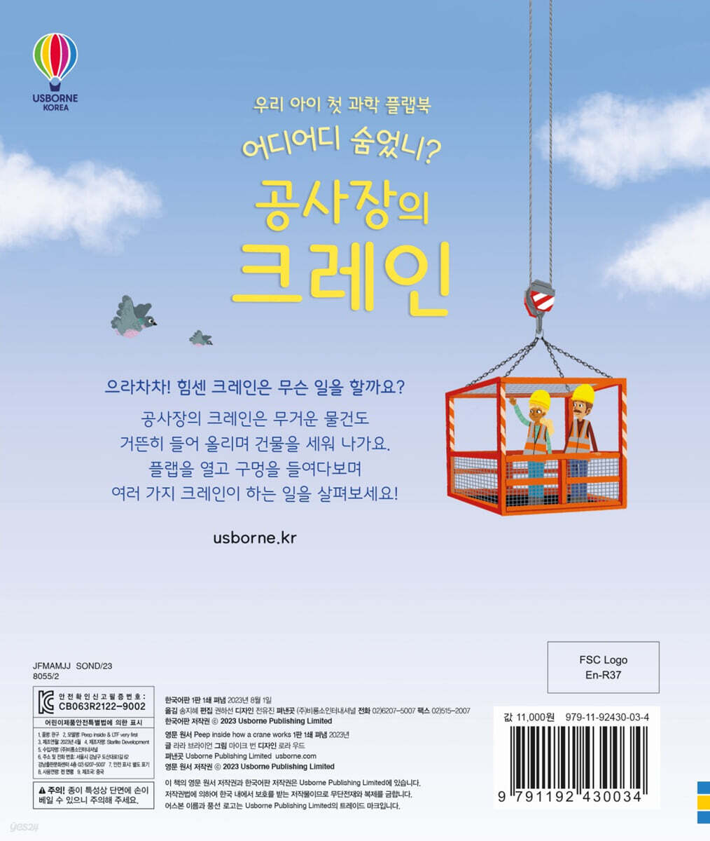 바쁘게 움직이는 공사장의 하루를 따라가 봐요! 어디어디 숨었니? 구멍 사이로 살짝 보이는 크레인 안에 무엇이 있는지 살펴보세요. 크고 작은 플랩을 들추며 크레인과 숨바꼭질하는 기분이 들지요. 플랩을 펼쳐 벽돌 더미를 들어 올리고, 크레인 기둥을 올리고, 엄청나게 높은 타워 크레인을 세우다 보면 마치 내가 건물을 짓고 있는 것 같지요. 장면 곳곳에 쏙쏙 뚫린 구멍을 들여다보고 손가락을 넣어 보세요. 올록볼록 두꺼운 종이의 질감이 아이들의 촉각을 자극하고, 손 조작 능력을 발달시켜 줄 거예요. ◆ 유아의 눈높이에 꼭 맞추어 전하는 여러 가지 크레인과 뚝딱뚝딱 건물 짓기 타워 크레인의 꼭대기에는 무엇이 있을까요? 비가 오는 날에도 타워 크레인은 일을 할까요? 크레인에는 어떤 장치들이 매달려 있을까요? 거미처럼 생긴 크레인은 무슨 일을 할까요? 책 속 물음을 따라 플랩을 하나씩 열면서 여러 가지 크레인의 종류와 쓰임새를 알아보고, 건물을 짓는 과정을 자연스럽게 익혀요. 간결하고 리듬감 있는 문체와 귀엽고 아기자기한 그림은 유아들도 쉽게 책에 몰입하도록 도와주어요. 플랩을 열고 닫으며 지식을 쏙쏙 얻고 집중력과 관찰력을 높일 수 있답니다. |