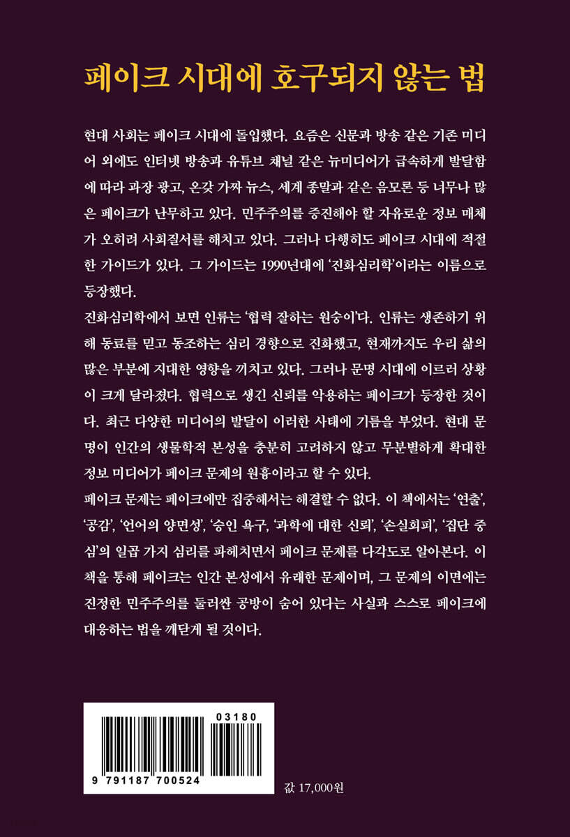 --- p.69~70 자신은 그저 ‘할 수 있는 척’을 하고 있다고 생각하는 이 증상은 ‘임포스터impostor(사기꾼) 현상’으로 불리며, 언제 ‘할 수 있는 사람’이라는 가면이 벗겨질까 전전긍긍하며 불안해한다. 사실은 ‘가능성 있는 사람’인데도 스스로를 의심한다. (중략) 임포스터 현상은 일본에서 흔히 볼 수 있는데, 대개 ‘겸손의 미덕’으로 비친다. 겸손의 미덕은 능력이 좋은 사람이 집단 분위기를 흐리지 않으려 애써 못하는 척하는 모종의 자기기만이다. ‘할 수 있는 사람’인데도 ‘못하는 척’한다면 그다지 큰 스트레스를 받지 않겠지만, 잘못된 자기기만을 자각하지 못한다면 문제가 생긴다. ‘못하는 척’이 ‘진짜 못한다’라는 인식으로 바뀌면서 임포스터 현상을 겪을 수 있기 때문이다. 자기긍정의 기만이 무의식적으로 긍정을 확대시키면 실력 없는 나르시시스트가 될 우려가 있다. 그 반대로 ‘겸손의 미덕’이라는 자기부정의 기만이 무의식적으로 세뇌되고 확대되면 임포스터가 될 위험이 있다. 어느 쪽이든 적당한 자기기만이 중요하다. --- p.133~134 SNS는 현대적 소통의 장이며, 현대인들의 안심하고 싶은 감정과 인정 욕구를 충족시키는 공간이 되고 있다. ‘좋아요’를 많이 받거나 많은 팔로워가 생기면, 정보 발신에 따른 자기긍정감이 높아진다. 그런데 아무리 숫자가 늘어나도 협력 집단의 구성원으로 인정받은 것은 아니다. 다만 인정받은 것 같아 승인 욕구가 일시적으로 해소될 뿐이다. 기존의 미디어도 인정받고 싶은 정치인과 전문가들의 페이크 발언을 보도해왔다. 하물며 일반 시민들이 거리낌 없이 참여 가능한 현대의 정보 미디어에서 이러한 페이크가 없다는 것은 말이 안 된다. 그러므로 정보의 출처를 찾아보고 거기에 자기어필이나 인정 욕구가 숨어 있지 않은지를 판단해야 한다. 또한 스스로 정보를 발신하는 경우에는 정밀하게 분석한 후 오해가 생기지 않도록 표현하려는 태도가 중요하다. --- p.140 한창 난폭운전이 사회 문제로 떠오른 몇 년 전, 심각한 악플 사건이 일어났다. 이 일의 배경은 한 운전자가 난폭운전을 한 후, 실제로 폭력을 휘두른 사건에서 비롯되었다. 당시 모습의 일부가 다른 차량의 블랙박스에 녹화되었는데, 중년 남성으로 보이는 난폭운전자가 차량에서 내린 후 피해자를 폭행하는 장면이 담겨 있었다. 더욱 문제가 된 이유는 가해자와 일행으로 추측되는 한 여성이 폭행을 말리지 않고 태연하게 휴대폰으로 폭행 장면을 촬영했기 때문이다. 이 사건의 화살은 젊은 여성에게로 돌아갔다. 폭력 사건이 보도된 후 그 여성과 비슷하게 생긴 다른 사람의 신상 정보가 SNS에 유출되었고 그녀에 관한 수많은 악플이 달렸다. 이 사건은 페이크가 ‘정보 폭력’으로 번지는 사태를 여실히 보여주었으며, 이를 계기로 일본에서는 사실무근인 비방에 대해 법적 조치가 마련되었다. 처음 SNS에 올라온 사진이 블랙박스에 담긴 여성과 ‘비슷한 것 같다’는 단순한 억측이 점점 ‘저 사람이 맞다’는 확신으로 변하고, 네티즌 수사대가 그 여성의 이름과 집 주소, 직장까지 파헤쳤다. 때로는 악의가 아닌 정의감에 넘친 행동이 결과적으로 페이크를 생산하고 확산시키기도 한다. 이러한 사태는 페이크 문제를 적나라하게 보여준다. --- p.177~179 인터넷 악플은 집단의 규칙을 위반한 데서 비롯된 사형으로 파악할 수 있으며, 마녀사냥과 같이 옛날부터 관찰된 보편적인 행동 중 하나라고 볼 수 있다. 행동경제학의 연구 대상이자 인간의 심리에서 비롯된 자연스러운 행동으로 해석할 수 있는 것이다. 하지만 사형을 집행하는 종교 집단이나 연합군과 같은 협력 집단은 일반적으로 굉장히 밀접한 인간관계를 배경으로 하는 반면, 인터넷에서는 이상하게도 밀접한 관계를 맺고 있는 집단은 드물다. 이런 관점에서 생각해보면, 인터넷에 악플을 다는 사람들은 ‘상상의 협력 집단’을 형성하고 있다는 의견이 높은 설득력을 갖게 된다. 악플 테러를 하는 사람들은 오히려 가까운 집단에서 협력 활동을 하는 경험이 드물어 인터넷상에서 정의감을 표출하고 싶은 것인지도 모른다. 인터넷상에서 ‘범인 찾기’에 매진함으로써 가공의 협력 집단에서 인정받았다는 ‘승인 욕구’가 충족되는 착각이 일어나는 것이다. --- p.182~183 우리는 언어의 전제조건에 조금 더 민감해야 한다. 코로나가 유행하기 시작할 무렵, 한 연구자는 시뮬레이션을 통해 당장 대책을 마련하지 않으면 두 달 뒤 하루에 수천 명의 확진자가 나올 것이라 예측했다. 나는 그 연구자가 최악의 경우를 대비해 이야기한 것이므로 그 안에 어느 정도 대책안도 강구될 것이라 예상하고, 실제로는 연구자가 말한 정도의 감염률이 나타나지 않을 거라 생각했다. 아니나 다를까, 두 달 뒤 확진자 수는 그리 많지 않았다. 하지만 놀랍게도 확진자 수가 별로 늘지 않자 그 연구자는 ‘사회의 혼란을 불러일으키는 사람’이라 지탄받았다. (중략) 이러한 상황을 예방하려면 예측에 실패한 사람을 사회의 혼란을 야기하는 사람이라고 비방하는 태도는 지양해야 한다. 앞서 언급한 연구자를 비판하는 행동은 일시적으로 사고의 혼란