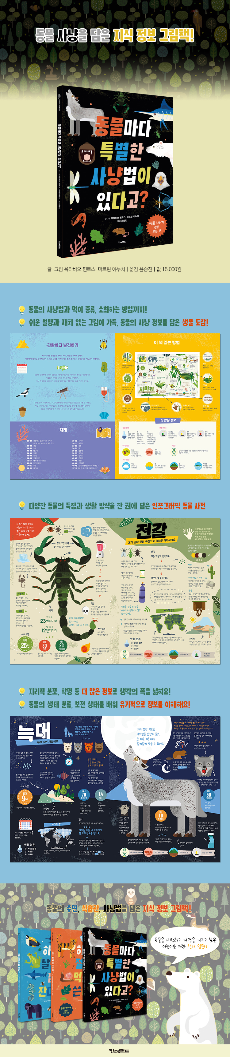 지구에 사는 동물들은 육지와 바다, 하늘을 누비며 살아요. 야생에서 살아남기 위해 혼자서, 혹은 무리를 이루어 서로 쫓고 쫓기면서 무시무시한 사냥꾼이 되었지요. 자연은 살아남기 위해 싸움을 벌이는 전쟁터예요. 생태계에 존재하는 모든 유기체는 서로 의존할 수밖에 없지요. 사냥 기술도 서로 연관되어 있어요. 동물의 왕국에서 포식자와 먹잇감은 다양한 사냥 기술로 관계를 맺어요. 각각의 동물들은 먹이를 사냥하는 자기만의 방식을 개발했지요. 서식 환경이나 몸의 크기, 감각의 발달 정도, 생활 방식 등과 관련이 있어요. 사냥은 생존과 번식은 물론 서식지 등 육식 동물의 한살이 전반에 영향을 미쳐요. 앞서 소개한 것처럼 이 책은 동물의 ‘사냥법’을 중심으로 서식지, 기대 수명, 지리적 분포, 보전 상태 등 동물과 관련한 거의 모든 정보를 소개하고 있어요. 자칫 딱딱하게 다가올 수 있는 방대한 양의 정보를 재미있는 글과 일러스트, 인포그래픽으로 쉽고 직관적으로 이해할 수 있게 디자인했지요. OOO는 어떻게 사냥 기술을 전파할 수 있게 되었을까요? 일 년에 딱 한 번 사냥하는 OO은 어떻게 살아남을 수 있었을까요? 좋아하는 동물의 사냥법에 관한 특별한 비밀을, 책 속에서 찾아보세요. 초등 교과 연계 1학년 1학기 봄 02. 도란도란 봄동산 2학년 2학기 겨울 02. 겨울 탐정대의 친구 찾기 3학년 1학기 과학 03. 동물의 한살이 3학년 2학기 과학 02. 동물의 생활 |