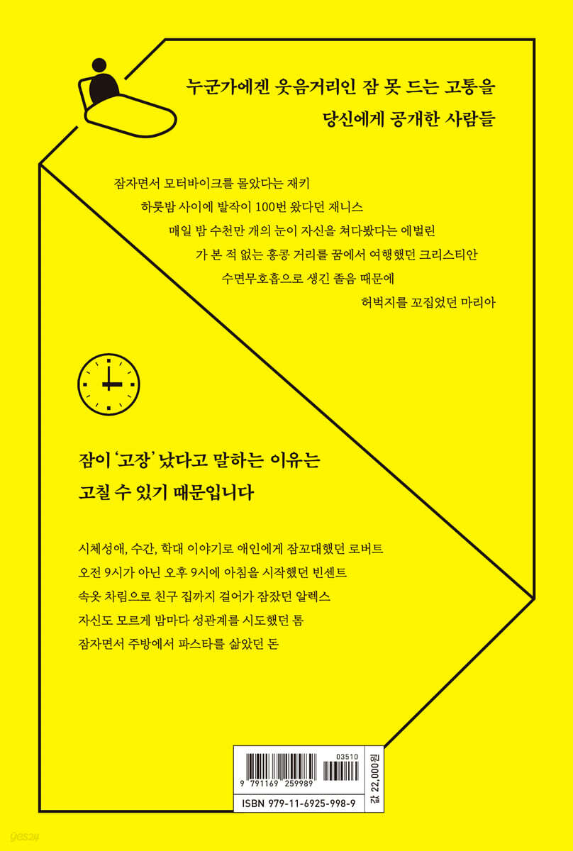 --- 「프롤로그」 중에서 사람을 사회집단으로서 동기화하는 데 하루주기 시계가 얼마나 중요한지를 보면 놀랍다. 그 덕분에 우리는 서로 비슷한 리듬으로 살고, 같은 시간에 식사하거나 일하고, 같은 시간에 놀거나 자니까 말이다. (…) 하루주기 시계를 잃어버린 사람의 삶은 어떨까? 자신의 가족, 친구, 동료와 단절되고 마는 것이다. --- 「1장, 잠의 표준시」 중에서 결론적으로, 잠은 뇌 전체에서 생기는 포괄적 현상이 아닌 국소적 현상으로 보인다. 사람의 뇌는 전체 영역이 똑같이 일시에 작동하지 않는다. 돌고래가 한쪽 뇌 반구로만 잠자듯, 사람의 뇌에서도 부분적으로나마 돌고래의 잠과 같은 일이 일어날 수 있는 듯 보인다. --- 「2장, 모두 잠든 후에」 중에서 하지불안증후군에 약물요법을 시작할지 결정하는 건 간단한 문제가 아니다. 비유하자면, 하지불안증후군이라는 악마와 싸울지, 악마를 피하는 대신 부작용의 깊은 바다로 빠질지 선택하는 것과 같다. --- 「7장, 눈을 감으면 다가오는 아픔」 중에서 렘수면에 들어가면 우리 몸은 체온조절 기능을 수리합니다. 자동차 정비소를 생각해 보세요. 차의 시동을 끄고 리프트로 들어 올려서 상태를 보잖아요? 일반적인 상황에서는 문제가 잘 보이지 않으니까요. 그거랑 똑같습니다. --- 「11장, 꿈은 게임이다」 중에서 불면증이 있는 사람 중 아무나 붙잡고 잠의 뜻이 무엇인지 물어보라. 그들의 고통 섞인 경험에서 잠의 중요성이 단번에 드러날 것이다. 이렇듯 잠은 기분, 활력, 인지능력, 기억력, 면역계, 대사, 식욕, 불안 등 깬 삶의 모든 측면에 영향을 미치는 존재다. 주변 모든 사람 그리고 자신과의 관계에도 큰 영향을 미친다. --- 「14장, 만악의 근원」 중에서 |