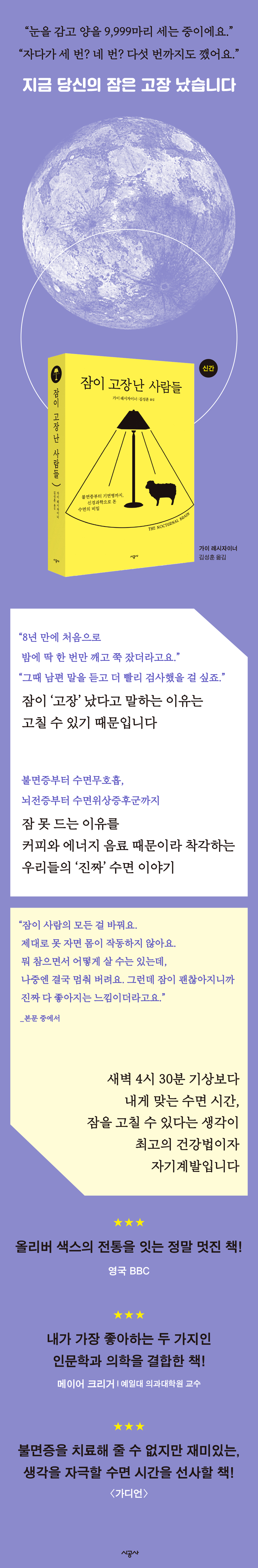 내가 가장 좋아하는 두 가지인 인문학과 의학을 결합한 책이다. 레시자이너는 수면장애가 환자와 그 가족의 삶과 건강에 어떤 영향을 미치는지 강조하는 멋진 이야기를 엮었다. 그 과정에서 우리는 환상적인 수면 과학으로 인도될 것이다. - 메이어 크리거 (예일대 의과대학원 교수)