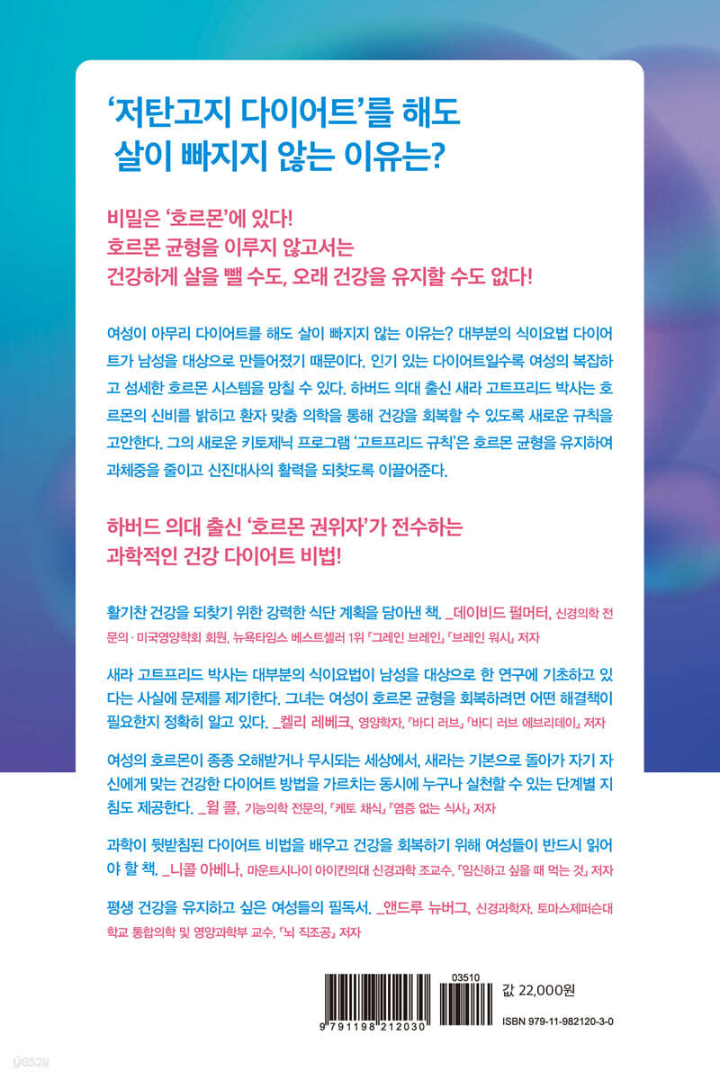 새라 고트프리드 박사는 대부분의 식이요법이 남성을 대상으로 한 연구에 기초하고 있다는 사실에 문제를 제기한다. 그녀는 여성이 호르몬 균형을 회복하려면 어떤 해결책이 필요한지 정확히 알고 있다. - 켈리 레베크 (영양학자, 『바디 러브』 『바디 러브 에브리데이』 저자)
