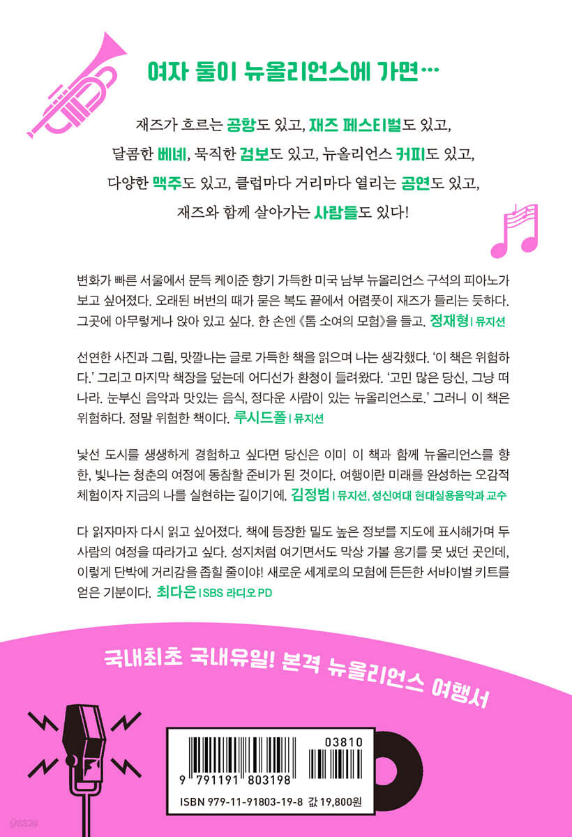 낯선 도시를 생생하게 경험하고 싶다면 당신은 이미 이 책과 함께 뉴올리언스를 향한, 빛나는 청춘의 여정에 동참할 준비가 된 것이다. 여행이란 미래를 완성하는 오감적 체험이자 지금의 나를 실현하는 길이기에. - 푸디토리움 (뮤지션)