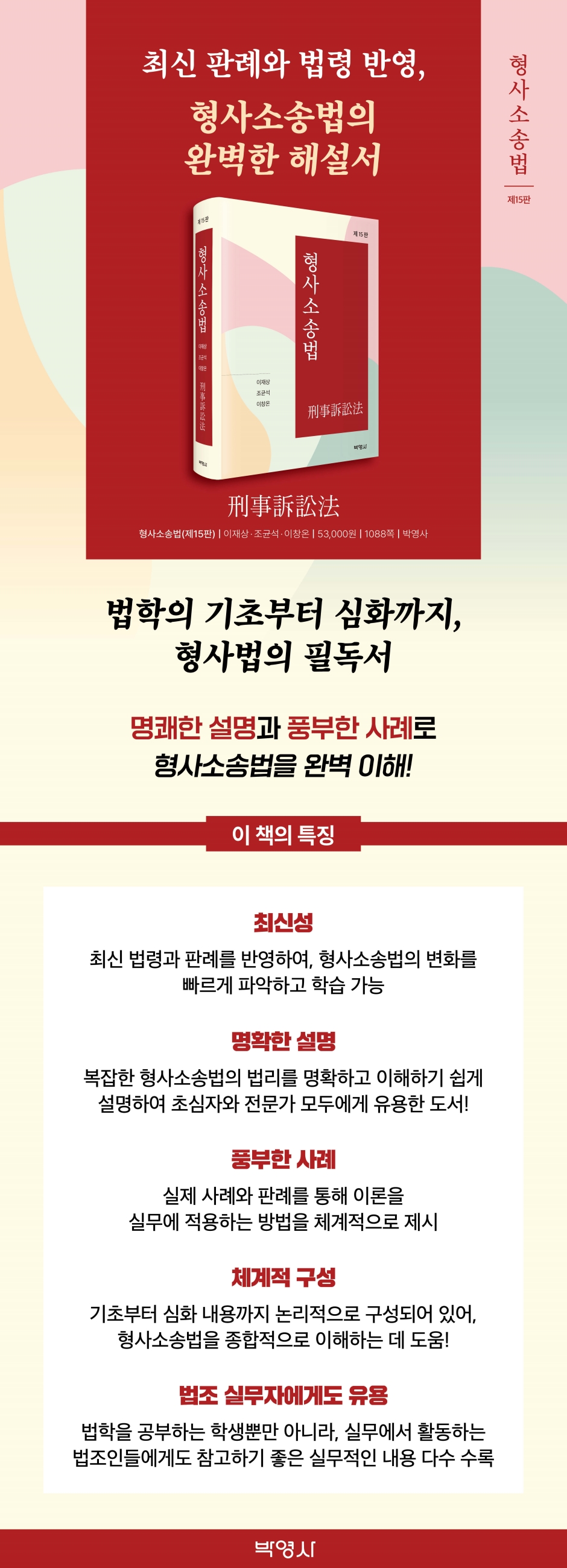 제1장 형사소송법 제1절 형사소송법의 의의와 성격 §1 Ⅰ. 형사소송법의 의의 3 1. 형사소송법의 개념 3 2. 형사절차법정주의 4 Ⅱ. 형사소송법의 성격 5 제2절 형사소송법의 법원과 적용범위 §2 Ⅰ. 형사소송법의 법원 6 1. 헌 법 6 2. 형사소송법 7 3. 대법원규칙 7 4. 대통령령과 부령 8 Ⅱ. 형사소송법의 적용범위 8 1. 장소적 적용범위 8 2. 인적 적용범위 8 3. 시간적 적용범위 9 제3절 형사소송법의 역사 §3 Ⅰ. 구미 형사소송법의 역사 10 1. 대륙법계의 형사절차 10 2. 영미의 형사절차 13 Ⅱ. 우리 형사소송법의 역사 14 1. 조선시대 이전까지의 형사절차 14 2. 구미법의 계수 14 3. 형사소송법의 개정 15 제2장 형사절차의 이념과 구조 제1절 형사절차의 지도이념 §4 Ⅰ. 형사절차의 목적과 이념 23 1. 형사절차의 목적 23 2. 이념의 상호관계 24 Ⅱ. 실체진실주의 25 1. 실체진실주의의 의의 25 2. 실체진실주의의 내용 26 3. 실체진실주의의 한계 28 Ⅲ. 적정절차의 원리 28 1. 적정절차원리의 의의 28 2. 적정절차원리의 내용 30 Ⅳ. 신속한 재판의 원칙 32 1. 신속한 재판의 의의 32 2. 재판의 신속을 위한 제도 34 3. 신속한 재판의 침해와 그 구제 38 제2절 형사절차의 구조 §5 Ⅰ. 영미법계 형사절차의 구조적 특색 41 Ⅱ. 대륙법계 형사절차의 구조적 특색 42 Ⅲ. 우리 형사절차의 구조적 특색 44 제2편 수 사 제1장 수 사 제1절 수사와 수사기관의 의의 §6 Ⅰ. 수사의 의의 49 Ⅱ. 수사기관의 의의 50 제2절 검 사 §7 Ⅰ. 검사의 의의와 가치 50 1. 검사의 의의 50 2. 검사제도의 연혁과 가치 51 Ⅱ. 검사와 검찰청 53 1. 검사의 성격 53 2. 검 찰 청 55 Ⅲ. 검사의 조직과 구조 56 1. 검사조직의 특수성 56 2. 검사동일체의 원칙 57 3. 법무부장관의 지휘·감독권 60 Ⅳ. 검사의 소송법상 지위 61 1. 비교법적 고찰 61 2. 수사권에 관한 지위 62 3. 공소권의 주체 66 4. 재판의 집행기관 68 제3절 그 밖의 수사기관 §8 Ⅰ. 사법경찰관리 69 1. 사법경찰관리의 종류 69 2. 사법경찰관리의 수사와 관할구역 70 3. 검사와 사법경찰관리의 관계 71 Ⅱ. 고위공직자범죄수사처 82 1. 고위공직자범죄수사처 설치의 의의 82 2. 수사처의 직무권한 83 3. 수사처의 구성 85 4. 수사처의 조직과 구조 86 5. 검찰청 등 다른 수사기관과의 관계 86 6. 수사처검사의 소송법상 지위 87 제4절 피의자 §9 Ⅰ. 피의자의 의의와 수사구조 88 1. 피의자의 의의 88 2. 피의자의 지위와 수사의 구조 89 3. 피의자의 방어권 91 Ⅱ. 무죄추정의 원칙 92 1. 무죄추정의 의의 92 2. 무죄추정의 원칙의 내용 93 3. 무죄추정의 원칙의 적용범위 95 Ⅲ. 피의자의 진술거부권 95 1. 서 론 95 2. 진술거부권의 내용 98 3. 진술거부권의 효과 102 제5절 수사의 조건 §10 Ⅰ. 수사의 필요성과 수사비례의 원칙 103 1. 수사의 필요성 103 2. 수사의 상당성 106 Ⅱ. 함정수사 106 1. 함정수사의 의의와 법적 성격 106 2. 함정수사와 허용범위 107 3. 위법한 함정수사의 효과 109 4. 함정수사에 의하여 수집한 증거의 증거능력 111 제6절 수사의 개시 §11 Ⅰ. 수사의 단서 111 Ⅱ. 변사자의 검시 113 Ⅲ. 불심검문 114 1. 불심검문의 의의 114 2. 불심검문의 대상 115 3. 불심검문의 방법 116 4. 소지품검사 118 5. 자동차검문 120 Ⅳ. 고 소 121 1. 고소의 의의 121 2. 고소의 절차 122 3. 고소불가분의 원칙 126 4. 고소의 취소와 포기 129 Ⅴ. 고 발 132 제7절 임의수사 §12 Ⅰ. 임의수사와 강제수사 132 1. 임의수사와 강제수사의 의의 132 2. 임의수사의 원칙과 강제수사의 규제 134 3. 임의수사의 적법성의 한계 138 4. 임의수사와 강제수사의 한계 143 Ⅱ. 임의수사의 방법 146 1. 피의자신문 146 2. 피의자 이외의 자의 조사 155 3. 사실조회 156 4. 그 밖의 임의수사 157 제2장 강제수사 제1절 체포와 구속 §13 Ⅰ. 형사소송법상의 대인적 강제처분 161 Ⅱ. 피의자의 체포 162 1. 체포의 의의 162 2. 체포영장에 의한 체포 163 3. 긴급체포 167 4. 현행범인의 체포 171 Ⅲ. 피의자의 구속 176 1. 구속의 의의와 목적 176 2. 구속의 요건 178 3. 구속의 절차 181 4. 관련문제 190 Ⅳ. 접견교통권 192 1. 접견교통권의 의의 192 2. 변호인과의 접견교통권 193 3. 변호인 아닌 자와의 접견교통권 196 4. 접견교통권의 침해에 대한 구제 197 Ⅴ. 체포·구속적부심사제도 198 1. 체포·구속적부심사제도의 의의 198 2. 비교법적 고찰 201 3. 체포·구속적부심사제도의 내용 203 4. 체포·구속적부심사제도의 개선 209 Ⅵ. 구속의 집행정지와 실효 211 1. 구속의 집행정지 211 2. 구속의 실효 212 제2절 대물적 강제수사 §14 Ⅰ. 대물적 강제수사 213 1. 대물적 강제수사의 의의 213 2. 형사소송법상 대물적 강제수사의 공통적 요건 214 Ⅱ. 압수와 수색 217 1. 압수·수색의 의의 217 2. 압수·수색의 목적물 217 3. 압수·수색의 절차 219 4. 형사소송법상 대물적 강제처분에 있어서의 영장주의의 예외 227 5. 압수물의 처리 236 6. 전자정보의 압수·수색 240 7. 통신사실 확인자료 제공요청 252 8. 전기통신의 감청 253 Ⅲ. 수사상의 검증 257 1. 수사기관의 검증 257 2. 신체검사 258 Ⅳ. 수사상의 감정유치 260 1. 감정유치의 의의 260 2. 감정유치의 대상과 요건 260 3. 감정유치의 절차 261 4. 감정유치와 구속 262 5. 감정에 필요한 처분 263 제3절 수사상의 증거보전 §15 Ⅰ. 증거보전 264 1. 증거보전의 의의 264 2. 증거