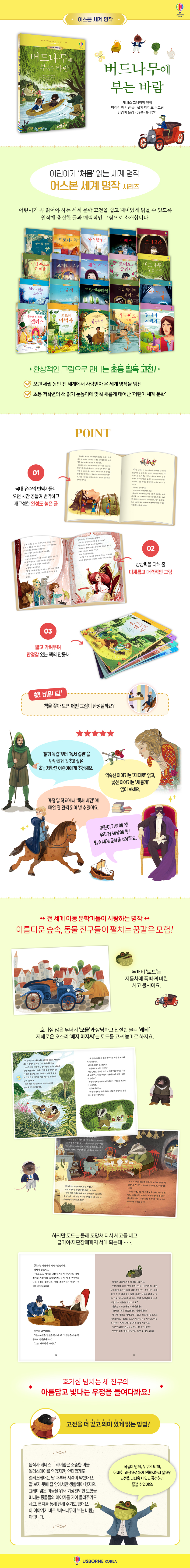 아름다운 숲속, 동물 친구들이 펼치는 꿈같은 모험! 어린이가 ‘처음’ 읽는 세계 명작 「어스본 세계 명작」 시리즈 어린이가 꼭 읽어야 하는 세계 문학 고전을 쉽고 재미있게 읽을 수 있도록, 원작에 충실한 탄탄한 글과 매력적인 그림으로 소개하는 「어스본 세계 명작」 시리즈가 출간되었어요. 오랜 세월 동안 전 세계에서 사랑받아 온 세계 명작을 엄선하여, 초등 저학년의 책 읽기 눈높이에 맞춘 ‘어린이 세계 문학’이 새롭게 태어났어요. 국내 유수의 번역자들이 오랜 시간 공들여 번역하고 재구성한 완성도 높은 글에 상상력을 더해 줄 매력적인 그림이 더해져, 어린이들이 고전에 흥미를 갖고 책 읽기의 즐거움을 느낄 수 있게 해 줄 거예요. 초등 저학년을 위한 얇고 가벼우며 안정감 있는 책의 만듦새도 특징적이에요. 읽기 독립을 준비하는 어린이부터 매일매일 탄탄한 독서 습관을 갖춰 나가는 어린이까지, 가정과 학교 등 어느 곳에서나 독서 시간을 책임져 줄 거예요. 익숙한 이야기는 제대로 읽고, 낯선 이야기는 새롭게 읽어 보세요. 시대와 공간, 세대를 초월하는 고전을 읽다 보면, 어린이들은 세상을 살아가는 이치를 자연스럽게 깨닫고 마음속 자양분을 얻고 교양을 쌓게 된답니다. 호기심 넘치는 세 친구의 아름답고 빛나는 우정 어느 봄날, 땅속에 사는 호기심 많고 착한 두더지 ‘모울’은 대청소를 하다 세상 밖에 나와 상냥하고 친절한 물쥐 ‘래티’를 만나요. 모울은 래티 덕분에 땅 위 새로운 세상을 맛보고 모험하며 따뜻하고 지혜로운 오소리 ‘배저 아저씨’를 알게 되지요. 그리고 새로운 것만 보면 빠져드는 사고뭉치 두꺼비 ‘토드’를 만나 유쾌하고도 아슬아슬한 여행을 떠나기도 해요. 그런데 토드의 사고 수준은 점점 더 심해지고, 배저 아저씨와 두 친구는 힘을 합쳐 토드를 고쳐 놓기로 해요. 토드가 마음을 고쳐먹을 때까지 집 안에 가두기로 하지만, 토드는 몰래 도망쳐 다시 사고를 내고 급기야 재판장에까지 서게 되는데……. 어린이들은 섬세하고 생생한 묘사로 펼쳐지는 아름답고 따뜻한 이야기 속에 잔잔히 녹아드는 경험을 하게 될 거예요. 마치 마음속에 작은 동물들이 사는 마을이 그대로 옮겨지는 듯하지요. 서로 다르지만 마음씨가 착한 세 친구는 이런저런 성격을 가진 어린이들의 모습을 닮아 더욱 공감이 되지요. 다정하게 들려오는 이야기는 신비롭고 환상적인 모험의 세계로 안내해 준답니다. 풍성하고 매력적인 그림으로 상상력을 더해 주는 ‘어린이 세계 문학’ 이 이야기는 100년이 넘는 세월 동안 고전 중의 고전으로 손꼽혀 오며, 전 세계의 수많은 독자들에게 사랑받고 있어요. 제목은 익히 들어 알고 있을 테지만, 제대로 내용을 알고 있는 초등 저학년 친구는 드물 거예요. 묵직한 완역본 고전을 읽어 내기 어려운 초등 저학년 친구들을 위해, 원작에 기초하여 초등 저학년의 책 읽기 수준에 맞는 분량과 번역으로 재구성했어요. 여기에 감각적인 색감을 입힌 매력적인 그림이 풍성하게 더해져 상상력의 폭을 넓혀 주고, 명작을 읽는 재미를 배가 되게 해 준답니다. 책장을 펼치면 신비롭고 아름다운 버드나무 숲이 눈앞에 펼쳐지고, 개성 넘치고 생동감 있게 표현된 토드, 모울, 래티, 배저 아저씨 등 등장인물들을 만나는 경험을 하게 될 거예요. 얇고 가볍지만 견고하고 안정감 있는 책의 판형과 만듦새도 초등 어린이를 위해 고안되었어요. 언제 어디서든 세계 명작을 즐길 수 있고, 고전을 통해 탄탄한 독서 자양분과 교양을 쌓을 수 있게 이끌어 준답니다. 명작을 깊고 의미 있게 즐기도록 안내하는 [원작자와 작품에 대하여] 원작자 케네스 그레이엄은 소중한 아들 앨러스테어를 얻었지만, 안타깝게도 앨러스테어는 날 때부터 시력이 약했어요. 잘 보지 못해 집 안에서만 생활해야 했지요. 그레이엄은 아들을 위해 기상천외한 모험을 떠나는 동물들의 이야기를 지어 들려주기도 하고, 편지를 통해 전해 주기도 했어요. 이 이야기가 바로 『버드나무에 부는 바람』이에요. 부록 [원작자와 작품에 대하여]에는 작품이 언제, 누구에 의해, 어떠한 과정으로 쓰여 전해지는지, 원작자와 작품에 대한 정보가 실려 있어요. 작품과 함께 읽으면 고전을 더 깊이 이해하고 풍성하고 의미 있게 즐길 수 있답니다. |