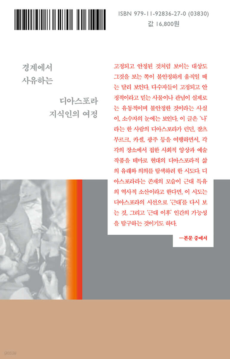 (…) 디아스포라가 고난을 당한 이유는 단적으로 말해 그들이 국가를 갖지 못한 사람들이기 때문이다. 그렇지만 거꾸로 말하면, 국가 없는 세계에 대한 희망(감히 ‘희망’이라 말해두자)을 잉태할 보편적 사상이 그들로부터 펼쳐질 수 있다는 뜻도 된다. 이것이 제2차세계대전 후의 세계에서 새롭게 태어나야 할 ‘희망’이었지만, 이 ‘희망’은 지금 크게 위협받고 있다. 전 세계의 디아스포라들은 여전히 기나긴 고난의 길을 걷는 중이다. --- p.7-9, 「개정판을 펴내며」 중에서 그런 시도를 한 이유는 프리모 레비, 파울 첼란, 장 아메리, 슈테판 츠바이크 등 이 책에서도 다룬 유럽 유대계 디아스포라 지식인들의 사색에 강하게 끌렸기 때문이다. 그들이 펼친 사상적 행위에는 유대인이라는 좁은 범위만이 아니라, 근대 이후 힘겨운 시대를 살아가는 전 세계 많은 이(여기에는 물론 우리 ‘조선 민족’도 포함되어 있다)가 숙고해야만 할 보편적인 호소와 교훈이 담겨 있다. 우리가 스스로를 보다 넓은 시야에서, 보다 긴 척도로 파악하기 위해서도 그들의 사색을 배우는 일이 필요하다. --- p.9-10, 「개정판을 펴내며」 중에서 이 책에서는 디아스포라를 이해하고자 글로 쓴 텍스트뿐 아니라, 다양한 예술 작품에도 눈을 돌렸다. 디아스포라를 더욱 깊이 이해하기 위해서는 문자로 된 텍스트에만 의거할 것이 아니라, 비문자 텍스트에 자극받은 상상력의 도움이 절실하다고 생각했던 까닭이다. 제목에 ‘기행’을 붙이고, 대상을 관찰하여 서술하는 작가 자신의 위치를 끊임없이 유동하는 상태로 두는 것, 아울러 많은 예술 작품을 참조하며, 말하자면 작품들과 대화를 통해 서술해나가는 형식을 선택한 것 또한 지금까지 이야기한 문제의식에서 비롯했다. --- p.10-11, 「개정판을 펴내며」 중에서 고정되고 안정된 것처럼 보이는 대상도 그것을 보는 쪽이 불안정하게 움직일 때는 달리 보인다. 다수자들이 고정되고 안정적이라고 믿는 사물이나 관념이 실제로는 유동적이며 불안정한 것이라는 사실이, 소수자의 눈에는 보인다. 이 글은 ‘나’라는 한 사람의 디아스포라가 런던, 잘츠부르크, 카셀, 광주 등을 여행하면서, 각각의 장소에서 접한 사회적 양상과 예술 작품을 테마로 현대의 디아스포라적 삶의 유래와 의의를 탐색하려 한 시도다. 디아스포라라는 존재의 모습이 근대 특유의 역사적 소산이라고 한다면, 이 시도는 디아스포라의 시선으로 ‘근대’를 다시 보는 것, 그리고 ‘근대 이후’ 인간의 가능성을 탐구하는 것이기도 하다. --- p.27, 「프롤로그」 중에서 |