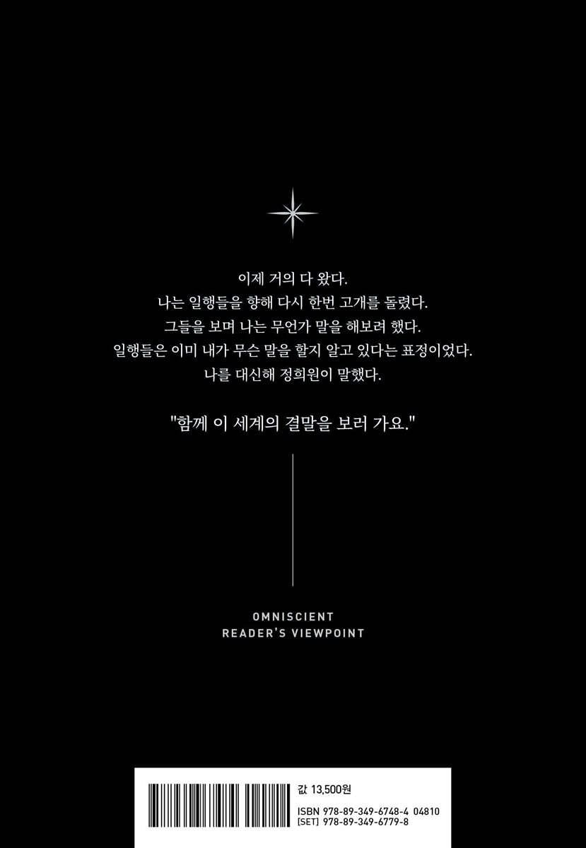 한국 웹소설의 현재 진행형 레전드, 마침내 단행본 완결! 토털 3.6억 뷰 + α, 누적 거래액 100억 원 돌파, ‘문피아’ 누적 판매 1위, ‘네이버 시리즈’ 누적 다운로드 1위, ‘네이버 웹툰’ 압도적 1위, 세계 9개 언어 번역 및 수출… 『전지적 독자 시점』의 장대하고도 거대한 이야기는 한국 웹소설계의 지형과 판도를 바꿔놓았다. 연재 종료 후 삼 년여가 지났지만, 이 작품의 파급력은 ‘현재 진행형’이라는 표현이 가장 적합하다. 2022년부터는 페이퍼백과 하드커버 두 가지 형태의 단행본으로 서점가로도 진출했고, 단기간에 누적 10만 부 이상이 판매되는 등 폭발적 호응이 쏟아졌다. 『전지적 독자 시점』은 게임회사 계약직 청년 ‘김독자’가 어느 퇴근길에 자신이 유일한 독자인 웹소설 ‘멸망에서 살아남는 세 가지 방법’이 현실화된 세계와 마주하며 시작된다. 김독자는 자신이 읽어온 내용을 지식 삼고, 실제가 되어 나타난 소설 속 등장인물과 하나둘 동료가 되어 절망적 세상과 맞서나간다. 첫 페이지부터 단번에 읽는 이를 사로잡는 스토리텔링, 시공간을 넘나들며 역사와 신화를 아우르고 우주로까지 확장되는 세계관, 누구 하나 사랑하지 않을 수 없는 생생하고 매혹적인 캐릭터까지… ‘전독시’는 그 압도적 완성도와 마력적 재미로 숱한 ‘앓이’를 양산해왔다. PART 1으로 출발, PART 2와 PART 3을 거치며 거대한 이야기의 세계를 펼쳐온 『전지적 독자 시점』이 마침내 마지막 페이지에 다다른다. 이야기의 완결이 담긴 ‘PART 4’와 ‘PART 5’는 기존과 동일한 판형으로 제작되었고, 통일성을 갖춘 디자인과 포맷으로 전집 소장의 가치도 높였다. |