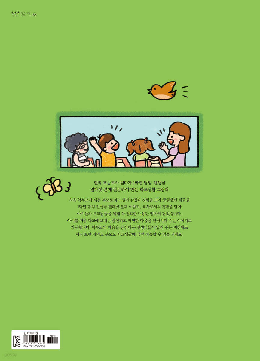 학교에 가는 아이를 둔 부모들은 주로 아이가 한글을 얼마나 잘 익혔는지, 숫자는 잘 아는지 등 학습에 관련한 것들이 많습니다. 그러나 1학년 선생님들이 얘기하는 1학년 아이들이 갖춰야 할 가장 기본은 아이 스스로 무엇을 할 수 있느냐, 기본 생활을 보호자 없이 해 나갈 수 있느냐입니다. 자기주도적인 생활 능력을 기를 수 있도록 어떻게 도와주면 될지 알아보세요. 『1학년이니까 할 수 있어요』는 아이와 부모가 함께 보는 책입니다. 그림책으로 구성한 순봉이의 하루 생활을 아이와 함께 보면서 각 장면마다 구성된 ‘이렇게 도와주세요’는 부모님이 보시면 도움을 얻을 수 있습니다. 책의 마지막에는 1학년 담임 선생님들이 학부모님께 드리는 e알림장도 있습니다. |