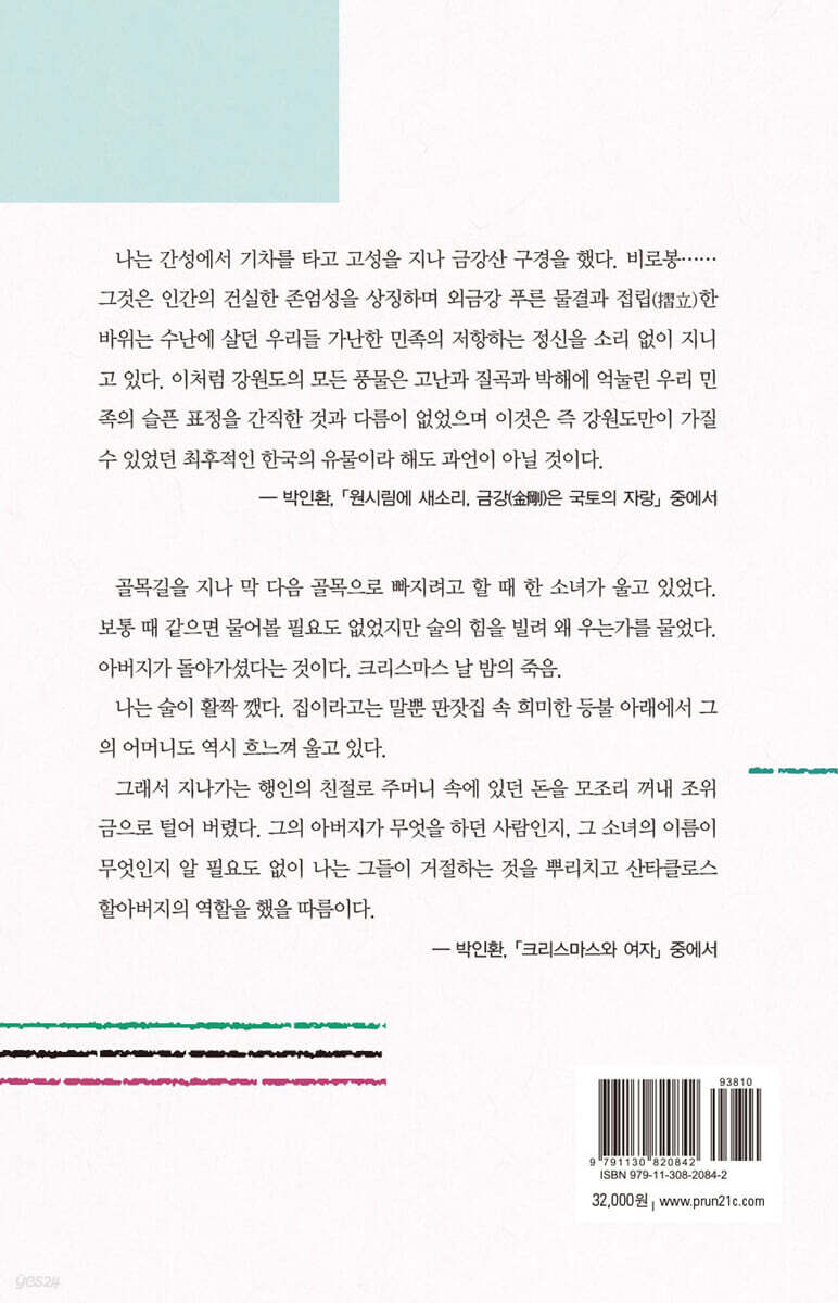 세월은 잡을 수 없고 인생은 늙었다. 나는 간성에서 기차를 타고 고성을 지나 금강산 구경을 했다. 비로봉…… 그것은 인간의 건실한 존엄성을 상징하며 외금강 푸른 물결과 접립(摺立)한 바위는 수난에 살던 우리들 가난한 민족의 저항하는 정신을 소리 없이 지니고 있다. 이처럼 강원도의 모든 풍물은 고난과 질곡과 박해에 억눌린 우리 민족의 슬픈 표정을 간직한 것과 다름이 없었으며 이것은 즉 강원도만이 가질 수 있었던 최후적인 한국의 유물이라 해도 과언이 아닐 것이다.