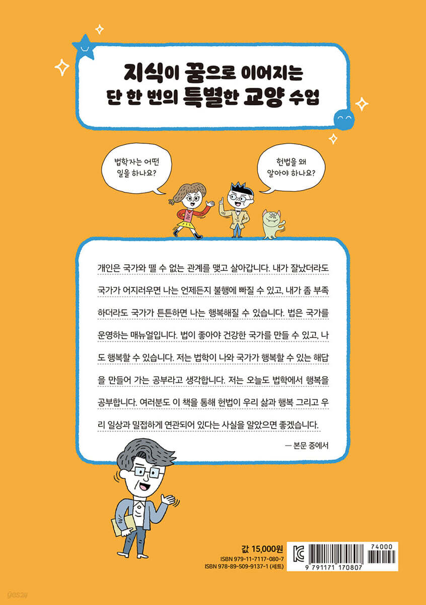 이 책을 읽는 10대에게 · 6 1장 법학자의 길 · 14 법학이란 무엇일까? 법학자가 하는 일 나는 왜 헌법을 연구하는 법학자가 되었나? 2장 법과 민주주의 · 34 두 얼굴의 법 법의 세 가지 특징 법치 국가는 어떻게 시작되었을까? 법치라고 다 같은 법치가 아니야 재미있게 법 나누는 법 3장 헌법의 역사 · 62 헌법이란 무엇일까? 국가와 개인, 그리고 헌법 국민을 지키는 슈퍼히어로, 헌법 대한민국 헌법의 역사 4장 헌법의 주요 내용 · 86 헌법의 구조와 생선 세 토막 헌법에 숨어 있는 원리를 찾아라 헌법이 정해 놓은 대한민국 국민의 권리 헌법이 정해 놓은 대한민국 국민의 의무 5장 헌법을 만들고 지키는 주요 기관 · 116 국민의 권력은 다 어디로 갔을까? 국회 대통령 법원 흑화 캐릭터를 막는 헌법 재판소 6장 헌법과 대한민국의 미래 · 142 헌법의 최대 약점 평화는 헌법을 지키고, 헌법은 평화를 지킨다 헌법은 어떤 통일을 원할까? 통일 헌법이 왜 필요할까? 우리가 만들어 가는 헌법 |