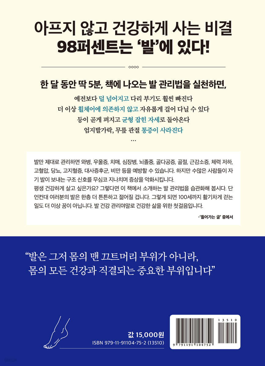 --- p.5, 「아프지 않고 100세까지 건강하게 살기 위하여」 중에서 많은 전문가들이 ‘걷기’의 중요성을 강조하곤 합니다. 하지만 이 말이 통증이 심하게 느껴지는데도 무리하게 걸으라는 뜻은 아닙니다. 많이 걸을수록 건강 효과가 정비례하게 나타나지는 않습니다. 사람에 따라서는 8,000걸음 이상 걸으면 관절이 상하는 등 오히려 역효과가 나타나는 경우도 있습니다. 결국 자기 몸 상태를 고려해 자신에게 맞는 걸음 수를 찾는 게 더 중요합니다. --- p.53, 「발목이 굳으면 생기는 악순환」 중에서 발이 보내는 신호들은 평소 세심히 신경 쓰지 않으면 그냥 지나치기 쉽습니다. 대부분 발의 노화가 자신도 모르는 사이에 진행되는 이유가 여기에 있습니다. 그러므로 발이 보내는 구조 신호들을 평소 민감하게 파악해야 합니다. 이와 더불어 발 건강을 유지하고 수명을 늘리는 관리를 습관화할 필요가 있습니다. --- p.56, 「발에도 심근경색이 생긴다」 중에서 흔히 ‘종아리는 제2의 심장이다’라는 말이 있습니다. 동맥이 혈액을 몸 구석구석으로 내보내는 역할을 한다면, 정맥은 혈액을 심장으로 돌려보내는 역할을 합니다. 이때 동맥에서는 심장의 펌프 작용으로 혈액을 내보내지만, 정맥에서는 종아리 근육의 펌프 작용으로 혈액을 밀어 올립니다. --- p.68, 「제2의 심장 종아리를 지켜라」 중에서 나이가 들면 먼 거리까지 걷기 힘들어지고, 여기저기 통증이 느껴지는 등 발의 불편함을 느끼는 사람들이 부쩍 늘어납니다. 그렇다고 ‘이제 나이가 들어서 어쩔 수 없다’, ‘어차피 낫기 어렵다’라며 포기하지 않기를 바랍니다. 발은 노력하기에 따라 얼마든지 젊어지고 건강해질 수 있습니다. --- p.81, 「하루 5분으로 젊은 발 만들기」 중에서 발의 통증이 심각한 질병과 밀접한 연관이 있다면, 조기에 치료하는 게 무엇보다 중요합니다. 발에 증상이 나타나는 질병 중에 대표적으로 당뇨병이 있지요. 만일 이를 방치하고 치료 시기를 놓쳤다간 영영 다리를 잃을지도 모릅니다. ’아프지 않으니 괜찮겠지‘, ‘이 정도면 참을 만하니 더 심각해지면 그때 병원에 가 보자’라는 안일한 생각이 자칫 큰 화를 자초할 수 있습니다. --- p.150, 「발은 우리 몸 전체의 건강과 직결된다」 중에서 |