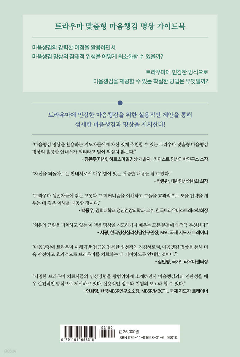 “마음챙김 명상을 활용하는 지도자들에게 자신 있게 추천할 수 있는 트라우마 맞춤형 마음챙김 명상의 훌륭한 안내서가 되리라고 믿어 의심치 않는다.” - 김완두(미산) (하트스마일명상 개발자, 카이스트 명상과학연구소 소장)