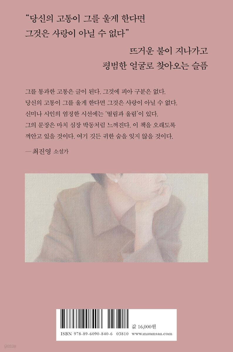 그를 통과한 고통은 글이 된다. 그것에 피아 구분은 없다. 당신의 고통이 그를 울게 한다면 그것은 사랑이 아닐 수 없다. 신미나 시인의 엄정한 시선에는 ‘떨림과 울림’이 있다. 그의 문장은 마치 심장 박동처럼 느껴진다. 이 책을 오래도록 껴안고 있을 것이다. 여기 깃든 귀한 숨을 잊지 않을 것이다. - 최진영 (소설가)