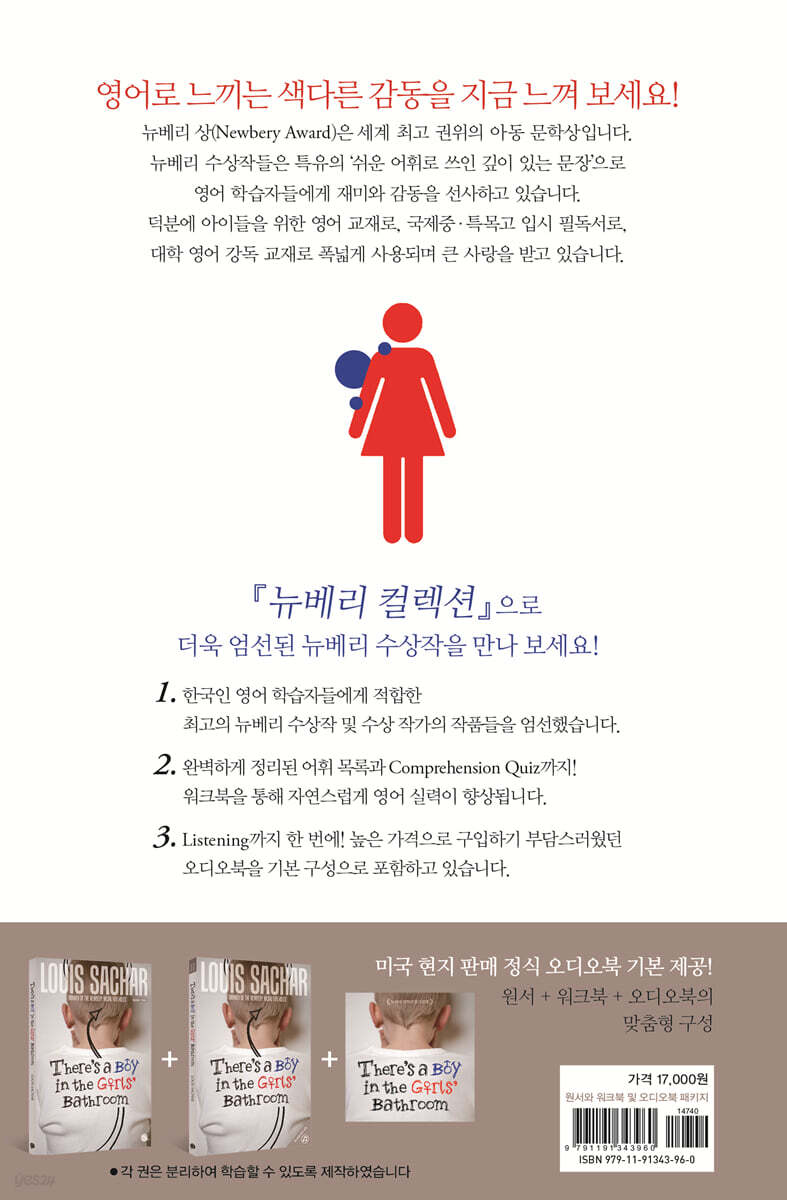 뉴베리 상(Newbery Award)은 미국 도서관 협회에서 해마다 미국 아동 문학 발전에 가장 크게 이바지한 작가에게 수여하는 아동 문학상입니다. 1922년에 시작된 이 상은 ‘아동도서계의 노벨상’이라 불릴 만큼 최고의 권위와 역사를 자랑하고 있습니다. 그 역사와 권위만큼이나 심사기준이 까다롭기로 유명한데, 심사단은 책의 주제의식은 물론 정보의 깊이와 스토리의 정교함, 캐릭터와 문체의 적정성 등을 꼼꼼히 평가하여 수상작을 결정합니다. 롱테일북스에서 출간되는 「뉴베리 컬렉션」은 뉴베리 수상작, 그리고 뉴베리 수상 작가의 유명 작품들을 엄선하여 한국 영어 학습자들을 위한 최적의 교재로 재탄생시킨 영어원서 읽기 시리즈입니다. 줄거리 소개 브래들리(Bradley)는 숙제도 하지 않고 시험에서는 늘 F를 받는, 학교에서 알아주는 문제아입니다. 그는 틈만 나면 거짓말을 하고 문제를 일으킵니다. 친구들은 물론 선생님들조차 그를 싫어하며 그에게 가까이 가려 하지 않습니다. 그런 그에게 학교에 새로 전근 온 카운슬러 칼라(Carla)가 다가옵니다. 브래들리는 처음에 칼라와의 상담을 거부하지만 점차 그녀에게 마음을 열게 됩니다. 모두가 싫어하고 모두를 싫어하는 문제아 브래들리는 이렇게 조금씩 세상과 소통하는 방법, 그리고 자기 자신을 사랑하게 되는 방법을 배워갑니다. 이 책의 구성 「뉴베리 컬렉션」은 뉴베리 수상작, 그리고 뉴베리 수상 작가의 유명 작품들을 엄선하여 한국 영어 학습자들을 위한 최적의 교재로 재탄생시킨 영어원서 시리즈입니다. 1. 어휘 수준과 문장의 난이도, 분량 등 국내 영어 학습자들에게 적합한 정도를 종합적으로 검토하여 선정하였습니다. 2. 기존 원서 독자층 사이의 인기도까지 감안하여 최적의 작품들을 선별하였습니다. 3. 판형이 좁고 글씨가 작아 읽기 힘들었던 원서 디자인을 대폭 수정하여, 판형을 시원하게 키우고 읽기에 최적화된 영문 서체를 사용하여 가독성을 극대화하였습니다. 4. 함께 제공되는 워크북은 어려운 어휘를 완벽하게 정리하고 이해력을 점검하는 퀴즈를 덧붙여 독자들이 원서를 보다 쉽고 재미있게 읽을 수 있도록 구성하였습니다. 5. 기존에 높은 가격에 판매되어 구입하기 부담스러웠던 오디오북까지 부록으로 제공하여 리스닝과 소리 내어 읽기에까지 원서를 두루 활용할 수 있도록 했습니다. 출판사 책 소개 롱테일북스의 「뉴베리 컬렉션」으로 출간된 이 책은, 19개의 문학상을 받은 『There’s a Boy in the Girls Bathroom』을 영어 학습 목적에 맞게 재탄생 시킨 ‘맞춤형 원서’입니다. - ‘원서’와 함께 정리된 핵심 어휘와 퀴즈가 담긴 ‘워크북’이 분권으로 제공됩니다. - 완벽하게 정리된 워크북의 단어장을 통해 사전 없이 원서를 수월하게 읽을 수 있습니다. - 원서 본문에는 단어장에 나온 어휘들이 볼드 처리되어 있어 문맥에 따른 자연스러운 어휘 암기 효과를 얻을 수 있습니다. - 최대한 직역에 가까운 한국어 번역이 담겨 있어 영어원서를 읽다가 이해가 되지 않는 부분을 쉽게 확인할 수 있습니다. - 미국 현지에서 판매되고 있는 정식 오디오북이 기본 포함되어 있어 리스닝 실력까지 함께 향상시킬 수 있습니다. 이런 독자들에게 강력 추천합니다. - 국제중·특목고 입학을 준비하는 초·중학생 - 쉽고 재미있는 원서를 찾고 있는 영어 학습자 - 영어원서 읽기에 부담을 가지고 있던 학습자 - 뉴베리 수상작에 입문하려는 영어원서 독자 |