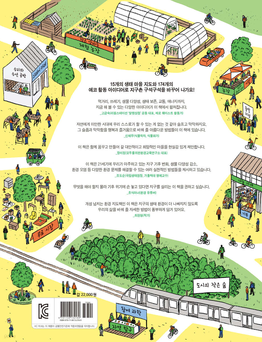 그곳을 친환경 세상으로 바꿔 나가는 개성 넘치는 환경 지도책 지구가 뜨거워지고 환경 생태계가 바뀌면서 생물들이 사라지거나 생물들의 서식지가 바뀌는 이상 현상이 나타나고 있어요. 인간들의 세상 역시 이에 큰 영향을 받고 있지요. 이 위기의 시대에 기후 변화, 기후 정의, 환경 오염, 친환경, 업사이클과 같은 말은 요즘 큰 관심을 받는 단어예요. 그럼에도 쓰레기는 끊임없이 버려지고 자원 개발을 위해 산림이 파괴되며 땅과 바다와 하늘의 심각한 오염 문제 등은 이어지고 있어요. 이제 사람들은 지금 당장 환경을 위해 움직여야 해요. 《지구를 살리는 생태 환경 활동 대백과》는 이를 위해 준비된 멋진 환경 지도책이랍니다. - 가상의 마을 지도로 꾸민 환경 지도책 《지구를 살리는 생태 환경 활동 대백과》는 친환경을 실천하는 사람들이 만들어 가는 가상의 마을 15곳을 한 권에 담은 책이에요. 이 마을들은 어떤 모습일까요? 마을에는 이미 오염된 곳도 있고 깨끗해진 곳도 있어요. 15곳의 마을은 에코 시민이 적극적으로 활동해 만든 환경친화적인 장소로 바뀐 곳이에요. 그래서 독자 여러분이 에코 시민이 되기 위해 꼭 알아야 할 친환경 활동법을 15곳 마을에 소개해 놓았답니다. 오염에서 벗어나 환경 마을로 거듭나는 현장을 지도로 만나 보세요. - 환경 위기의 시대, 에코 시민이 되는 법 가상의 마을 15곳에서 펼쳐지는 친환경 활동법들은 무엇이 있을까요? 도시 텃밭부터 도시 양봉, 미니 베란다 정원, 친환경 에너지 주택 등 재치 있는 환경 아이디어들이 여러분을 마을 곳곳으로 안내한답니다. 책에서 소개하는 이와 같은 활동들은 환경 위기의 이 시대에 필요한 활동들이에요. 환경을 위해 할 수 있는 실천법들은 여러분의 주변을 환경친화적인 곳으로 바꾸어 줘요. 마을 15곳에서 펼쳐지는 174개의 에코 아이디어들은 세상과 사람들을 바꿀 수 있는 주문과도 같답니다. - 언제, 어디에서나 실천할 수 있는 친환경 아이디어 174개나 되는 환경 아이디어라니. 막상 실천하기에 엄두가 나지 않을 듯하다고요? 마을 15곳에서 펼쳐지는 환경 아이디어들은 환경 단체들과 환경 활동가들이 실천하는 익숙한 내용이에요. 또 한 사람이 어렵지 않게 실천할 수 있는 친환경 아이디어이기도 하지요. 174개 아이디어에는 크고 작은 캠페인이나 실천법이 고루 있어요. 이를 작은 것부터 큰 것까지 순차적으로 하나하나 도전하면 어려움 없이 실천해 나갈 수 있어요. 이를테면 주변의 자연 돌아보기부터 시작해 탈것을 친환경으로 바꾸어 나가고요. 또 쏟아져 나오는 쓰레기를 줄이고자 다른 사람들과 물건을 나누고 고쳐 쓰는 방법의 정보를 찾아 따라 할 수 있어요. 독자 여러분의 먹거리에서도 멋진 친환경 아이디어들이 많답니다. 낭비 없이 음식을 즐기는 법과 친환경 먹거리를 사 오고 먹는 방법도 소개하지요. 여러분이 사는 집을 친환경으로 바꾸어 나가는 활동도 흥미로울 거예요. 마지막으로 더 많은 사람과 함께 여는 환경 캠페인이나 에코 시민으로서 친환경을 더 널리 알리는 여러 가지 아이디어를 직접 확인해 보세요. |