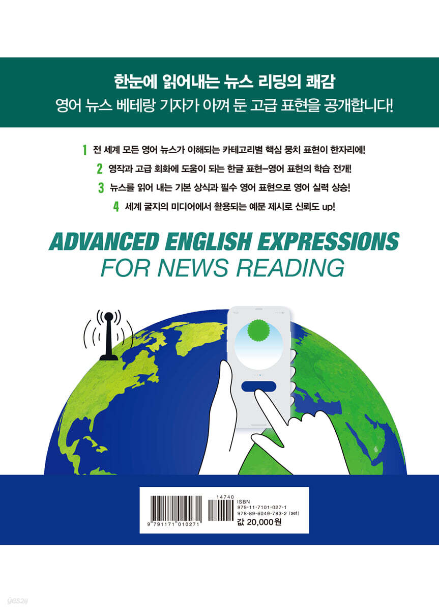 1. 한 권에 집적한 뉴스 영어 빈출 고급 표현들 늘 새로울 것 같지만 뉴스는 반복됩니다. 정부 관료들의 부정부패, 경제와 스포츠 현안 등이 구체적인 수치와 내용만 달라질 뿐 기본 구조와 흐름은 같기 때문입니다. 이렇게 반복되는 기사에 쓰이는 빈출 표현을 확실히 익혀야 뉴스가 한눈에 이해됩니다. 『뉴스 영어의 결정적 심화 표현들』은 어느 분야의 기사를 읽더라도 막히지 않는 뉴스 리딩을 위해 최고 수준의 뉴스 표현을 선별했습니다. 2. 영어 뉴스 베테랑 기자가 공개하는 초특급 고급 표현들 뉴스 빈출 표현이 어떤 것인지는 기자가 가장 잘 압니다. 23년 경력의 베테랑 영어 기자가 카테고리별로 가장 많이 쓰이는 최고 수준의 뉴스 표현을 공개합니다. 표현의 유래와 정의, 용례를 상세히 설명하고, 기본 상식을 더해 장기 기억을 돕습니다. 한글 표현-영어 표현의 학습 전개로 고급 회화에 도움이 되게 하고, 세계 굴지의 미디어에서 활용되는 예문 제시로 표현의 신뢰도를 높입니다. 3. 고급 회화에서 더 빛나는 뉴스 영어 표현들 뉴스 용어를 써서 대화하는 것은 해당 언어에서 최고 수준의 고급 회화입니다. 뉴스에서는 가장 정제된, 그러면서도 피부에 와닿는 표현을 사용하여 내용을 전하기 때문입니다. 원어민들과 세계 정세와 자국 상황에 관해 이야기할 때, 『뉴스 영어의 결정적 심화 표현들』에 나온 표현을 써 보세요. 굉장히 정제된 표현들이라 회화에서 활용할 때 지적이고 고급스러운 느낌을 줍니다. 실생활에서 고급 영어를 구사하고자 하는 분들에게 뉴스 영어 심화 표현을 강력 추천합니다. |