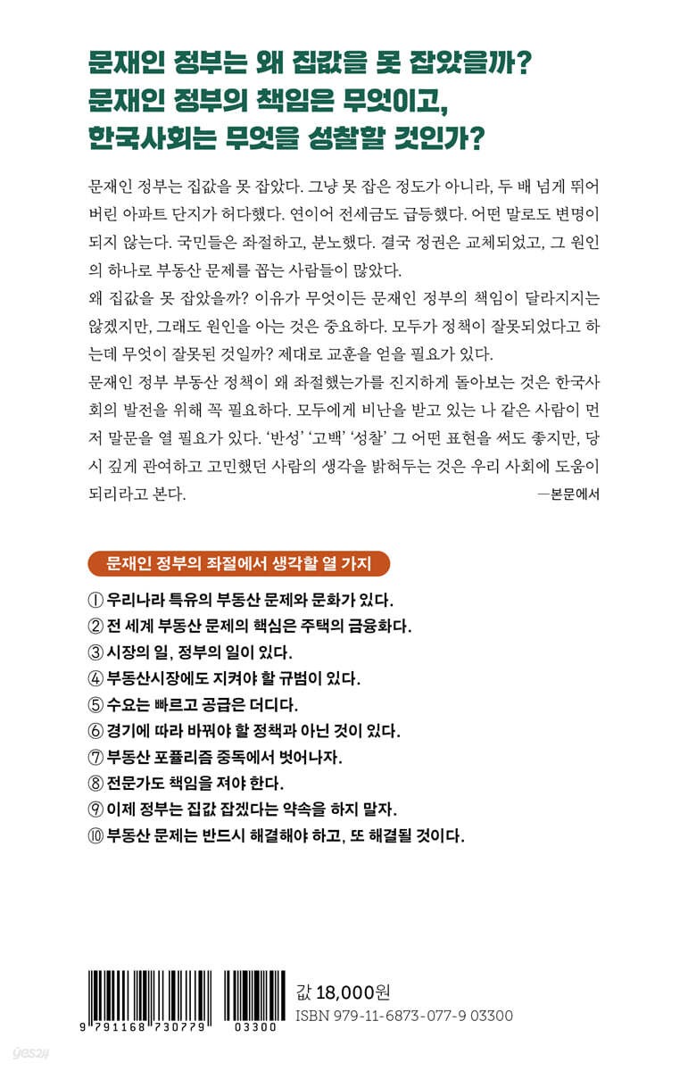 문재인 정부의 부동산 좌절, 책임과 성찰을 위해 문재인 정부가 집값을 잡지 못한 이유 | 건강한 토론과 논쟁을 위해 | 부동산과 정치, 부정하고 싶은 현실 1부 문재인 정부의 부동산 정책 좌절 1장 부동산에 어떤 일이 일어났나? : 집값 폭등과 국민들의 분노 집값이 두 배나 올랐다 * 더 들여다보기: 정부도 못 믿는 부동산 통계? 28번의 크고 작은 부동산 대책 집값 폭등이 남긴 분열과 상처 2장 문재인 정부는 왜 집값을 못 잡았나? : 무능 혹은 역부족? 어려운 상황이었다 문재인 정부, 무능 혹은 역부족? 고의론 | 무능론 | 역부족론 | 어려운 상황이었지만 더 잘했더라면… * 더 들여다보기: 공급 부족론과 다주택자 악마화 문재인 정부의 네 가지 책임 부동산 대출을 더 강하게 억제했어야 했다 | 공급 불안 심리를 조기에 진정시키지 못했다 | 부동산 규제의 신뢰를 잃었다 | 정책 리더십이 흔들렸다 이런 일을 다시 겪지 않으려면 * 더 들여다보기: 나의 잘못과 책임 2부. 부동산 문제, 제대로 보자 3장 속절없이 되풀이되는 부동산 문제 : 왜 집값은 오르고 내리기를 반복할까? 또 같은 일을 겪었다 지난 30년간 전 세계는 세 번의 파동을 겪는 중 공포: 포모와 풉 사이 집값이 오르내리는 구조 * 더 들여다보기: 집값, 공급 때문인가, 금리 때문인가? 4장 부동산을 시장에 맡겨라? : 그러나 책임은 정부가 져라 시장, 시장, 시장! 선동의 무기가 된 ‘반시장론’ 정부는 왜 거짓말을 할까? * 더 들여다보기: 이념에 따라 부동산 정책을 한다? NO 5장 규제만 하고 공급은 안 했다? : 공급 부족인가, 과잉 수요인가? 공급이 모자라 집값이 올랐다? 도심 공급을 제대로 늘리는 방법 미리 택지를 비축해둘 수는 없을까? “집은 빵이 아니다”, 공급 부족론에서 생각할 것들 6장 모두가 불만인 부동산 세금 : 높아서 문제였나, 낮아서 문제였나? 세금으로 집값 잡을 수 있나, 없나? 보유세 정치의 원조는 박정희 대통령 * 더 들여다보기: 여전히 종합부동산세가 필요한 이유 보유세 포퓰리즘 * 더 들여다보기: 국토보유세와 기본소득 피하면 그만인 양도세 부동산 세금, 가장 큰 문제는 신뢰 상실 7장 금융이 핵심인 이유 : 돈이 넘치면 집값은 오른다 집값과 돈값은 반대로 움직인다 코로나19가 불러온 집값 후폭풍 한국도 같은 길을 걸었다 경기 방어를 위해 부동산을 방치했나? * 더 들여다보기: 그때도 금리가 주인공이었다 * 더 들여다보기: 집값 급등기, 선거 국면에서 대출 규제 풀라고 했던 주장들 8장 다주택자의 두 얼굴 : 원흉인가 희생양인가? 민간임대사업자가 집값을 올렸다? 불투명한 임대시장 개혁과 내가 져야 할 책임 모두가 내 집에 살 수는 없다 다주택자와 공존하는 방법 * 더 들여다보기: 빌라왕과 전세사기 9장 ‘반값 아파트’라는 환상 : 마약 같은 부동산 포퓰리즘 더 많이, 더 싸게 공짜는 없다 포퓰리즘의 끝판왕, 반값 아파트 꿈의 주택 정책은 없다 10장 이제 공공임대주택은 더 필요 없나? : 임대보다 내 집을 갖고 싶은 청년들 공공임대인가, 분양주택인가? 집값이 불안할수록 공공임대주택 실제로는 5.5%밖에 안 되는 공공임대주택 11장 주택의 금융화와 투자 상품화 : 전 세계가 같은 문제를 겪고 있다 문제를 이해하는 화두, 주택의 금융화 임대로 살 수밖에 없는 세대 VS 임대업자 세대 주택의 금융화에 대안은 있는가? * 더 들여다보기: 세대가 문제인가, 계층이 문제인가? 전세대출, 집값 상승의 불쏘시개 3부. 어떻게 할 것인가? 12장 부동산 포퓰리즘의 나라 : 평등주의, 선정주의, 낭만주의를 넘어서 한국 부동산 문제의 숙명, 가족주의와 평등주의 부동산 정책을 망쳐온 포퓰리즘 물량 포퓰리즘 | 반값 아파트 포퓰리즘 | 세금 포퓰리즘 “이것만 하면 된다”는 만능 키는 없다 시장 만능주의 | 보유세 만능주의 | 원가 공개 만능주의 | 난무하는 낭만주의, 이상주의, 선동주의 * 더 들여다보기: 집값 예측은 가능한가? 13장 문재인 정부의 좌절에서 생각할 것들 : 다시 이런 일을 겪지 않으려면 배우고 성찰해야 할 것들 문재인 정부의 좌절에서 생각할 열 가지 우리나라 특유의 부동산 문제와 문화가 있다 | 전 세계 부동산 문제의 핵심은 주택의 금융화다 | 시장의 일, 정부의 일이 있다 | 부동산시장에도 지켜야 할 규범이 있다 | 수요는 빠르고 공급은 더디다 | 경기에 따라 바꿔야 할 정책과 아닌 것이 있다 | 부동산 포퓰리즘 중독에서 벗어나자 | 전문가도 책임을 져야 한다 | 이제 정부는 집값 잡겠다는 약속을 하지 말자 | 반드시 해결해야 하고, 또 해결될 것이다 참고문헌 |