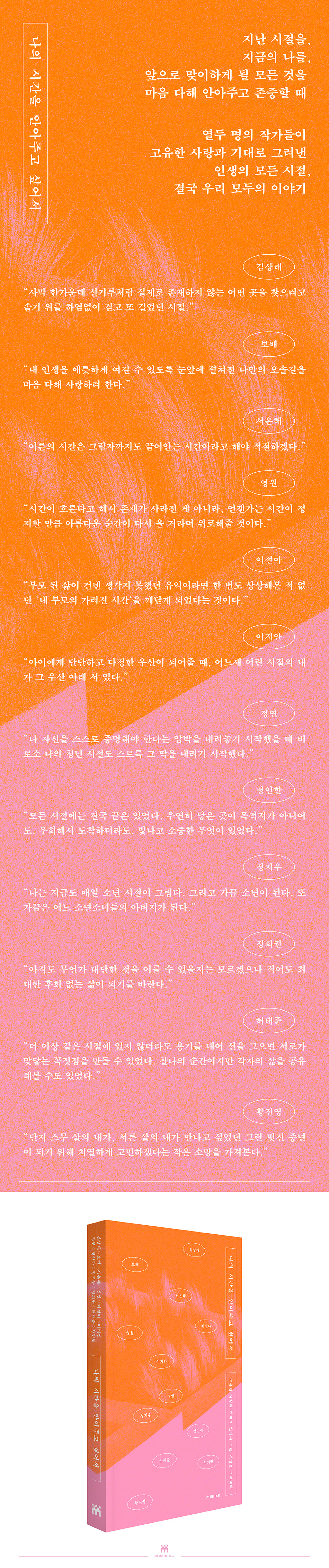 단 한 번의 삶을 온전하게, 가치 있게 사랑하기 위하여인생의 모든 시절을 그려내다하루하루를 살아내는 것만으로도 벅차게 느껴지지만, 한 번쯤은 내가 지금 어디에 서 있는지, 어떤 방향으로 향하고 있는지 알아차려보는 것도 필요하지 않을까. 희미해지고 있는 어제의 기억들 또는 아직 오지 않은 날들에 대한 기대 사이를 천천히 오가다 보면 단 한 번뿐인 내 삶의 궤적과 윤곽을 나름대로 이해할 수 있지 않을까. 1999년생 대학생부터 1970년생 게임회사 대표까지, 변호사, 카페 사장, 사회복지사, 임상심리전문가, 칼럼니스트 등 나이도, 하는 일도, 경험도 다양한 열두 명의 작가들이 ‘인생의 모든 시절’을 담아낸 책 『나의 시간을 안아주고 싶어서』가 멜라이트에서 출간되었다. 특정한 주제로 여러 작가들의 글을 모은 에세이 앤솔러지는 드물지 않지만, 이 책은 조금 특별한 방식으로 완성되었다. ‘인생의 모든 시절 프로젝트’라는 이름으로 모인 열두 명의 작가들은 유년 시절을, 청년 또는 중년이라는 오늘의 모습을, 그리고 언제인가 맞이할 노년을 성찰한 서로의 모든 글을 읽고 조언하고 격려하는 과정을 치열하게 오랫동안 거쳤다. 각자의 고유한 사랑과 기대, 상처와 치유의 서사를 또렷하고 진솔하게 그려낸 서른여섯 편의 글들은 단지 한 개인의 삶을 기록한 것을 넘어서 지금 현재를 살아가는 우리 모두의 이야기로 확장된다. 독자들 역시 이 글들에 비추어 자신의 ‘시절들’을 돌아보고 상상하는 뜻깊은 경험을 하게 될 것이다.『나의 시간을 안아주고 싶어서』는 우리 인생의 모든 시절을 담은 책이다. 한 사람의 일생을 담아내는 자서전과는 달리, 총 열두 명의 작가가 저마다의 자리에서 인생의 모든 시절을 이야기하고자 했다. 누군가는 여전히 치열한 청춘의 한가운데서, 누군가는 중년에 이르러 가는 시점에서, 누군가는 이제 노년에 다가가는 마음으로, 인생의 모든 시절을 이야기했다. 열두 명의 작가들이 펼쳐놓은 ‘모든 시절’의 이야기를 듣고 있노라면, 누구든 자신의 ‘모든 시절’에 대한 이야기로 자연스레 젖어 들어가게 될 것이다. - 프롤로그 중에서세상에서 가장 큰 하늘을 바라보며 자라다1부 〈세상에서 가장 큰 하늘〉에서는 작가들 각자가 따뜻하면서도 아련하게 또는 저릿한 감정으로 꺼내본 유소년 시절 추억과 경험을 만날 수 있다. 보배 작가의 〈저장된 기억의 조각들〉에는 자연 속에서 건강하게 뛰어놀고 가족뿐만 아니라 이웃들의 사랑과 배려를 마음껏 받으며 자랐던 흐뭇한 추억이 가득하다. 작가는 이때의 ‘반짝거리는 고유한 경험 조각들’이 어른이 된 지금 든든한 버팀목이자 힘이 된다고 털어놓는다. 황진영 작가는 〈엄마에게 하고 싶었던 말〉에서 감정을 다른 각도에서 볼 수 있도록 돕는 ‘자비 명상’을 통해 ‘초등학교 1학년의 나’를 만나본 경험을 털어놓는다. 이제는 자신이 엄마가 된 지금, ‘착한 아이 콤플렉스’와 엄마에 대한 ‘양가감정’을 들여다보고 어린 시절의 ‘내가 지고 있던 마음의 무게’가 가벼워짐을 느낀다.〈내가 간절히 듣고 싶었던 질문〉에서 이지안 작가 역시, ‘내 마음을 살피고 물어봐주는 어른’이 간절히 필요했던 어린 시절을 떠올리며 이제는 자신이 ‘아이에게 가까운 어른’, 눈을 맞추며 아이가 듣고 싶어 하는 것을 물어주는 어른으로 살아가겠다고 다짐한다.〈나는 소년이었던 때가 매일 그립다〉에서 정지우 작가는 ‘안겨 있었기 때문에’, 즉 안전하게 보호받으며 자유롭게 모험할 수 있었던 소년이었던 때를 그리워하기도 한다고 고백한다. 그리고 이제는 약한 존재를 보호해야 하는 어른이 된 지금, ‘서로에게 소년을 돌려’주는 삶의 방식을 제안하고 있다.시간의 모퉁이를 돌아서 만난 지금의 나2부 〈시간의 모퉁이를 돌아〉에는 청년의 오늘, 중년이 되어 조심스럽게 돌아보는 지난 청년 시절의 이야기 그리고 중년이 된 소회 등이 다채롭게 담겨 있다. 〈그 시절의 배경음악〉에서 정인한 작가는 꿈과 성취만이 청춘의 모든 것이라고 믿었지만 녹록치 않았던 스물세 살의 어느 날들을 담담하게 추억하며, 불안과 불확실성의 어두운 터널을 통과한 후 다다른 곳 역시 그렇게 나쁘지만은 않았다고 말한다.서은혜 작가는 〈어른의 시간〉을 통해, ‘장애를 가진 부모 사이에서 비장애인으로 나고 자라며’ 경험한 가난과 결핍, 그리고 복잡한 감정들과 싸우는 데 골몰했던 청년 시절을 지나 깨닫게 된 지금의 모습을 이야기한다. 어른이 된 지금, 자신의 언어로 감각해나가며 ‘그림자까지도 끌어안는’ 시간에 서 있는 것이다.이설아 작가는 〈부모로 빚어지는 시간〉에서 중년의 부모가 되어 깨닫게 된 ‘내 부모의 가려진 시간’을 말한다. 세 아이를 입양하고 양육하는 가운데, 자녀를 위해 가장 낮은 자리로 내려가고 자신의 방식으로 사랑했던 부모님의 모습을 발견했고, 아이와 부모가 서로 영향을 주고받으며 어른으로 빚어짐을 알게 되었다고 고백한다.〈사막에 두고 온 것〉에서 정희권 작가는 오래전 호주에서 보냈던 한 시절을 소환한다. 서툴고 미성숙했던 청년이 경험한 짧지만 강렬했