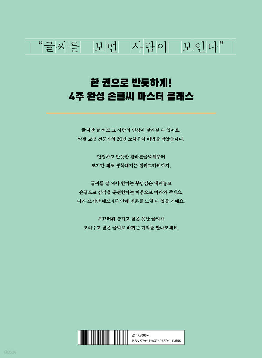 악필 완벽 교정을 위한 책 200% 활용법 INTRO. 글씨 교정의 첫걸음, 악필 진단 악필 때문에 속상해요! 손글씨가 나의 인상을 결정해요 당신의 글씨는 어떤가요? 글씨를 못 쓰는 3가지 원인 잘못된 손의 모양과 힘에 따른 악필 교정법 PART 1. 손글씨, 바르고 예쁘게 쓰고 싶다면 : 반듯하고 가독성 좋은 글씨를 쓰기 위한 키포인트 5가지 바른 자세에서 바른 글씨가 나온다 연필을 제대로 잡아야 손의 힘을 컨트롤할 수 있다 글자 모양새를 의식하며 쓴다 연습은 큰 글씨부터 작은 글씨로 기초부터 탄탄히! 선 긋는 연습부터 └ 가로선 & 세로선 긋기 │ 사선 긋기 │ 곡선 긋기 PART 2. 차근차근, 기본을 탄탄히 쌓는 글자 형태 연습 : 처음 글씨 쓰는 법을 배우는 것처럼 글자 형태 습득하기 정확하게, 자음 쓰기 반듯하게, 모음 쓰기 글자 모양 생각하며, 한 글자 쓰기 └ 세로 구조(◁) 따라 쓰기 │ 가로 구조(△, ◇) 따라 쓰기 │ 쌍자음·겹받침 들어간 글자 따라 쓰기 PART 3. 또박또박, 글씨가 단정해지는 글자 연습 : 다양한 형태의 단어를 따라 쓰며 글자 모양 바로잡기 받침 없는 단어 쓰기 └ 세로형(◁) 단어 쓰기 │ 가로형(△, ◇) 단어 쓰기 │ 혼합형(◁, △, ◇) 단어 쓰기 │ 이중 모음 단어 쓰기 │ 복합 모음 단어 쓰기 받침 있는 단어 쓰기 └ 세모형(◁) 구조 단어 쓰기 │ 마름모형(◇) 구조 단어 쓰기 │ 받침이 모두 들어간 세모형(◁) 구조 단어 쓰기 │ 받침이 모두 들어간 마름모형(◇) 구조 단어 쓰기 │ 세로 모음과 가로 모음으로 이루어진 받침 단어 쓰기 │ 복합 모음으로 이루어진 받침 단어 쓰기 바른 맞춤법 익히기 └ 자주 틀리는 맞춤법 │ 자주 틀리는 외래어 │ 헷갈리기 쉬운 단어 PART 4. 가지런히, 술술 써지는 문장 연습 : 리듬감 있고 가독성 높은 문장을 쓰기 위한 스킬 익히기 일정한 크기와 높이로, 문장 쓰기 └ 고사성어 따라 쓰기 명확하게, 단어 띄어쓰기 └ 명언 따라 쓰기 부드럽고 빠르게, 줄 바꿔 쓰기 └ 연설 따라 쓰기 │ 상식 문장 따라 쓰기 PART 5. 보기만 해도 행복해지는 캘리그라피 연습 멋을 더해 더욱 특별한, 캘리서체 쓰기 └ 마음을 전하고 싶은 글씨체 │ 사랑스러울 정도로 탐나는 글씨체 │ 재미있는 글씨체 │ 자꾸 쓰고 싶은 글씨체 PART 6. 자신 있게 쓰는 생활 속 다양한 손글씨 숫자 & 알파벳 연습 └ 숫자 쓰기 │ 알파벳 쓰기 │ 영어 단어 쓰기 │ 영어 문장 쓰기 일상생활 속 글씨 연습 └ 편지 봉투 │ 전화 메모 & 업무 메모 │ 다이어리 & 오늘 할 일 리스트 │ 생일 카드 & 축하 카드 부록. 글씨 연습장 |