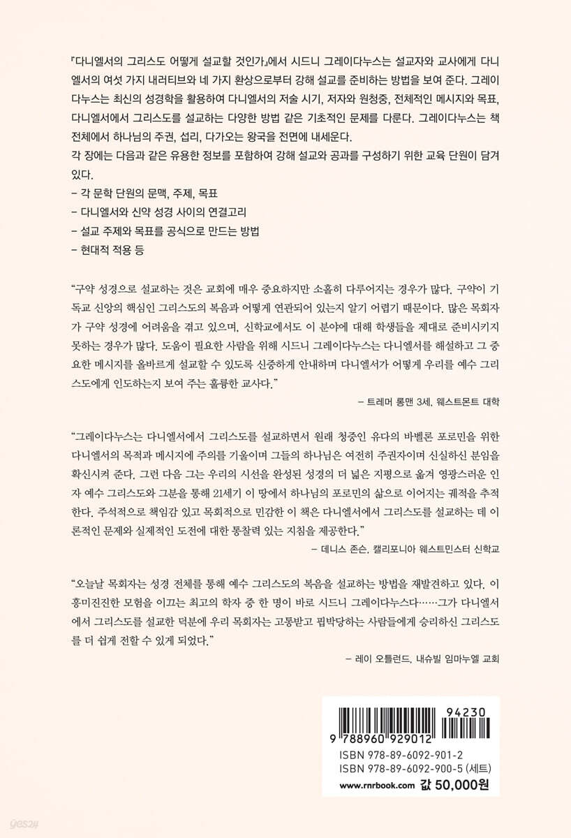 “구약 성경으로 설교하는 것은 교회에 매우 중요하지만 소홀히 다루어지는 경우가 많다. 구약이 기독교 신앙의 핵심인 그리스도의 복음과 어떻게 연관되어 있는지 알기 어렵기 때문이다. 많은 목회자가 구약 성경에 어려움을 겪고 있으며, 신학교에서도 이 분야에 대해 학생들을 제대로 준비시키지 못하는 경우가 많다. 도움이 필요한 사람을 위해 시드니 그레이다누스는 다니엘서를 해설하고 그 중요한 메시지를 올바르게 설교할 수 있도록 신중하게 안내하며 다니엘서가 어떻게 우리를 예수 그리스도에게 인도하는지 보여 주는 훌륭한 교사다.” - 트레머 롱맨 3세 (웨스트몬트 대학)