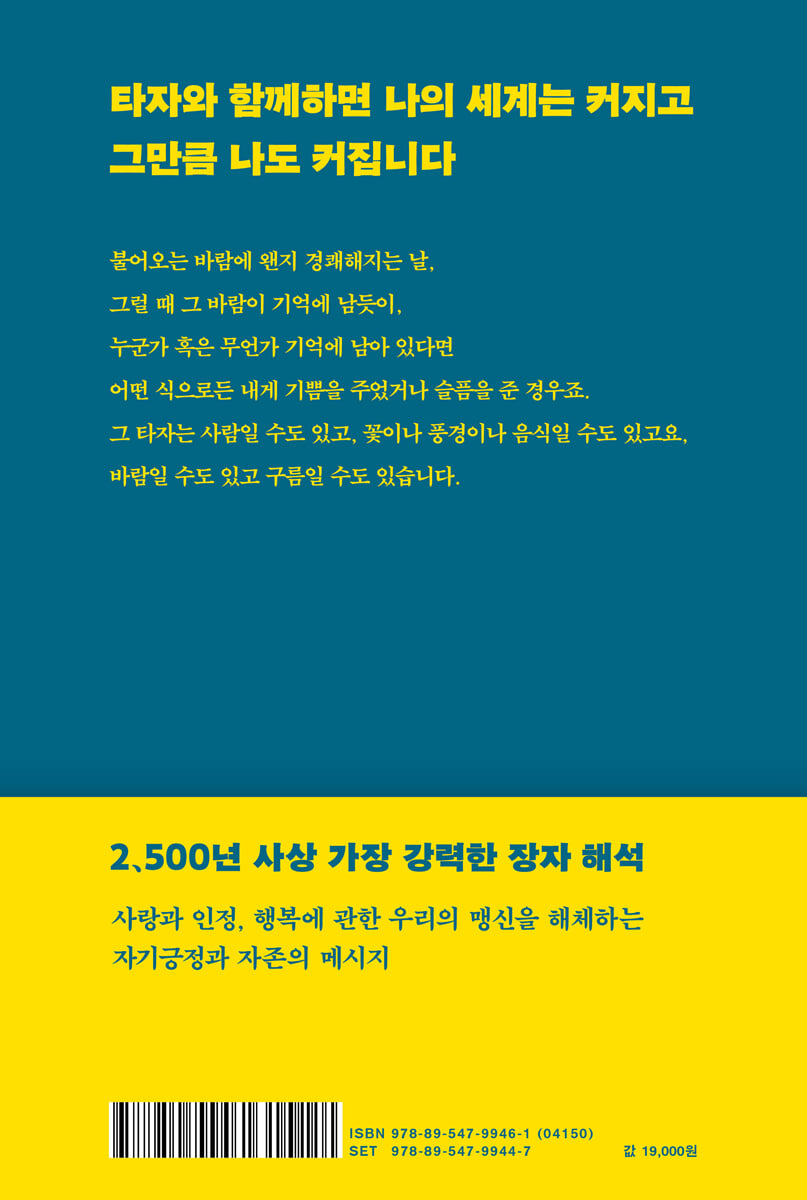 장자가 살았던 전국시대는 치열한 경쟁 시대였다. 군주들은 경쟁에서 승리하기 위해 인재 등용에 혈안이 되었고, 자신을 위한 인재가 되어줄 이에게 명예와 권력, 부를 약속했다. 그런 상황에서 제자백가들은 자신의 말을 따르면 치열한 생존경쟁에서 살아남을 수 있다고 주장했다. 이 책은 바로 여기서 ‘길’, 즉 ‘도(道)’라는 말이 등장했다고 말한다. 2,500년 전의 인재 논리를 보면, 21세기 오늘날의 경쟁 논리에 뛰어든 우리의 삶과 비슷하다. 저자는 ‘경쟁과 인재의 논리’는 장자의 시대에서나 지금 시대에서나 여전히 유효한 강력한 이데올로기라고 말한다. 아니, 전국시대에는 지배계급에서나 그 논리가 국한되었지만, 오늘날은 모든 사람에게 통용되었으니 더 확대되었다고 할 수 있다고 저자는 꼬집는다. 장자는 전국시대의 쓸모와 인재의 논리를 문제 삼고 극복하려고 한 철학자였다. 그는 쓸모가 사실은 우리 삶을 파괴할 수 있고, 쓸모없음이 우리 삶을 풍성하게 만들 수 있다고 역설했다. 무엇보다 쓸모 있는 사유란 국가나 자본이 요구하는 사유에 지나지 않는다고 저자는 말한다. 더 많은 돈을 벌고 더 높은 지위에 오를 수 있게 해주는 사유야말로 국가를 위한, 자본을 위한 사유이지 진정 나를 위한 사유, 인간을 위한 사유가 될 수는 없다는 것이다. 저자는 2,500년 전 장자의 사유를 통해 ‘남에게 쓸모 있는 길을 갈 것인가’ 아니면 ‘나를 위한 길을 갈 것인가’라는 질문을 우리에게 던진다. 이 책은 『장자』 원문 중 우리 시대에 꼭 필요한 48가지 이야기를 선별하여 강렬한 해석으로 장자를 21세기 우리 삶에 직면시킨다. 회사에, 나라에, 자본에, 심지어 가족에게까지 그 쓸모를 보이지 못하면 나의 가치를 잃어버린다는 강박으로 오늘도 쓸모를 증명하기 위해 집 밖을 나서는 이들을 위한 삶의 긍정과 자존감을 되찾게끔 하는 책이다. 타자(他者)를 만나지 못하면 우리 삶은 완성되지 않는다 장자는 타자를, 그리고 타자와의 관계를 고민했던 철학자다. 저자는 그런 장자를 한마디로 ‘타자의 철학자’라고 정의한다. 장자는 ‘타자’라는 개념을 통해 당 시대의 우상 공자(孔子)를 정면으로 비판하기도 한다. 공자의 명언“내가 원하지 않는 것을 남에게도 하지 말라(己所不欲 勿施於人)”를 두고, 장자는 ‘하지만 내가 원하는 게 타자가 원하는 것과 같을 수 있을까?’라고 되묻는다. 내가 원하는 것을 타자가 원하고, 내가 원치 않는 것을 타자가 원치 않는 관계란 거의 없다는 것을 우리는 익히 알고 있다. 오히려 내가 원하는 것을 타자가 원치 않고, 타자가 원하는 것을 내가 원치 않는 경우가 부지기수다. 그래서 장자는 누군가를 사랑한다면 그 누군가가 원하는 것을 해주는 것이 진정한 사랑이라고 말한다. 그리고 저자는 장자의 충고를 받아들인다면 우리 삶은 완전히 뒤바뀔 수 있다고 이야기한다. 어머니, 아버지, 남편, 아내, 딸, 아들, 선배, 후배 등등 나를 둘러싼 모든 관계가 파괴가 아닌 사랑으로 나아갈 수 있다. 타자와 만난다는 것은 무슨 의미일까? 물리적으로 만난다고 만난 것일까? 이 책은 스피노자의 『에티카』를 빌려, 타자를 만나면 우리에게 두 가지 감정 즉, 기쁨과 슬픔이 든다고 설명한다. 타자를 만났을 때 기쁨도 슬픔도 느끼지 않는다면 타자를 만나도 사실 ‘만났다’고 볼 수 없다. 지하철에서 직장에서 식당에서 수많은 사람들을 만나지만 우리는 그들과 만나지 않은 것이다. 그런데 집으로 돌아가 남편을, 아내를, 아이를 봐도 어떤 감정도 일어나지 않는다면? 그렇다면 우리는 진정한 의미의 만남을 하지 못하고 있는지도 모른다. 오상아(吾喪我), 나를 비울 때 타자와 마주칠 수 있다 그렇다면 어떻게 타자와 만날 수 있을까? 저자는 장자의 그 유명한 말 ‘오상아(吾喪我, 나는 나 자신을 잃었다)’를 통해 타인과 마주칠 수 있는 가능성을 이야기한다. 자신을 비운다는 것, 자신을 잃는다는 것은 내 안의 소유욕과 자의식을 없앤다는 뜻이다. 예를 들어,‘나는 똑똑해’‘나는 남자(여자)야’ ‘나는 돈이 많아’ ‘나는 섹시해’ 등등 내 속을 가득 메운 생각과 자의식이 사라질 때 그 자리에 타자가 들어설 수 있는 가능성이 생기는 것이다. 저자는 막연하기만 한 오상아 개념을 바람 소리를 비유로 들어 설명한다. ‘바람 소리’‘물 흐르는 소리’ ‘숨 쉬는 소리’ 등등 우리가 듣는 소리들은 무언가의 마주침에서 일어난다. ‘어떤 구멍’과 ‘어떤 바람’이 마주쳐야 소리가 나는 것이다. 그렇다면 이 마주침의 소리는 누구로부터 났을까? 바람일까? 구멍일까? 정답은 바람과 구멍 둘 다이다. 구멍이 막혀 있으면 바람이 분들 소리가 날 수 없고, 구멍이 비어 있어도 바람이 불지 않으면 소리는 울리지 않는다. 이 둘이 마주칠 때 비로소 소리가 나는 것이다. 저자는 말한다. 우리를 포함한 모든 탄생과 변화도 이러한 마주침의 효과라고. 그런데 내가 속이 꽉 찬 죽순처럼 소유욕과 자의식으로 가득하다면 어떤 바람, 어떤 타자가 나를 스쳐 갈 수 있을까? 그래서 오상아다. 때로는 텅 빈 구멍이 되고, 때로는 바람이 되어, 우리는 타자를 그 구멍에 담거나 타자의 구