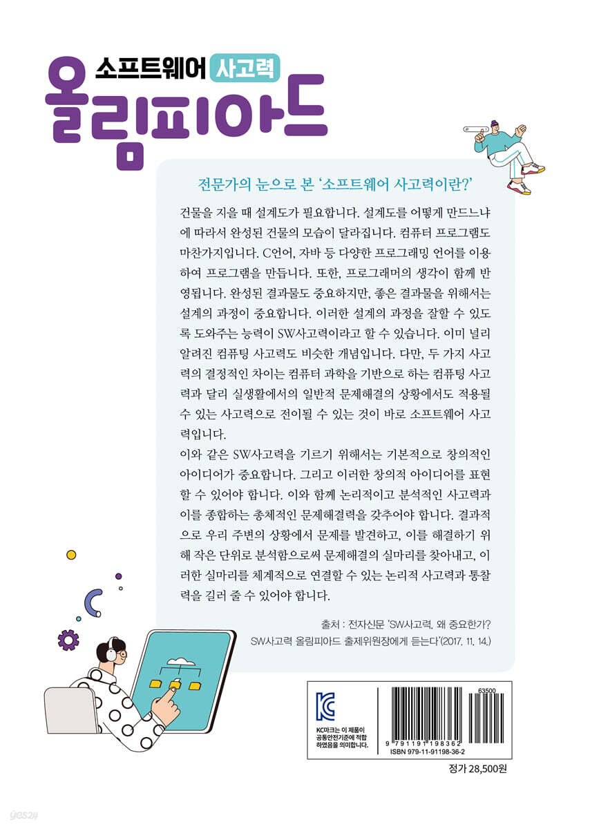 이 책은 총 세 개의 영역으로 구성되어 있습니다. 첫 번째는 'SW사고력이란' 주제로 SW사고력을 설명합니다. SW사고력의 중요성을 강조하기 앞서, 현재 우리가 살아가는 SW·인공지능(AI) 시대에 대한 이야기를 합니다. 저자는 이미 SW는 우리가 살아가는 사회에서 혁신과 성장 가치를 창출하는 중심이 되고, 기업·국가 경쟁력을 좌우한다고 이야기합니다. SW사고력에 대한 정의도 내립니다. SW사고력은 SW적 접근으로 문제의 정보 요소를 발견하고 분석해 해결 방안을 제시하는 능력이라 규정합니다. 이러한 맥락에서 SW사고력이 왜 중요한지 역설합니다. 우리나라뿐 아니라 해외 선진국의 초·중학교 SW교육 교과과정도 소개합니다. SW사고력을 기르는 방법도 다뤘습니다. 보다 세분화해 · 정보이해 사고력 · 창의적 문제해결 사고력 · 지식기반 사고력 · 통합 맥락적 사고력 · 협동적 사고력 · 윤리적 사고력 · 표현력에 대한 강화 방안을 제시합니다. 마지막으로 이 책의 활용방법도 자세하게 담았습니다. 이렇게 공부하세요 가. 기출문제 분석…(1~9회) 기출 문제를 분석하여 문제를 출제한 의도를 파악하고, 출제 의도에 맞춰 답안을 어떻게 작성해야 하는지 안내합니다. 또한, 평가하고자 하는 평가 준거를 제시함으로써 문제 해결을 위해 필요한 사고능력을 제시합니다. 2017년 1회 대회부터 지난해 개최된 8회 대회까지 모든 기출문제를 총망라했습니다. 기존 교재가 1~4회 대회 기출문제만 담았던 것에 비해 개정판은 최근 대회까지 다뤄 기출문제가 두 배 늘었습니다. 이 영역에서는 초등3·4학년, 초등5·6학년, 중학1~3학년 등급별로 대회별로 기출문제를 분석했습니다. 각 문제에 대한 출제 의도와 평가기준도 상세하게 제시했습니다. 기존 학생들의 우수답안을 기반으로 다양한 답안에 대한 예시도 함께 다뤘습니다. 예시 답 아래에는 학생들이 그 답을 쓰게 된 배경을 평가자 입장에서 설명했습니다. 일부 수상학생의 실제 답안지를 예시로 보여주기도 합니다. 기출문제 분석은 총 200여페이지에 이를 정도로 방대합니다. 모든 문제마다 출제 배경과 우수 답안 예시를 쉽게 보고 이해할 수 있게 만들었습니다. 구덕회 교수는 “학생들이 문제 출제 의도와 우수 답안 예시를 보면서 보다 창의적이고 논리적인 사고를 할 수 있을 것”이라며 “교재 문제를 풀다보면, 학생들은 어느새 SW사고력이 향상되는 것을 쉽게 느낄 수 있다”고 말했습니다. 나. 예시답안 문제 분석을 통해 파악한 기출 문제에 대한 예시답안입니다. 예시답안은 말 그대로 예시답안입니다. 정답이 정해진 문제가 아니므로 다양하고 창의적인 답안을 작성할 수 있도록 예시답안 작성 의도를 함께 포함하고 있습니다. 또한, 답안을 표현하는 방법을 다양하게 제시함으로써 대회에서 답안을 작성할 때 필요한 표현력을 기를 수 있도록 하였습니다. 다만, 예시답안은 하나의 예일 뿐이니 문제 분석을 잘 읽어본 후 자신만의 답안지를 작성해보는 것이 중요합니다. 다. 참가자 답안지 살펴보기 참가자 답안지 살펴보기는 실제 대회에 참가한 학생들이 작성한 답안의 내용입니다. 자신과 같은 학년의 친구들은 과연 어떻게 답안을 작성했을지 참고하면서 여러분의 생각을 넓히는 기회가 되기 바랍니다. 한 가지 명심해야 할 것은 참가자의 답안지도 정답이 아닙니다. 자신만의 창의적인 답안을 작성하는 데 참고용으로 사용하세요. 라. 연습문제 풀어보기 (SWTO 연습문제 제공. 실전 테스트 가능) 연습문제는 소프트웨어 사고력 올림피아드에서 평가하고자 하는 7가지(IU, CS, KT, IC, CT, ET, EP) 사고력을 바탕으로 기존 출제 문제와 유사하게 출제하였습니다. 연습문제에 대한 예시답안은 정형화된 답안 작성을 방지하기 위하여 포함되어 있지 않습니다. 대신 출제 의도를 부록으로 함께 제공하고 있으니 답안지 양식에 맞춰 답안을 작성하는 연습을 해보면 좋습니다. 서울교대 컴퓨터교육과 교수진, 현직 정보교사로 구성된 SWTO 문제출제·평가위원들이 출제한 연습문제를 제공합니다. 학생들은 가상의 SWTO를 총 4회에 걸쳐 실전 테스트가 가능합니다. 제10회 SWTO에 참가 신청을 했다면, 대회 참가 전에 본인의 실력을 평가해 볼 좋은 기회입니다. 부록으로 연습문제 출제 의도와 답안지 양식도 제공합니다. 학생들은 연습문제 출제의도를 파악해 보다 적합한 답을 찾을 수 있습니다. 대부분 문제들은 SW사고력 요소인 창의적 문제 해결력, 통합 맥락적 사고력, 지식기반 사고력, 표현력, 정보이해 사고력 등을 요구합니다. 구 교수는 “기출문제와 연습문제 모두 학교 교과서 지문이나 신문 기사를 인용해 출제했다”며 “공교육을 받거나 미래 사회에 관심 있는 학생이면 누구나 쉽게 문제를 풀 수 있다”고 강조했습니다. 제10회 소프트웨어사고력올림피아드는 서울·고양·대전·대구·부산·광주·제주·원주 등 8개 도시에서 동시 개최됩니다. 한국소프트웨어산업협회와 전자신문, 서울교대에서 주최하며 지역별로 한국항공대, KAIST, 경북대, 동서대, 전남대, 제주대, 연세대 미래캠퍼스에서 공동 개최합니다. 현재 이티에듀 홈페이지에서 무료로 접수 가능합니다. |