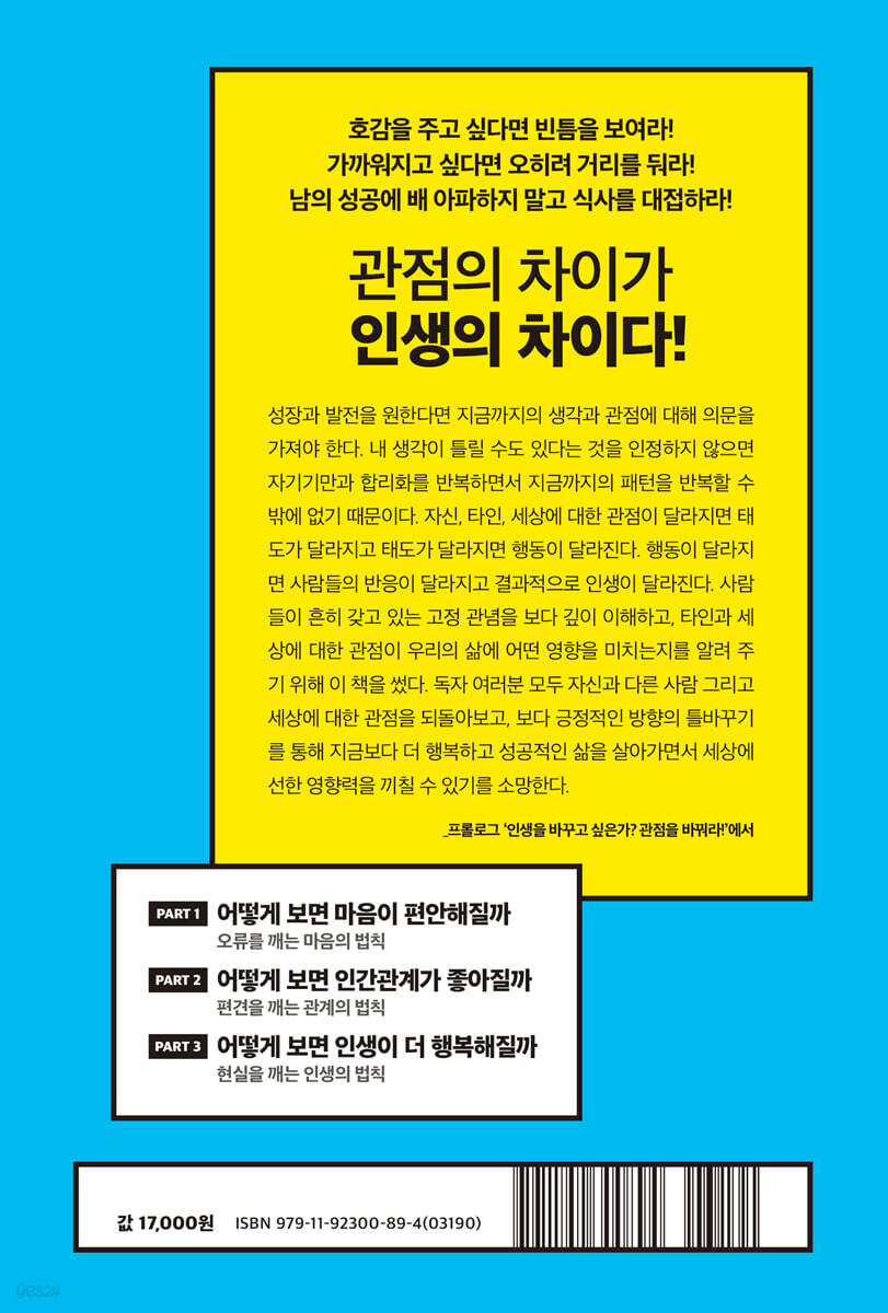 --- p.10, 「프롤로그_인생을 바꾸고 싶은가? 관점을 바꿔라!」 중에서 실수 없이 살아가려니 힘들지 않은가? 어떤 사람과 친밀하게지내고 싶다면 너무 완벽한 모습만 보여 주려고 하지 마라. 피곤하고 힘들다며 하소연도 하고, 때로는 일부러라도 부족한 모습을 보여라. 그래야 상대방도 나를 도와주면서 스스로 존재감을 느낄 수 있다. 유리는 빈 공간이 없기 때문에 물이 스며들 수 없다. 하지만 스펀지는 빈틈이 많아 물이 쉽게 스며든다. 사람도 마찬가지로 빈틈을 보여야 상대가 그 틈새로 비집고 들어올 수 있다. --- p.21, 「어떻게 보면 마음이 편안해질까_ 오류를 깨는 마음의 법칙」 중에서 실패할 사람들은 사촌이 땅을 사면 배가 아프다. 하지만 성공할 사람들은 다르다. 땅을 산 사촌을 시기하거나 질투하지 않는다. 그의 성공을 진심으로 축하하고, 그로부터 배우려고 한다. 그리고 땅을 샀으니 한턱내라고 하기보다 축하한다면서 오히려 자신이 한턱내겠다고 제안한다. 그래야 대접받은 사촌이 땅을 살 수 있는 노하우를 가르쳐줄 것이고, 그럼으로써 시행착오를 줄이고, 더 빨리 땅을 살 수 있기 때문이다. 부자가 되고 싶다면 빈자의 마인드에서 부자의 마인드로 관점을 바꿔야 한다. --- p.99, 「어떻게 보면 마음이 편안해질까_ 오류를 깨는 마음의 법칙」 중에서 모든 사람은 다른 사람과 어느 정도 거리를 유지하고 싶어 하고, 자기만의 개인적 공간을 갖고 싶어 한다. 그러므로 아무리 친한 사이라도 상대방이 불편하게 생각하는 거리 이상으로 다가가거나 그들만의 개인적 공간을 침범하면 안 된다. 좋은 관계를 유지하고 싶다면 상대방의 개인적 공간을 침범하지 말고, 상대방과 적당한 거리를 유지함으로써 상대가 경계심을 갖지 않고 편안하게 느낄 수 있게 해 줘야 한다. --- p.122, 「어떻게 보면 인간관계가 좋아질까_편견을 깨는 관계의 법칙」 중에서 첫인상의 효과가 아무리 강력해도 충분히 노력하면 그것을 뒤집을 수 있다. 누군가와의 만남에서 첫인상을 구겼다고 그냥 물러설 필요는 없다. 안 좋았던 첫인상이 어느 정도 감소되기를 기다렸다가 새로운 마음가짐으로 만나면 된다. 구겨진 첫인상을 만회할 수 있는 태도와 행동을 반복해서 보여 준다면 사람의 인상은 얼마든지 긍정적으로 바꿀 수 있다. --- p.160, 「어떻게 보면 인간관계가 좋아질까_편견을 깨는 관계의 법칙」 중에서 못다 이룬 첫사랑이 더 소중하게 느껴지는 것은 그만큼 가치가 있기 때문이라기보다 단지 해결하지 못한 미완성 과제기 때문일 가능성이 높다. 실제로 첫사랑을 찾아 주는 한 TV 프로그램의 참가자들 중에서 애타게 그리던 사람을 만나고 난 후에 실망감을 감추지 못하며 ‘추억은 마음으로 만나야 아름답다’고 말한 사람이 많다고 한다. --- p.206, 「어떻게 보면 인생이 더 행복해질까_현실을 깨는 인생의 법칙」 중에서 심리학자 켈리 맥고니걸은 스트레스 그 자체보다 스트레스가 해롭다는 믿음이 건강에 훨씬 더 해롭다는 사실을 여러 연구를 통해 밝혀냈다. 참가자 중 스트레스가 건강에 치명적이라고 응답한 사람들의 사망률이 가장 높았고, 해롭지 않다고 응답한 사람들은 별로 영향을 받지 않았다. 그뿐만 아니라 똑같은 스트레스를 두고도 스트레스가 긍정적으로 작용한다고 믿는 사람들은 더 건강하며 행복한 모습을 보였다. 스트레스가 오히려 활력소로 작용한 것이다. 결론적으로 스트레스는 ‘스트레스가 해롭다’는 믿음이 결합할 때만 해롭게 작용한다. 생각을 바꾸면 스트레스는 독이 아니라 오히려 약이 된다. --- p.270, 「어떻게 보면 인생이 더 행복해질까_현실을 깨는 인생의 법칙」 중에서 |