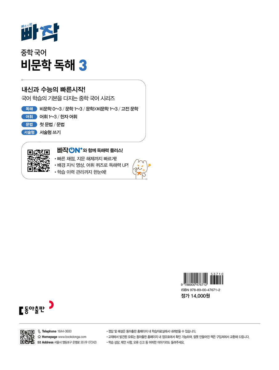 독해력과 어휘력을 함께 키우는 독해 기본서 · 온라인 학습 서비스 〈빠작ON+〉 빠른 채점, 지문 해제, 배경지식 영상 자료, 추가 어휘 퀴즈를 온라인으로 이용 가능합니다. · 교과 학습과 연계된 다양한 주제의 지문 인문, 사회, 과학, 기술, 예술 등 5개 분야에 걸쳐 다양한 주제의 지문을 수록했습니다. 교과 학습과 연계된 유익한 지문, 최신 이슈를 반영한 흥미로운 지문은 읽는 것만으로도 학생들에게 큰 도움이 될 것입니다. · 독해의 기초를 다져 주는 '지문 분석' 빈칸을 채워 나가는 과정을 통해 독해의 기본 원리인 지문 분석 방법을 자연스럽게 익힐 수 있습니다. · 지문 이해를 도와주는 '배경지식' 지문 내용과 관련된 배경지식을 수록하여 지문을 보다 쉽게 이해할 수 있습니다. 배경지식을 차곡차곡 읽다 보면 독해나 논술에 도움이 되는 기초 교양을 자연스럽게 쌓아 나갈 수 있습니다. · 지문과 연계해 익히는 '어휘?어법' '어휘?어법'을 통해 지문에 나온 어휘의 의미와 쓰임을 바로 확인할 수 있어서 독해력과 어휘력을 함께 키울 수 있습니다. |