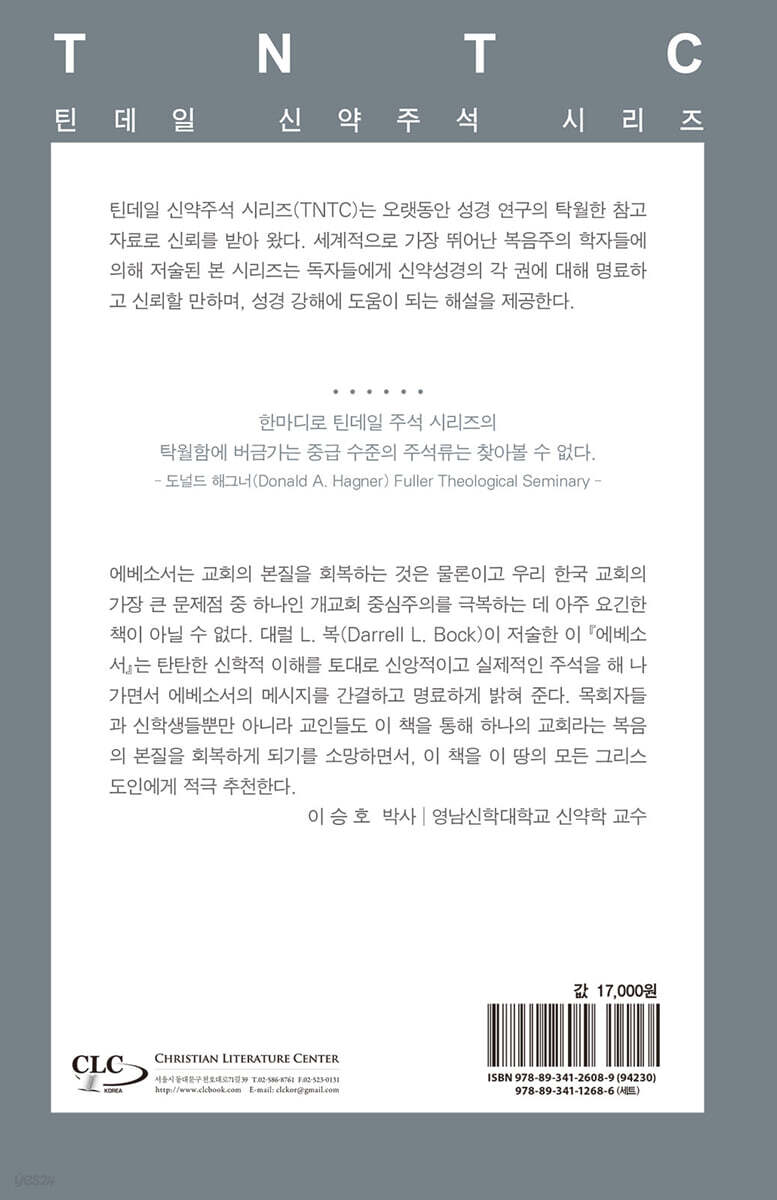 에베소서는 교회의 본질을 회복하는 것은 물론이고 우리 한국 교회의 가장 큰 문제점 중 하나인 개교회 중심주의를 극복하는 데 아주 요긴한 책이 아닐 수 없다. 대럴 L. 복(Darrell L. Bock)이 저술한 이 『에베소서』는 탄탄한 신학적 이해를 토대로 신앙적이고 실제적인 주석을 해 나가면서 에베소서의 메시지를 간결하고 명료하게 밝혀 준다. 목회자들과 신학생들뿐만 아니라 교인들도 이 책을 통해 하나의 교회라는 복음의 본질을 회복하게 되기를 소망하면서, 이 책을 이 땅의 모든 그리스도인에게 적극 추천한다. - 이승호 (영남신학대학교 신약학 교수)