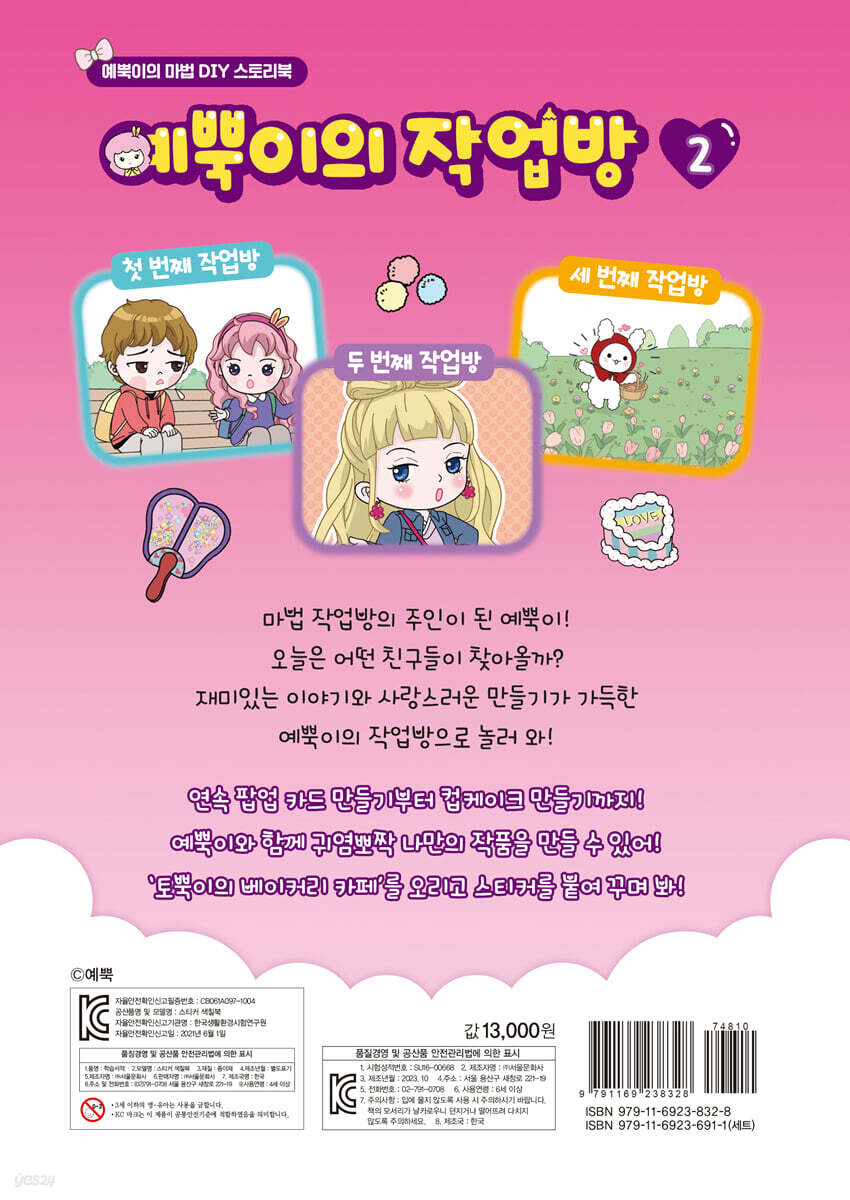 -연속 팝업 카드 만들기 -카드 봉투 만들기 두 번째 작업방: 선녀님의 마법 부채 -선녀 부채 만들기 -꿈 스티커북 만들기 세 번째 작업방: 토뿍아, 어디 가? -산딸기 컵케이크 만들기 *특별 부록 토뿍이의 베이커리 카페 만들기 -토뿍이의 베이커리 카페 도안 A -토뿍이의 베이커리 카페 도안 B -토뿍이의 베이커리 카페 도안 C |
