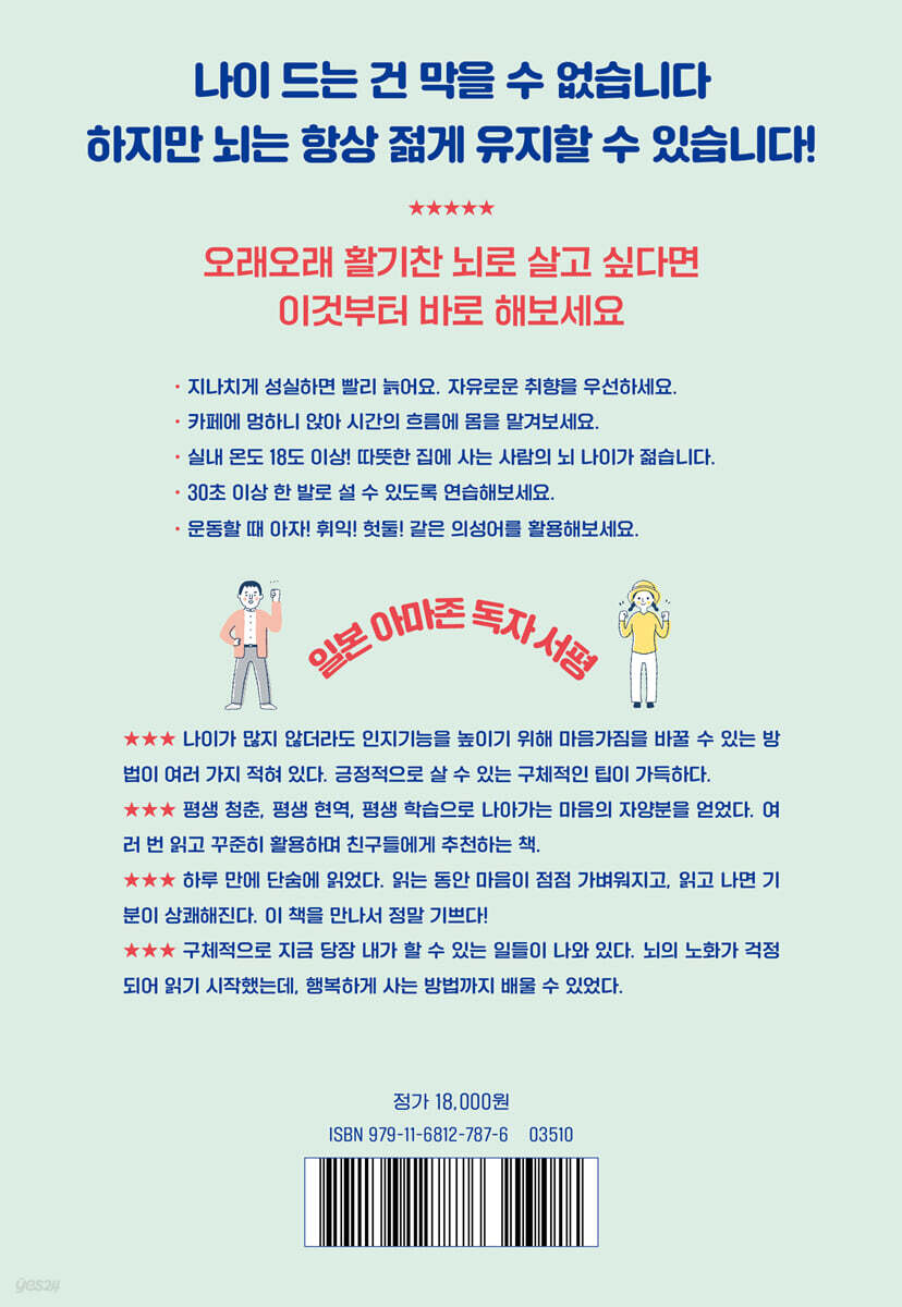 1장 스스로 깨닫기 힘든 ‘뇌의 노화’ 뇌의 노화는 감지하기 어렵다 뇌의 정점은 몇 살일까? 나이 들면 수면 시간이 짧아지는 것도 뇌의 노화현상 2장 나이 들어도 뇌가 늙지 않는 사람은 무엇을 하고 있을까? 나이보다 스무 살 이상 젊은 뇌를 가진 ‘슈퍼 에이저’ ‘욕구가 있는 사람’이 장수할 가능성이 크다 부부 금슬이 좋으면 뇌가 건강해진다 사이좋은 사람이 단 한 명만 있어도 인지기능과 행복도가 상승한다 ‘자유로운 사람’은 잘 늙지 않지만 ‘성실한 사람’은 쉽게 늙는다 나이와 상관없이 뇌의 신경 네트워크를 늘리는 방법 무리하면 뇌는 늙는다 중·노년에만 존재하는 ‘휴식 유전자’가 뇌의 손상을 막는다 ‘삶의 보람’만 있다면 나이와 상관없이 뇌는 크게 변화한다 매일 할 수 있는 ‘뇌에 좋은 생활 습관’ 3장 뇌가 늙었는지 어떻게 알 수 있을까? 뇌의 노화 정도를 바로 알 수 있는 방법 ① 뇌의 노화 정도를 바로 알 수 있는 방법 ② 다섯 가지 유형의 노인 뇌 4장 뇌가 늙지 않으려면 어떤 운동을 해야 할까? 운동을 한다면 걷기보다 ‘뇌 활성 드리블’ 춤은 최고의 뇌 활성화 운동 뇌의 유연성을 높이고 기억력을 향상하는 법 5장 뇌가 늙지 않으려면 어떤 건강 습관이 필요할까? 잘 씹으면 의욕이 생긴다 너무 뚱뚱하거나 너무 말라도 사망 위험이 커진다 고기를 좋아하면 왜 장수할까? 식욕이 있는 사람은 장수할 가능성이 높다 뇌의 노화를 방지하는 일곱 가지 슈퍼 영양소 귀가 어두워지는 건 뇌의 위험신호 6장 뇌가 늙지 않으려면 어떤 생활 습관이 필요할까? 아무것도 하지 않을 때 뇌는 활성화된다 취미가 많은 사람은 치매에 잘 걸리지 않는다 나에게 맞는 취미를 찾는 방법 60대가 되면 개를 키우는 것이 좋은 이유 뇌가 잘 늙지 않는 실내 온도는 몇 도일까? 실내 온도와 습도에 따라 작업 효율도 달라진다 65세 이상에게 바람직한 스마트폰 사용법 65세 이상은 디지털 도구를 적극 활용하자 손으로 글을 쓰면 뇌의 인지기능이 좋아진다 은퇴 이후 수첩 사용법 일정이 많지 않아도 수첩을 사용하면 좋다 인생이 즐거워지는 메뉴 100 글쓰기로 분노와 미움 없애기 일은 뇌의 노화를 예방한다! 7장 뇌가 늙지 않으려면 어떤 마음가짐이 필요할까? 주관적 나이로 살아가기 ‘나는 젊다’라고 진심으로 생각하면 뇌와 몸도 젊어진다 나이 들어 외고집인 사람과 유연한 사고를 하는 사람의 차이 뇌가 빨리 늙는 사람이 자주 사용하는 말은? “고마워요”라는 말이 가진 엄청난 힘 대화에 ‘의성어’를 넣으면 몸과 뇌의 움직임이 좋아진다 ‘난 괜찮겠지’라고 생각하는 사람이 보이스 피싱에 넘어가는 이유 노인의 ‘긍정 편향’은 사고의 원인 ‘좋은 스트레스’와 ‘나쁜 스트레스’를 구분 지어 생각하기 노인이 되면 의존 경향이 잘 생기는 이유 8장 뇌가 늙지 않으려면 어떤 인간관계를 만들어야 할까? 상대의 끄덕임만으로도 뇌는 기뻐한다! 친구를 사귀지 못하는 사람을 위한 열한 가지 제안 내향적인 사람의 인간관계 만들기 누군가가 싫어지는 계기의 90퍼센트는 냄새 9장 스트레스와 치매를 멀리하고 싶다면 어떻게 해야 할까? ‘나는 중요한 사람’임을 실감할 수 있는 자리 만들기 ‘좋았던 옛날’을 떠올리면 뇌의 영양분이 된다 콜레스테롤과 노인성 우울증의 관계 향을 활용하면 치매 진행을 막을 수 있다?! 커피 향에는 사람을 상냥하게 만드는 효과가 있다 나가며 참고 문헌 |
