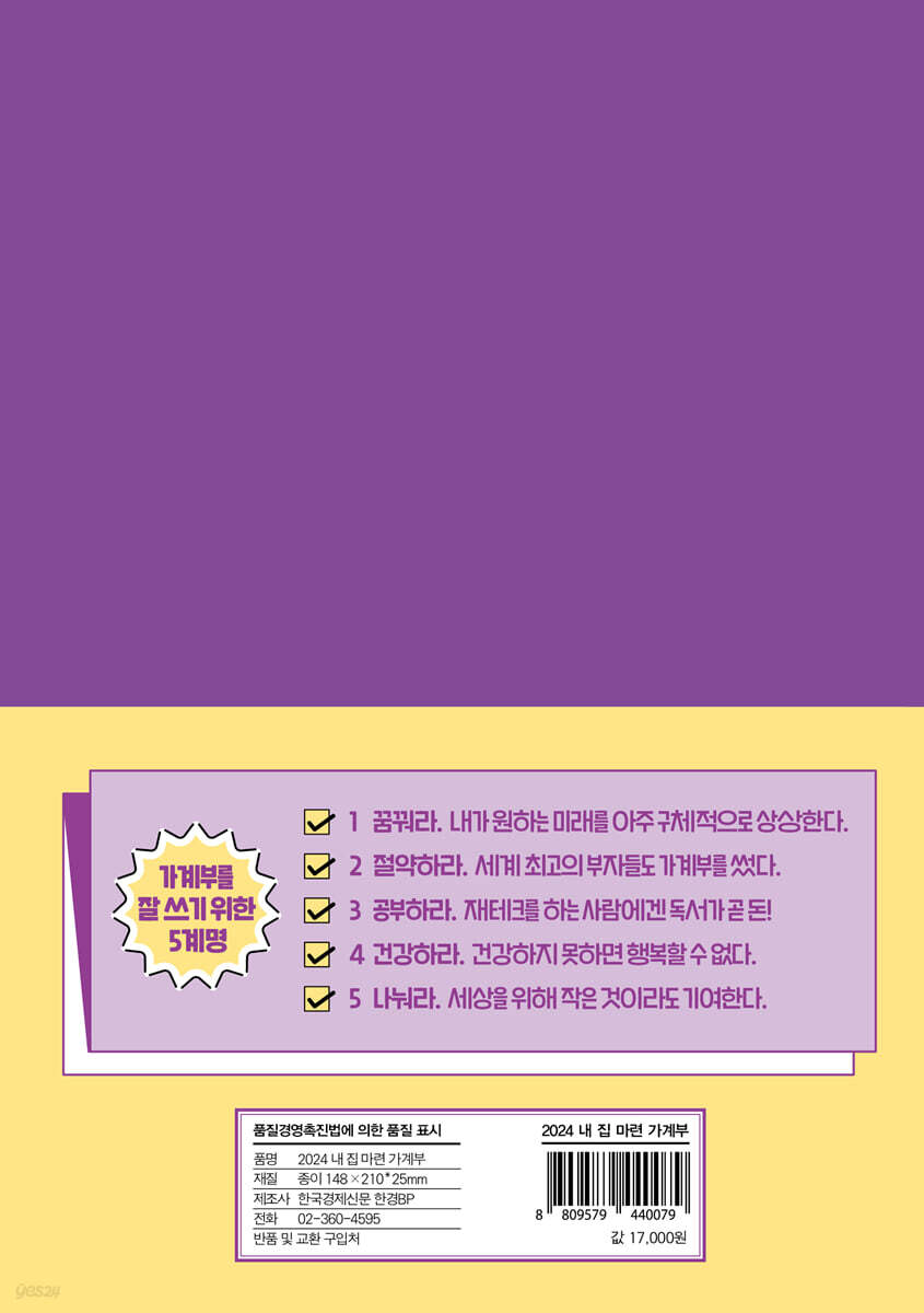 가계부를 잘 쓰기 위한 5계명 《내 집 마련 가계부》 사용 순서 《내 집 마련 가계부》 미리보기 Part 1. 가계부로 공부해요, 부동산 투자 7단계 수업 1단계 : 투자의 시작은 언제나 공부 2단계 : 내 집 마련의 기본, 아파트 분양받기 3단계 : 자산을 늘리는 발판, 오를 지역 찾는 법 4단계 : 깎아야 산다, 가격 협상 잘하는 법 5단계 : 빚내는 것도 능력이다, 대출 잘 받기 6단계 : 내 집의 가치를 높이는 가장 쉬운 방법, 리모델링 7단계 : 가장 큰 절약, 세금 아끼기 Part 2. 지금 당장 시작해요, 재테크 3단계 수업 1단계 : 저축과 투자 사이에서, 종잣돈 모으기 2단계 : 나이 듦을 위한 준비, 연금 플랜 3단계 : 필요 없으면 빨리 버려야, 보험 정리 Part 3. 누구나 아낄 수 있는 최강 절약법 돈은 아끼고 꿈은 모아요 Part 4. 쓰기만 해도 1년에 2,000만 원! 가계부 쓰기 1. 쓰기 전에 알아두세요 2. 내 집 마련 가계부 쓰기 2024~2025년 달력 2024년 연간 스케줄 2023년 12월 가계부 2024년 1월 가계부 2월 가계부 3월 가계부 4월 가계부 5월 가계부 6월 가계부 7월 가계부 8월 가계부 9월 가계부 10월 가계부 11월 가계부 12월 가계부 |