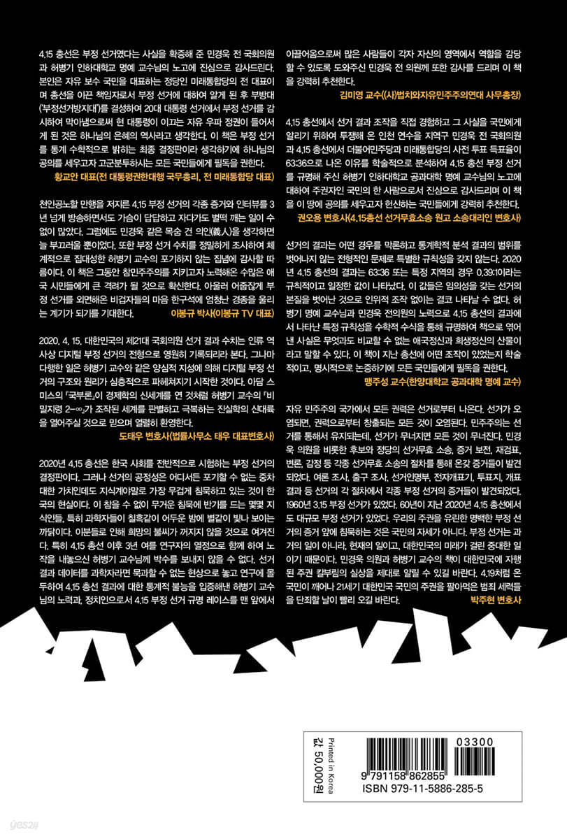 4.15 총선에서 선거 결과 조작을 직접 경험하고 그 사실을 국민에게 알리기 위하여 투쟁해 온 인천 연수을 지역구 민경욱 전 국회의원과 4.15 총선에서 더불어민주당과 미래통합당의 사전 투표 득표율이 63:36으로 나온 이유를 학술적으로 분석하여 4.15 총선 부정 선거를 규명해 주신 허병기 인하대학교 공과대학 명예 교수님의 노고에 대하여 주권자인 국민의 한 사람으로서 진심으로 감사드리며 이 책을 이 땅의 공의를 세우고자 헌신하는 국민들에게 강력히 추천한다. - 권오용 (4.15총선 선거무효소송 원고 소송대리인 변호사)