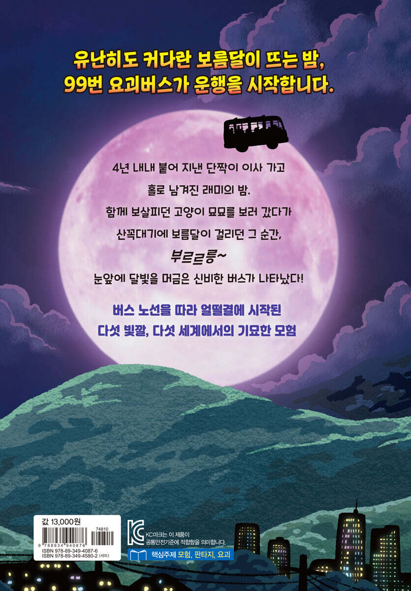 요괴버스를 타고 떠나는 다섯 빛깔의 기묘동으로의 신비한 여행, 그 첫 번째 이야기 오가는 사람이 드문드문해진 시간, 까마득한 하늘을 보고 있으면 별의별 상상이 꼬리를 물고 이어지곤 한다. 눈에 보이는 저 별은 내가 선 이곳에서 얼마나 멀리 있는지, 끝이 안 보이는 하늘 너머 어딘가에 정말로 외계인이, 혹은 우리가 사는 이 지구와 비슷한 곳이 있지 않은지, 그리고 이 넓은 우주에 나 혼자 남겨진다면 어떤 기분일지 하는 두려움과 외로움까지. 그렇게 허무맹랑한 생각과 기분에 사로잡혀 멍하니 있을 때 반짝! 동그란 달 너머 어디에선가 답변이 도착한다. 보름달이 뜬 밤, 홀로 서성이던 아이의 모험은 그렇게 시작되었다. 달빛을 꼭 닮은 요괴버스의 운행을 알리는 첫 번째 책, 『기묘동 99번 요괴버스 1. 이번 정류장은 귀물의 세계입니다』가 출간되었다. [기묘동 99번 요괴버스] 는 전체 5권으로 기획된 시리즈이며, 다섯 명의 작가가 머리를 맞대고 전체 세계관을 기획·구성했다. 김진형, 송우들, 효주, 김다해, 재돌 작가가 한 권씩 집필을 맡아 알록달록 다섯 빛깔의 기묘동에서 펼치는 모험담을 선보일 예정으로, 시작은 그동안의 책에서 꿈의 가치, 우정의 깊이를 다정하게 이야기해 온 김진형 작가가 맡았다. 인간 세계에서 잊히거나 버려진 물건들이 모여 사는 ‘귀물의 세계’가 바로 그 무대이다. “인간의 세계는 이미 떠났어. 다시 돌아오려면 버스가 한 바퀴 돌길 기다리는 수밖에 없단 말이지.” 시작은 얼떨결, 진행은 우당탕! 무엇 하나 호락호락하지 않은 기막힌 모험의 결말은? 4년 내내 붙어 지낸 절친이 이사 간 뒤, 혼자 남은 래미의 마음에는 폭풍이 휘몰아치고 있다. 쓸쓸한 마음으로 다현이와 다니던 곳을 헤매다가 함께 돌보는 길고양이 묘묘에게 들렀는데, 이게 웬일일까? 묘묘가 평소답지 않은 행동을 보이며 공터 밖으로 휙 달려가 버린다. 묘묘를 쫓아 산 중턱 기묘동 표지석 앞에 도착한 래미의 머리 위에 오늘따라 유난히 큰 보름달이 떠올랐다. 보름달에 눈길이 홀린 그 순간, 희미하게 버스 시동음이 나더니 이럴 수가! 어디선가 보라색 버스가 갑자기 나타나 눈앞에 동동 떠 있는 게 아닌가? 어리둥절해하는 사이 묘묘는 래미에게 작별 인사를 건네고, 래미는 묘묘마저 이대로 보낼 수 없단 생각에 묘묘를 덥석 붙잡았다가 그만 버스 안으로 빨려 들어가게 된다. 그런데 버스가 왠지 이상하다. 색깔도 번호도 낯설다 싶더라니, 사람이 아니라 구미호, 뱀, 몽달귀신 같은 요괴들이 타고 있다. 묘묘가 말하길, 이건 다른 세계의 기묘동을 순환하는 요괴버스고 이미 인간 세계를 벗어났으며, 노선을 한 바퀴 돌아 래미가 탔던 정류장으로 되돌아가길 기다릴 수밖에 없다는 거다. 설상가상 인간인 래미가 요금도 내지 않고 타는 바람에 버스가 크게 휘청이는데……. 아무리 얼결에 휘말렸다지만 시작부터 범상치 않은 이 모험, 아주아주 난감하다! 친구에 의해, 친구를 위해! 낯설고 외로운 곳에서 더욱 단단하게 피어나는 우정의 힘 래미는 요괴버스를 계속 타기 위해 요기를 구하러 묘묘와 첫 번째 정류장에서 내리기로 한다. 이번 정류장은 ‘귀물의 세계’. 헤지고 낡은 물건 요괴 사이를 헤매던 래미와 묘묘는 뭔가에 쫓기던 저주 인형을 만나, 요기를 가장 많이 가졌다는 ‘대장장이’의 존재를 알게 된다. 둘은 요기를 나눠 달라 부탁할 셈으로 대장장이를 찾아가지만 대장장이는 인간인 래미를 보자마자 치를 떨며 잡아먹을 듯 달려든다. 저주 인형의 도움으로 겨우 도망친 둘은 대장장이의 숨겨진 사정을 듣고, 대장장이의 마음을 돌릴 힌트를 알아차린다. 자신을 외톨이라고 생각했던 래미도 결국은 혼자가 아니었지요. 투덜대면서 끝까지 곁에 있어 준 묘묘, 귀물의 세계에서 기꺼이 친구가 되어 준 저주 인형, 악당이었지만 끝내 요기를 나눠 준 대장장이까지. 요괴버스에 타지 않았다면 만나지 못했을 인연들이 래미와 함께 모험을 했지요. _‘작가의 말’ 중에서 『기묘동 99번 요괴버스』 1권의 중심에는 ‘친구’와 ‘우정’이 있다. 단짝이 떠나고 혼자 남겨진 래미는 또 다른 친구 묘묘를 따라 요괴버스에 올랐고, 새로운 친구 저주 인형의 도움을 받아 낯선 세계에서 바른길을 찾아냈으며, 오랜 친구와의 추억을 상기해 대장장이의 마음을 되돌렸다. 또한 맷손을 잃어버린 맷돌, 한쪽 귀가 없는 토끼 인형, 오래전 주인에게 아낌받은 기억을 자랑하는 낡은 옷들은 모두 자신의 쓸모를 알아주었던 친구와의 추억을 소중히 여기며 오늘을 살아간다. 다정한 글과 달빛 가루가 포르르 떨어지는 마법 같은 그림의 환상적인 만남 래미는 귀물의 세계에서 ‘친구’와의 추억을 소중히 간직한 수많은 물건을 만난다. 이는 지금 외톨이라고 느끼고 있을 누군가에게 ‘너는 혼자가 아니’라는 말을 건네려는 김진형 작가의 다정한 위로이기도 하다. 빛과 명암, 색의 조화와 대비를 다채롭고 풍성하게 사용하는 은정지음 작가의 그림은 글에 담긴 메시지를 더욱 따뜻하게 구현해 주었다. 생기 넘치고 개성 넘치는 캐릭터, 어떤 상상이 이루어져도 이상하지 않을 특별한 밤의 풍경, 온갖 귀물들이