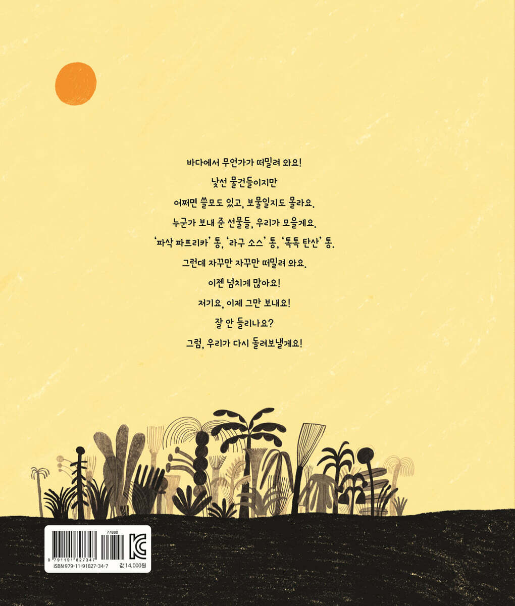 이 그림책은 작은 섬 주민들의 오해 속에서 시작됩니다. 바닷가에 떠밀려온 쓰레기를 전시하고 자랑해야 할 소중한 선물로 받아들인 것입니다. 그러다가 계속해서 밀려와 쌓여만 가는 물건들을 어찌할지 모르는 상황에 처합니다. 이들은 보복적인 방식이나 악의적인 태도가 아니라 이미 풍족하게 소유하고 있는 것을 나누는 마음으로 문제를 해결합니다. 선물을 보낸 사람에게 되돌려 보내는 것입니다. 코믹함과 도덕적 가치를 동시에 담고 있습니다. 또한 재활용과 재사용이 얼마나 가치 있는 해결책이 될 수 있는지 보여줍니다. 환경문제에 대한 인식을 높일 수 있는 모두를 위한 그림책입니다.