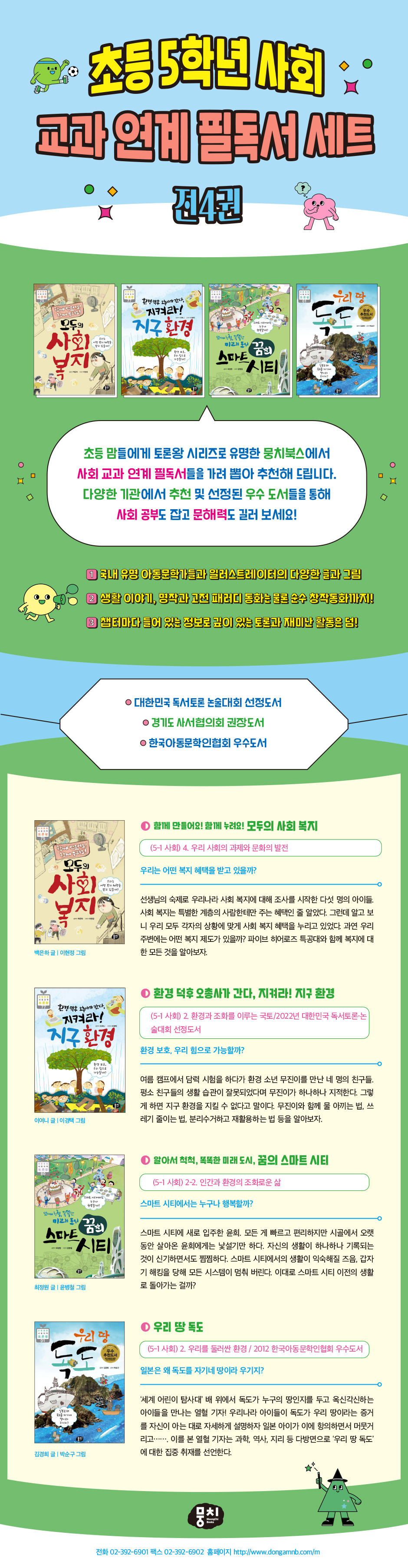 - 생활 이야기, 명작과 고전 패러디 동화는 물론 순수 창작동화까지! - 챕터마다 들어 있는 정보로 깊이 있는 토론과 재미난 활동은 덤! ★ 대한민국 독서토론논술대회 선정도서 ★ 한국아동문학인협회 우수도서 ★ 함께 만들어요! 함께 누려요! 모두의 사회 복지 백은하 글 | 이현정 그림 5-1 사회 4. 우리 사회의 과제와 문화의 발전 우리는 어떤 복지 혜택을 받고 있을까? 선생님의 숙제로 우리나라 사회 복지에 대해 조사를 시작한 다섯 명의 아이들. 사회 복지는 특별한 계층의 사람한테만 주는 혜택인 줄 알았다. 그런데 알고 보니 우리 모두 각자의 상황에 맞게 사회 복지 혜택을 누리고 있었다. 과연 우리 주변에는 어떤 복지 제도가 있을까? 파이브 히어로즈 특공대와 함께 복지에 대한 모든 것을 알아보자. 환경 덕후 오총사가 간다, 지켜라! 지구 환경 이여니 글 | 이경택 그림 5-1 사회 2. 환경과 조화를 이루는 국토 / 2022년 대한민국 독서토론·논술대회 선정도서 환경 보호, 우리 힘으로 가능할까? 여름 캠프에서 담력 시험을 하다가 환경 소년 무진이를 만난 네 명의 친구들. 평소 친구들의 생활 습관이 잘못되었다며 무진이가 하나하나 지적한다. 그렇게 하면 지구 환경을 지킬 수 없다고 말이다. 무진이와 함께 물 아끼는 법, 쓰레기 줄이는 법, 분리수거하고 재활용하는 법 등을 알아보자. 알아서 척척, 똑똑한 미래 도시, 꿈의 스마트 시티 최정원 글 | 윤병철 그림 5-1 사회 2-2. 인간과 환경의 조화로운 삶 스마트 시티에서는 누구나 행복할까? 스마트 시티에 새로 입주한 윤희. 모든 게 빠르고 편리하지만 시골에서 오랫동안 살아온 윤희에게는 낯설기만 하다. 자신의 생활이 하나하나 기록되는 것이 신기하면서도 찜찜하다. 스마트 시티에서의 생활이 익숙해질 즈음, 갑자기 해킹을 당해 모든 시스템이 멈춰 버린다. 이대로 스마트 시티 이전의 생활로 돌아가는 걸까? 우리 땅 독도 김경희 글 | 박순구 그림 5-1 사회 2. 우리를 둘러싼 환경 / 2012 한국아동문학인협회 우수도서 일본은 왜 독도를 자기네 땅이라 우기지? ‘세계 어린이 탐사대’ 배 위에서 독도가 누구의 땅인지를 두고 옥신각신하는 아이들을 만나는 열혈 기자! 우리나라 아이들이 독도가 우리 땅이라는 증거를 자신이 아는 대로 자세하게 설명하자 일본 아이가 이에 항의하면서 머뭇거리고……. 이를 본 열혈 기자는 과학, 역사, 지리 등 다방면으로 ‘우리 땅 독도’에 대한 집중 취재를 선언한다. |