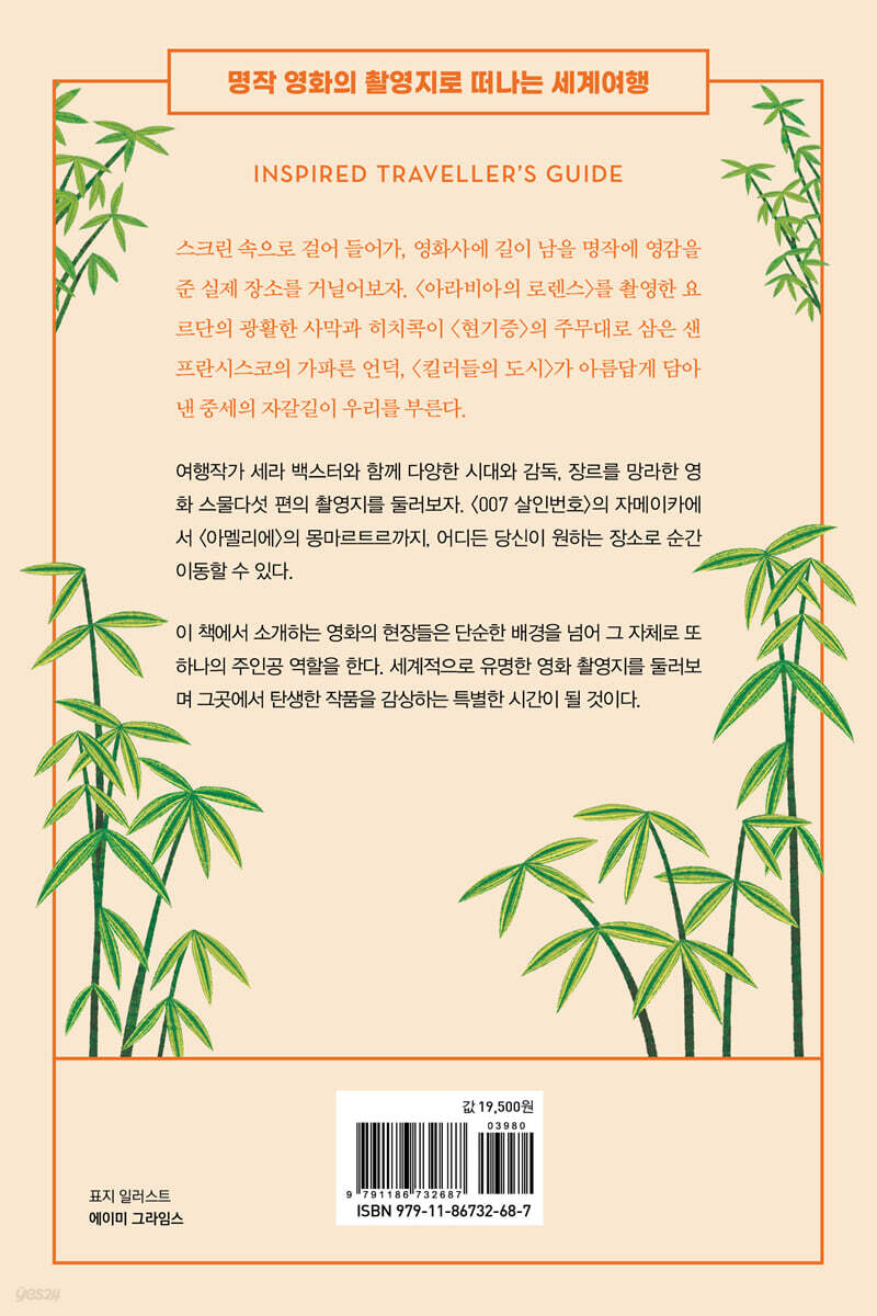 영화 속 명장면을 체험해보려고 구체적인 장소를 찾는 경우도 있다. [해리가 샐리를 만났을 때]의 성지 순례자들이 뉴욕 카츠 델리Katz’s Deli에서 ‘지금 저 여자가 먹는 것’을 주문한다든지, 해리 포터 시리즈의 팬들이 스코틀랜드에서 재커바이트 열차(Jacobite Steam Railway, 일명 호그와트 급행 열차)를 타보려고 안달하는 것이 좋은 예이다. --- p.8~9 영화 [판의 미로Pan’s Labyrinth]의 감독 겸 작가인 기예르모 델 토로Guillermo del Toro는 파시스트 정권하에 폭력이 난무하던 스페인의 현실과 어린 소녀가 상상하는 동화 같은 세계를 하나로 엮어냈다. 영화가 진행되는 내내 섬뜩한 장면들이 주마등처럼 흘러간다. 주인공 소녀 오필리아(이바나 바쿠에로Ivana Baquero 분)는 임신 중인 엄마와 함께 산속 마을로 이사한다. 새아버지이자 팔랑헤 당원인 비달 대위(세르지 로페즈Sergi Lopez 분)가 그곳에 주둔하고 있기 때문이다. 외부로부터 고립된 야만적인 병영에 내던져진 오필리아는 곧바로 환상의 세계로 빠져들고, 현실과 환상의 영역을 오가며 양쪽에서 서로 다른 괴물을 마주한다. -스페인, 벨치테/과다라마산맥 --- p.40~42 꼬불꼬불한 길, 낭만적인 다리, 길쭉한 탑으로 둘러싸인 이 도시는 흡사 동화 속에서 튀어나온 것 같다. 박공지붕을 얹은 오래된 집들이 다닥다닥 붙어 있고, 거리에선 말발굽 소리가 울려 퍼지며, 잔잔한 운하 위로 백조가 우아하게 물을 가른다. 디즈니도 울고 갈 만한 완벽한 마법의 왕국이건만, 이곳에서 전개될 영화는 디즈니 애니메이션이 아닌 [킬러들의 도시In Bruges](감독 마틴 맥도나Martin MaDonagh)이다. 안타깝게도 천국 같은 도시가 누군가에겐 지옥이 되고 만다. 신참 살인청부업자인 레이(콜린 파렐Colin Farrell 분)는 첫 번째 임무 중에 실수로 무고한 소년을 죽이는 바람에, 선배인 켄(브렌단 글리슨Brendan Gleeson 분)과 함께 브뤼헤에 몸을 숨긴다. -벨기에, 브뤼헤 --- p.56~58 용광로처럼 불타오르는 사막. 뜨거운 기운이 일렁이고 모래바람이 휘몰아치는 지평선 너머에서 거무스름한 점이 하나 나타난다. 신기루처럼 아련하게 어른거린다. 작은 점이 서서히 커진다. 사위가 조용한 가운데, 모래를 차내는 나지막한 발굽 소리만이 끈질기게 이어진다. 낙타를 탄 사람의 형상이 스크린을 향해 서서히, 답답할 정도로 천천히 다가온다. 낯선 인물의 얼굴을 확인하는 데 거의 영겁에 가까운 시간이 걸린다. 관객은 그저 기다리며 익숙해질 수밖에 없다. 이곳에서는 시간과 기온, 거리는 물론이고 인간의 삶까지도 전혀 다른 리듬으로 흘러가니까. 데이비드 린David Lean 감독의 [아라비아의 로렌스Lawrence of Arabia]는 경이로운 영웅담과 압도적인 스케일, 210분에 달하는 러닝타임, 끝을 가늠할 수 없는 광활한 배경 등 대서사시로서의 요건을 빠짐없이 갖추고 있다. -요르단, 와디 럼 --- p.103~104 뭄바이는 어딜 가나 북적인다. 인구 천 2백만의 이 거대 도시에는 인도의 최상층과 최하층이 모두 모여 북새통을 이루며 살고 있다. 소란과 갈등의 도시이자 몬순형 폭우와 지독한 폭염의 도시이며, 인파에 짓눌리면서도 외로움이 사무치는 도시이다. 감독 겸 작가인 리테쉬 바트라Ritesh Batra는 이 도시를 무대로 예스러우면서도 현대적인 로맨스극을 탄생시켰다. 뭄바이의 자랑인 도시락 배달 서비스 다바왈라dabbawala가 보기 드문 오배송 사고를 내는 바람에, 남편의 무관심에 괴로워하는 일라(님랏 카우르Nimrat Kaur 분)와 과묵한 홀아비 사잔(이르판 칸Irrfan Khan 분)은 도시락을 통해 편지를 주고받으며 순수한 애정을 싹틔운다. -인도, 뭄바이 --- p.112~114 김씨 가족은 어리숙한 박 사장 가족을 속여 각자 그 집에서 일자리를 얻는다. 높은 세상으로 올라가 상류 계급과 어울리게 된 것이다. 그곳에 이르려면 말 그대로 기어 올라가야 한다. 그런 뜻에서 봉준호 감독은 [기생충]을 ‘계단 영화’라고 표현했다. 이를 가장 상징적으로 보여주는 것이 서울의 중심부인 종로구에 자리한 자하문 터널 계단이다. 박 사장 저택에서 의외의 사건이 발생하자, 그곳을 도망쳐 나온 김씨 가족은 세차게 쏟아지는 비를 맞으며 이 길고도 음울한 계단을 내려간다. 이어서 어두침침한 터널을 지난 이들은 폭우로 침수된 자신들의 반지하 집에 도착한다. 부유층과 빈곤층의 격차가 가장 뚜렷하게 대비되는 순간이다. -대한민국, 서울 --- p.135 [레버넌트: 죽음에서 돌아온 자The Revenant](감독 알레한드로 곤잘레스 이냐리투Alejandro Gonzalez Inarritu)는 로키산맥이라는 가혹한 대자연을 배경으로 비극과 역경, 복수와 인내에 관해 이야기한다. 원시적이고 단순하게, 언어가 아닌 침묵으로 더 많은 것을 설명해준다. 이리저리 배회하는 카메라워크와 산속 풍경의 상호작용, 그리고 시시각각 변하는 빛을 통해 조명되는 자연의 아름다움과 난폭함이야말로 이 영화의 진정한 주역이다. 촬영 감독인 엠마누엘 루베즈키Emmanuel Lubezki가 아카데미 촬영상을 거머쥔 것은 당연한 결과라고 할 수 있다. -캐나다, 앨버타 --- p.162 [모터사이클 다이어리The Motorcycle Diaries]는 에르네스토 게바라Ernesto Guevara가 전설적인 혁명가 ‘체Che’로 거듭나기 이전의 이야기이다. 에르네스토는 1952