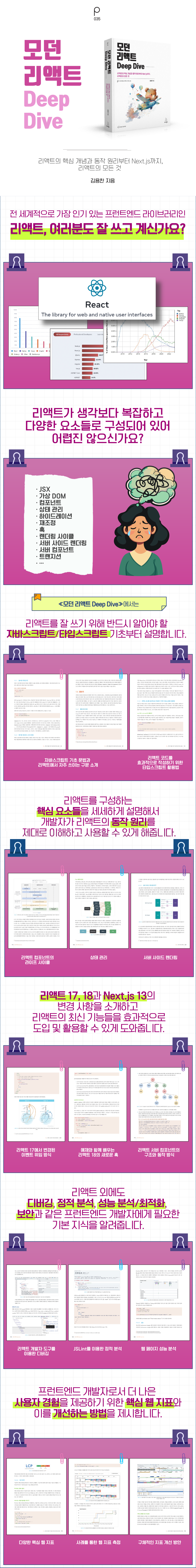 __왜 리액트인가? __리액트의 역사 __2010년대 프런트엔드 개발 환경을 향한 페이스북의 도전 __BoltJS의 등장과 한계 __페이스북 팀의 대안으로 떠오른 리액트 __리액트에 대한 회의적인 의견과 비판 __드디어 빛을 보는 리액트 __리액트의 현재와 미래 01장: 리액트 개발을 위해 꼭 알아야 할 자바스크립트 1.1 자바스크립트의 동등 비교 __1.1.1 자바스크립트의 데이터 타입 __1.1.2 값을 저장하는 방식의 차이 __1.1.3 자바스크립트의 또 다른 비교 공식, Object.is __1.1.4 리액트에서의 동등 비교 __1.1.5 정리 1.2 함수 __1.2.1 함수란 무엇인가? __1.2.2 함수를 정의하는 4가지 방법 __1.2.3 다양한 함수 살펴보기 __1.2.4 함수를 만들 때 주의해야 할 사항 __1.2.5 정리 1.3 클래스 __1.3.1 클래스란 무엇인가? __1.3.2 클래스와 함수의 관계 __1.3.3 정리 1.4 클로저 __1.4.1 클로저의 정의 __1.4.2 변수의 유효 범위, 스코프 __1.4.3 클로저의 활용 __1.4.4 주의할 점 __1.4.5 정리 1.5 이벤트 루프와 비동기 통신의 이해 __1.5.1 싱글 스레드 자바스크립트 __1.5.2 이벤트 루프란? __1.5.3 태스크 큐와 마이크로 태스크 큐 __1.5.4 정리 1.6 리액트에서 자주 사용하는 자바스크립트 문법 __1.6.1 구조 분해 할당 __1.6.2 전개 구문 __1.6.3 객체 초기자 __1.6.4 Array 프로토타입의 메서드: map, filter, reduce, forEach __1.6.5 삼항 조건 연산자 __1.6.6 정리 1.7 선택이 아닌 필수, 타입스크립트 __1.7.1 타입스크립트란? __1.7.2 리액트 코드를 효과적으로 작성하기 위한 타입스크립트 활용법 __1.7.3 타입스크립트 전환 가이드 __1.7.4 정리 02장: 리액트 핵심 요소 깊게 살펴보기 2.1 JSX란? __2.1.1 JSX의 정의 __2.1.2 JSX 예제 __2.1.3 JSX는 어떻게 자바스크립트에서 변환될까? __2.1.4 정리 2.2 가상 DOM과 리액트 파이버 __2.2.1 DOM과 브라우저 렌더링 과정 __2.2.2 가상 DOM의 탄생 배경 __2.2.3 가상 DOM을 위한 아키텍처, 리액트 파이버 __2.2.4 파이버와 가상 DOM __2.2.5 정리 2.3 클래스형 컴포넌트와 함수형 컴포넌트 __2.3.1 클래스형 컴포넌트 __2.3.2 함수형 컴포넌트 __2.3.3 함수형 컴포넌트 vs. 클래스형 컴포넌트 __2.3.4 정리 2.4 렌더링은 어떻게 일어나는가? __2.4.1 리액트의 렌더링이란? __2.4.2 리액트의 렌더링이 일어나는 이유 __2.4.3 리액트의 렌더링 프로세스 __2.4.4 렌더와 커밋 __2.4.5 일반적인 렌더링 시나리오 살펴보기 __2.4.6 정리 2.5 컴포넌트와 함수의 무거운 연산을 기억해 두는 메모이제이션 __2.5.1 주장 1: 섣부른 최적화는 독이다, 꼭 필요한 곳에만 메모이제이션을 추가하자 __2.5.2 주장 2: 렌더링 과정의 비용은 비싸다, 모조리 메모이제이션해 버리자 __2.5.3 결론 및 정리 03장: 리액트 훅 깊게 살펴보기 3.1 리액트의 모든 훅 파헤치기 __3.1.1 useState __3.1.2 useEffect __3.1.3 useMemo __3.1.4 useCallback __3.1.5 useRef __3.1.6 useContext __3.1.7 useReducer __3.1.8 useImperativeHandle __3.1.9 useLayoutEffect __3.1.10 useDebugValue __3.1.11 훅의 규칙 __3.1.12 정리 3.2 사용자 정의 훅과 고차 컴포넌트 중 무엇을 써야 할까? __3.2.1 사용자 정의 훅 __3.2.2 고차 컴포넌트 __3.2.3 사용자 정의 훅과 고차 컴포넌트 중 무엇을 써야 할까? __3.2.4 정리 04장: 서버 사이드 렌더링 4.1 서버 사이드 렌더링이란? __4.1.1 싱글 페이지 애플리케이션의 세상 __4.1.2 서버 사이드 렌더링이란? __4.1.3 SPA와 SSR을 모두 알아야 하는 이유 __4.1.4 정리 4.2 서버 사이드 렌더링을 위한 리액트 API 살펴보기 __4.2.1 renderToString __4.2.2 renderToStaticMarkup __4.2.3 renderToNodeStream __4.2.4 renderToStaticNodeStream __4.2.5 hydrate __4.2.6 서버 사이드 렌더링 예제 프로젝트 __4.2.7 정리 4.3 Next.js 톺아보기 __4.3.1 Next.js란? __4.3.2 Next.js 시작하기 __4.3.3 Data Fetching __4.3.4 스타일 적용하기 __4.3.5 _app.tsx 응용하기 __4.3.6 next.config.js 살펴보기 __4.3.7 정리 05장: 리액트와 상태 관리 라이브러리 5.1 상태 관리는 왜 필요한가? __5.1.1 리액트 상태 관리의 역사 __5.1.2 정리 5.2 리액트 훅으로 시작하는 상태 관리 __5.2.1 가장 기본적인 방법: useState와 useReducer __5.2.2 지역 상태의 한계를 벗어나보자: useState의 상태를 바깥으로 분리하기 __5.2.3 useState와 Context를 동시에 사용해 보기 __5.2.4 상태 관리 라이브러리 Recoil, Jotai, Zustand 살펴보기 __5.2.5 정리 06장: 리액트 개발 도구로 디버깅하기 6.1 리액트 개발 도구란? 6.2 리액트 개발 도구 설치 6.3 리액트 개발 도구 활용하기 __6.3.1 컴포넌트 __6.3.2 프로파일러 6.4 정리 07장: 크롬 개발자 도구를 활용한 애플리케이션 분석 7.1 크롬 개발자 도구란? 7.2 요소 탭 __7.2.1 요소 화면 __7.2.2 요소 정보 7.3 소스 탭 7.4 네트워크 탭 7.5 메모리 탭 __7.5.1 자바스크립트 인스턴스 VM 선택 __7.5.2 힙 스냅샷 __7.5.3 타임라인 할당 계측 __7.5.4 할당 샘플링 7.6 Next.js 환경 디버깅하기 __7.6.1 Next.js 프로젝트를 디버그 모드로 실행하기 __7.6.2 Next.js 서버에 트래픽 유입시키기 __7.6.3 Next.js의 메모리 누수 지점 확인하기 7.7 정리 08장: 좋은 리액트 코드 작성을 위한 환경 구축하기 8.1 ESLint를 활용한 정적 코드 분석 __8.1.1 ESLint 살펴보기 __8.1.2 eslint-plugin과 eslint-config __8.1.3 나만의 ESLint 규칙 만들기 __8.1.4 주의할 점 __8.1.5 정리 8.2 리액트 팀이 권장하는 리액트 테스트 라이브러리 __8.2.1 React Testing Library란? __8.2.2 자바스크립트 테스트의 기초 __8.2.3 리액트 컴포넌트 테스트 코드 작성