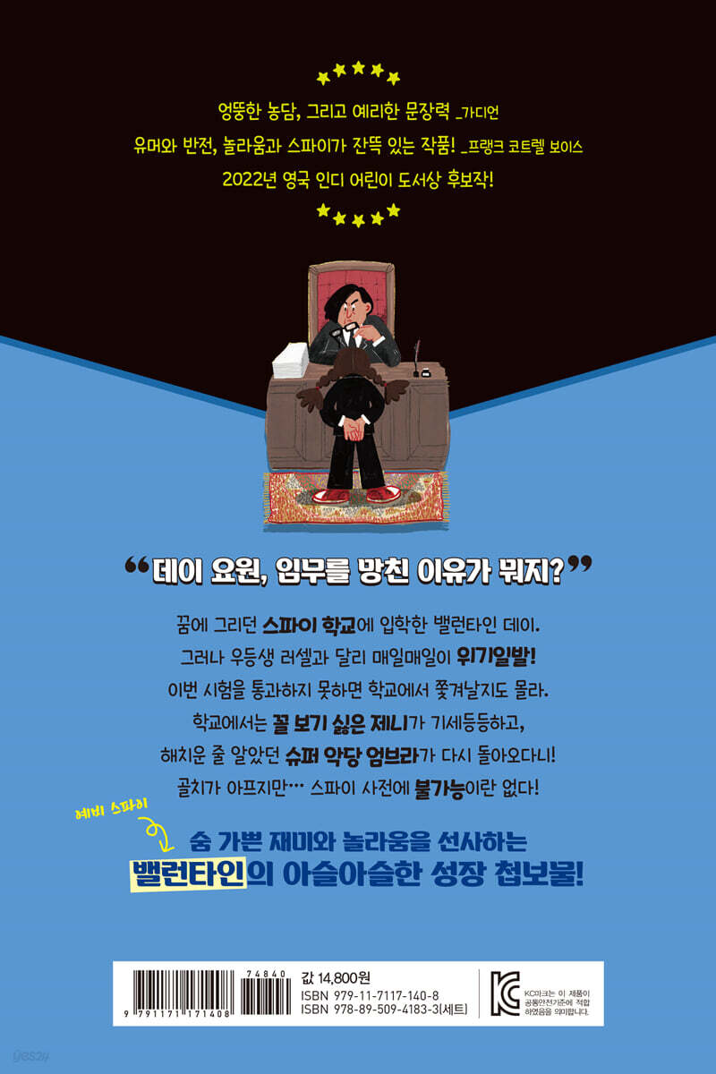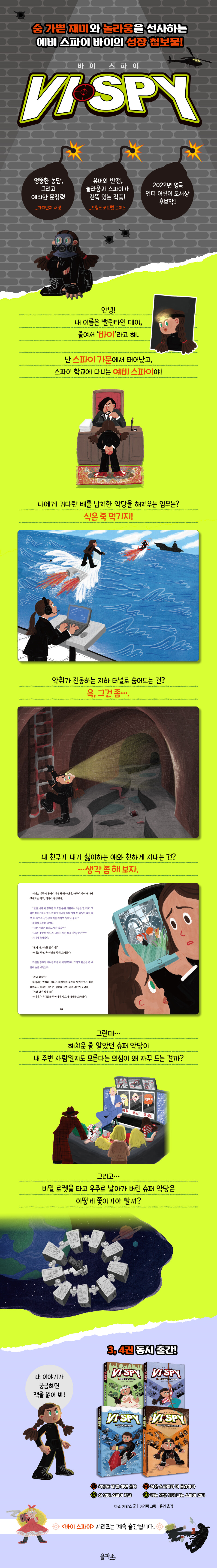 스파이 학교생활은 산 넘어 산!? 예비 스파이 앞에 닥친 문제들을 해결하라! 스파이 집안에서 태어난 주인공 밸런타인 데이(줄여서 ‘바이’). 스파이였던 엄마 이스터 데이와 바이의 담임 선생님 조지 스프라우트의 결혼식 날, 죽은 줄 알았던 아빠 로버트 포드가 등장했습니다. 그런데 알고 보니 아빠는 세계 2위 악당이었다니요!? 그리고 아빠의 차에서 몰래 훔친 수상한 휴대폰이 사실은 슈퍼 악당 엄브라가 노리는 테러 무기 뉴로트롤이었다니요!? 뉴로트롤을 손에 넣으려 하는 엄브라가 어마어마하고 무시무시한 짓을 일삼지만, 바이는 용감하게 전직 스파이, 그리고 구 악당 연합회와 힘을 합쳐 슈퍼 악당을 물리칩니다! 이번 이야기에서 바이는 그 공로를 인정받아 꿈에 그리던 스파이 학교 리밍턴 홀에 입학하게 됩니다. 하지만… 상황은 ‘산 넘어 산’!? 스파이 학교에서는 꼴찌를 도맡아 쫓겨날 위기에 처한 데다, 해치운 줄 알았던 악당이 다시 모습을 드러내고, 가까웠던 동료들도 수상한 행동을 일삼으며, 골치 아픈 문제들이 연달아 터지기 시작합니다. 예비 스파이 바이는 과연 자신 앞에 놓인 문제들을 해결할 수 있을까요? 매력 넘치는 스파이와 악당 들이 선사하는 완벽한 웃음과 반전! 예비 스파이 밸런타인 주위에는 스파이와 악당, 또 괴짜 들이 넘쳐납니다. 이로 인해 여러 가지 사건 사고가 끊이지 않지만, 영국에서 큰 반향을 일으켰던 베스트셀러 시리즈의 작가 마즈 에반스는 오히려 속도감 넘치는 유머로 이야기를 풀어나갑니다. 대를 이어온 스파이 가문에서 태어나 뛰어난 활약을 펼쳤던 의심 많은 스파이 엄마, 온갖 범죄를 저질렀던 과거를 버리고 이제는 바이를 도우며 새로운 삶을 살고 있는 친아빠, 그리고 늘 엉뚱한 이야기만 늘어놓는 선생님 새아빠, 로봇 마니아지만 친엄마와의 사이는 계속 틀어지기만 하는 의붓남매 러셀, 어딘지 수상한 동료 스파이들과 착해지려는 악당까지…. 주변을 둘러싼 개성 넘치는 인물들과 얽히고설킨 관계 속에서 바이는 조금씩 성장하는 모습을 보여줍니다. [바이 스파이] 시리즈는 엄마 아빠의 이혼과 새 가족의 탄생, 그리고 순탄치 않은 학교생활 같은 일상 속 문제와 함께 전 세계적인 범죄 조직의 위협에 맞서 싸우는 예비 스파이의 활약도 담고 있습니다. 가끔은 스파이 엄마처럼, 또 가끔은 악당 아빠처럼, 자신만의 방식으로 고민을 해결해 가는 바이, 그리고 바이의 곁을 지키는 특별하지만 평범한 사람들과의 관계를 통해 어린이 독자들도 자신만의 장점을 찾고 용기를 얻게 될 것입니다. |