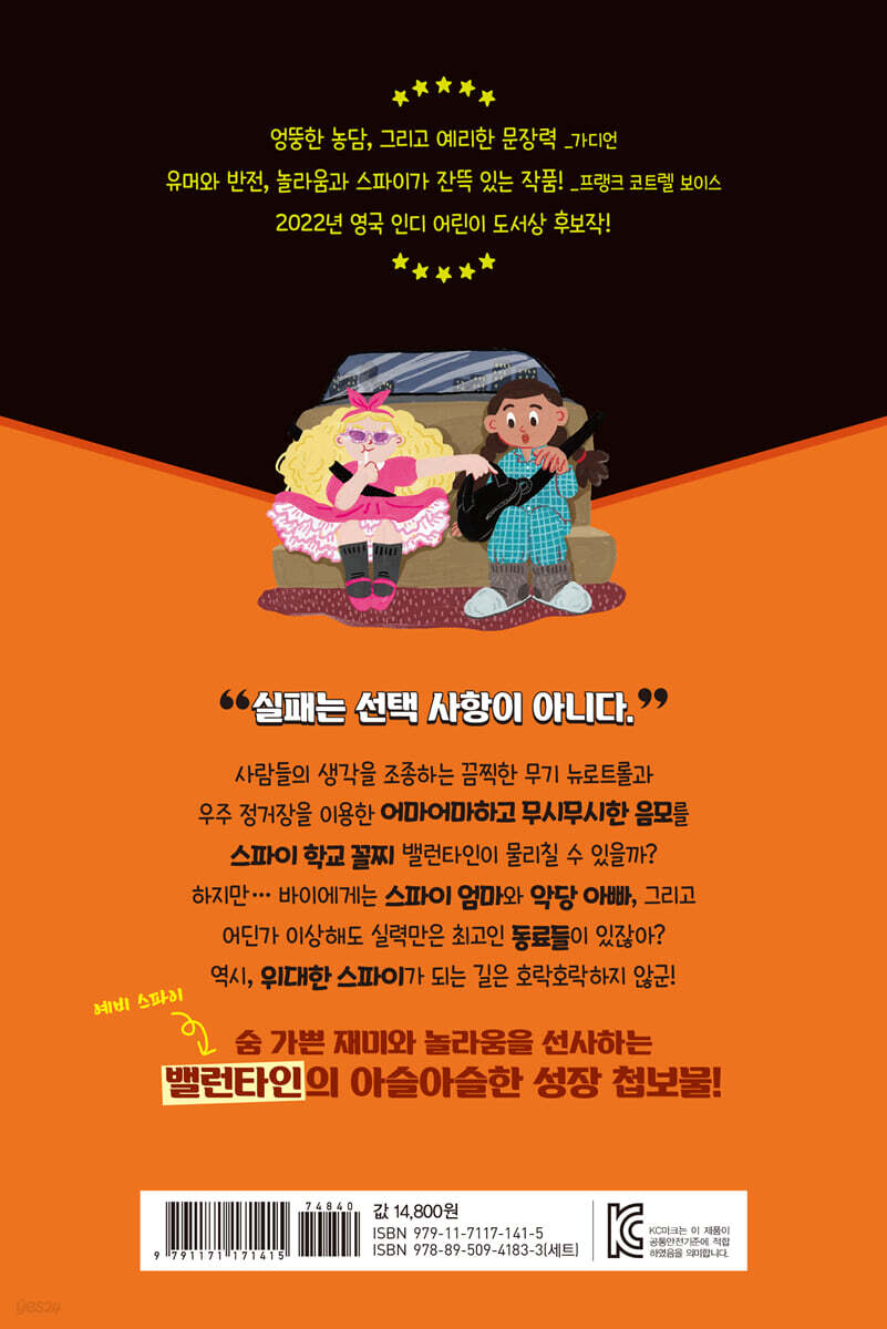 스파이에게 실패는 선택 사항이 아니야! 뛰는 악당 위엔 언제나 나는 스파이가 있다!! 스파이 집안에서 태어난 주인공 밸런타인 데이(줄여서 ‘바이’). 스파이였던 엄마 이스터 데이와 바이의 담임 선생님 조지 스프라우트의 결혼식 날, 죽은 줄 알았던 세계 2위 악당 아빠 로버트 포드가 깜짝 등장했습니다. 때맞춰 바이 앞에 나타난 슈퍼 악당 엄브라는 자신을 배신한 아빠가 빼돌린 테러 무기 뉴로트롤을 노리며 어마어마하고 무시무시한 짓을 일삼고 다닙니다. 엄마의 뒤를 이어 스파이가 되고 싶은 바이는 주변 사람들과 힘을 합쳐 엄브라의 계획을 물거품으로 만들고, 꿈에 그리던 스파이 학교 리밍턴 홀에 입학할 수 있는 자격을 스스로 얻어 냅니다. 하지만 스파이 학교생활은 생각처럼 녹록하지 않습니다. 시험을 볼 때마다 잘못된 판단을 내려 학교에서 쫓겨날 위기에 처하고, 예비 남매 러셀은 바이와 가장 사이가 안 좋은 제니와 친하게 지내는 데다, 믿었던 스파이 동료들이 의심스런 행동을 하고, 엎친 데 덮친 격으로 바이 앞에 다시금 모습을 드러낸 악당 엄브라는 테러 무기를 훔쳐 우주로 도망쳐 버립니다!! 하지만 뛰는 악당 위엔 언제나 나는 스파이가 있는 법, 바이는 과연 우주로 도망친 악당을 막을 방법을 찾아낼 수 있을까요? 스파이와 악당 들이 선사하는 완벽한 웃음과 반전! 예비 스파이 밸런타인 주위에는 스파이와 악당, 또 괴짜 들이 넘쳐납니다. 이로 인해 여러 가지 사건 사고가 끊이지 않지만, 영국에서 큰 반향을 일으켰던 베스트셀러 시리즈의 작가 마즈 에반스는 오히려 속도감 넘치는 유머로 이야기를 풀어나갑니다. 대를 이어온 스파이 가문에서 태어나 뛰어난 활약을 펼쳤던 의심 많은 스파이 엄마, 온갖 범죄를 저질렀던 과거를 버리고 이제는 바이를 도우며 새로운 삶을 살고 있는 친아빠, 그리고 늘 엉뚱한 이야기만 늘어놓는 선생님 새아빠, 로봇 마니아지만 친엄마와의 사이는 계속 틀어지기만 하는 의붓남매 러셀, 어딘지 수상한 동료 스파이들과 착해지려는 악당까지…. 주변을 둘러싼 개성 넘치는 인물들과 얽히고설킨 관계 속에서 바이는 조금씩 성장하는 모습을 보여줍니다. [바이 스파이] 시리즈는 엄마 아빠의 이혼과 새 가족의 탄생, 그리고 순탄치 않은 학교생활 같은 일상 속 문제와 함께 전 세계적인 범죄 조직의 위협에 맞서 싸우는 예비 스파이의 활약도 담고 있습니다. 가끔은 스파이 엄마처럼, 또 가끔은 악당 아빠처럼, 자신만의 방식으로 고민을 해결해 가는 바이, 그리고 바이의 곁을 지키는 특별하지만 평범한 사람들과의 관계를 통해 어린이 독자들도 자신만의 장점을 찾고 용기를 얻게 될 것입니다. |