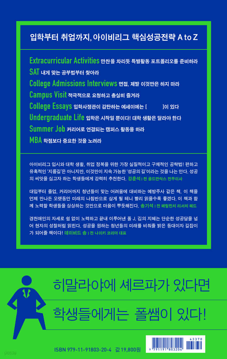 프롤로그: 힘든 산길에 셰르파가 있듯 대학으로 가는 길에는 폴쌤이 있다! · 대입 타임라인 · PART 1· 대입 정복하기 1. 왜 아이비리그인가? 28 내가 하버드를 꿈꾼 이유/ 목표가 있을 때 전심전력할 수 있다 2. 당신이 아이비리그를 꿈꿔야 하는 진짜 이유 31 열정을 엔진으로 삼아라/ 배움의 질이 다르다/ 우수한 학생들 사이에서 성장하라/ 가성비를 고려하라 3. 대학 입학사정위원회, 그들은 누구인가? 37 대학은 학교의 가치를 높여줄 학생을 원한다/ 입학사정관은 어떤 기준으로 학생을 평가하는가?/ 성적은 중요하지만, 성적이 전부는 아니다 4. 내신 관리하기 42 과목을 고를 때는 현실주의자가 되라/ 선생님은 중요하다 5. 특별활동은 왜 중요한가 45 입학사정관이 특별활동을 평가하는 이유/ 특별활동 포트폴리오, 어떻게 구성해야 하는가/ 주요 특별활동과 학업 사이에서 균형 잡기/ 부차적인 특별활동의 의미 6. SAT 준비하기 52 SAT, 학원에서 공부해야 할까?/ 유행에 따르는 대신 내게 맞는 공부법을 찾아라 7. 여름방학 보내기 55 여름방학은 기회다!/ 조지타운 여름 프로그램 폴쌤이 묻고 학생들이 답하다 - 여름방학, 어떻게 보내야 할까? · 고등학생을 대상으로 한 다양한 여름 캠프 · 8. 아르바이트와 인턴십 71 일이 우리에게 가르쳐주는 것들/ 돈은 스승이다 폴쌤이 묻고 학생들이 답하다 - 아르바이트, 해봤어? 9. 지원할 대학 선택하기 83 명성이 전부가 아니다/ 지피지기, 학교를 알고 나를 알아야 한다 10. 대입 추천서 준비하기 86 교과목 교사 추천서와 비교과목 추천서/ 추천서 부탁에 왕도가 있다면… 11. 면접시험 준비하기 91 면접이 중요한 이유/ 사회성은 면접의 열쇠다/ 면접에서 해야 하는 것과 하지 말아야 하는 것/ 면접 전 준비할 몇 가지 답변/ 면접에서 물어야 하는 몇 가지 질문 12. 대학 견학, 해야 할까? 103 대학 견학에서 얻을 수 있는 것/ 적극적으로 요청하고 충실히 즐겨라 폴쌤이 묻고 학생들이 답하다 - 대학 견학, 어땠어? 13. 대입 에세이 쓰기 113 에세이는 학생의 목소리 그 자체다/ 좋은 에세이의 조건/ 나의 대입 에세이 폴쌤이 묻고 학생들이 답하다 - 대입 에세이, 어떻게 준비했어? 14. 조기 지원, 해야 할까? 135 얼리 액션과 얼리 디시전/ 조기 지원의 이점과 위험성 15. 다시 대입을 치른다면… 138 장학 프로그램에 지원했더라면/ 커리어에 대해 더 진지하게 고민했더라면/ 청소년을 위한 커리어 지침서 폴쌤이 묻고 학생들이 답하다 - 한국에서 공부한 후 미국 대학에 들어간 경험은? PART 2· 대학 생활 정복하기 1. 대학에서 목표 세우기 148 대학에 들어갔다. …그다음엔?/ 대학은 끝이 아니라 시작이다 2. 고등학생이 대학생이 되기까지 151 대학에서 길을 잃다/ 스스로 목표를 세우고 홀로 서는 시기 3. 어떤 전공을 선택할 것인가? 155 전공을 찾는 것은 자아를 찾는 것이다/ 대학은 최고의 학자에게 배울 기회다 4. 전공은 대학 생활에 어떤 영향을 끼치는가? 159 대학 공부법은 다르다/ 멘토를 찾고 그들의 조언에 귀를 기울여라/ 글쓰기가 성공을 결정한다 폴쌤이 묻고 학생들이 답하다 - 영어 글쓰기 능력, 어떻게 개발했어? 5. 다시 전공을 선택할 수 있다면 176 기술 중심의 전공과 학문 중심의 전공/ 기술 중심의 전공은 취업 가능성을 높인다/ 진로가 불분명하다면 최대한 많은 선택지를 확보하라 6. 진로 탐색하기 181 대학생 앞에 놓인 다섯 가지 길/ 다섯 가지 길이 전부일까? 폴쌤이 묻고 학생들이 답하다 - 메디컬 스쿨, 어떻게 준비했어? 7. 경영 컨설팅과 투자은행 190 경영 컨설팅과 투자은행이란 무엇인가/ 대학 졸업생은 어떤 일을 하는가 8. 캠퍼스 활동 196 커리어를 고려한 활동을 하라/ 좋은 활동이 주어지지 않는다면 스스로 찾아라/ 즐거운 활동도 필요하다 폴쌤이 묻고 학생들이 답하다 - 봉사활동, 동아리, 인턴십, 아르바이트… 캠퍼스 활동, 어떻게 하고 있어? 9. 대학생의 여름방학, 어떻게 보낼까? 215 여름방학을 성공적으로 보내는 두 가지 방법/ 나의 여름방학 10. 다시 대학생이 된다면… 220 토론팀 활동을 했더라면/ 스페인어를 계속 공부했더라면 PART 3· 커리어 정복하기 1. 커리어를 고민하는 대학생에게 224 기술과 경험이 모든 것을 압도한다 2. 사멕앤드파뉼: 보스턴 소규모 로펌 226 창의적으로 기회를 잡아라 3. CJ인터내셔널: 국제적인 한국 로펌 228 인맥은 기회를 열어준다 4. 광장: 국제적인 한국 로펌 230 미래에 도움이 될 직업을 찾아라/ 경험자에게 조언을 구하라/ 목표 수정이 필요한 순간 5. 베인앤드컴퍼니: 경영 컨설팅 회사 235 국제적인 커리어를 쌓다/ 좋은 상사는 좋은 직업보다 중요하다/ 멘토와 협력자를 찾아라/ 커리어보다 중요한 것 6. JP모건체이스: 월스트리트 금융사 242 전문적인 기술은 때로 학벌보다 중요하다/ 학위의 필요성을 절감한 순간 7. 컬럼비아 경영대학원: MBA 245 경영대학원에서의 성공이란?/ 고액 연봉과 삶의 질의 상관관계/ 장기적인 관점에서 커리어를 추구하라/ 좋은 회사를 알아보는 법 8. 일라이릴리앤드컴퍼니: 글로벌 제약회사 253 취업은 현실이다/ 기회가 많은 곳에 터를 잡아라 9. 존슨앤드존슨: 글로벌 헬스케어 기업 256 모든 포지션이 중요하다/ 회사 내에