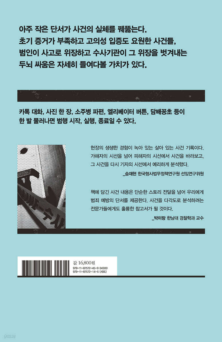 현장의 생생한 경험이 녹아 있는 살아 있는 사건 기록이다. 가해자의 시선을 넘어 피해자의 시선에서 사건을 바라보고, 그 사건을 다시 기자의 시선에서 예리하게 분석했다. - 승재현 (한국형사법무정책연구원 선임연구위원)