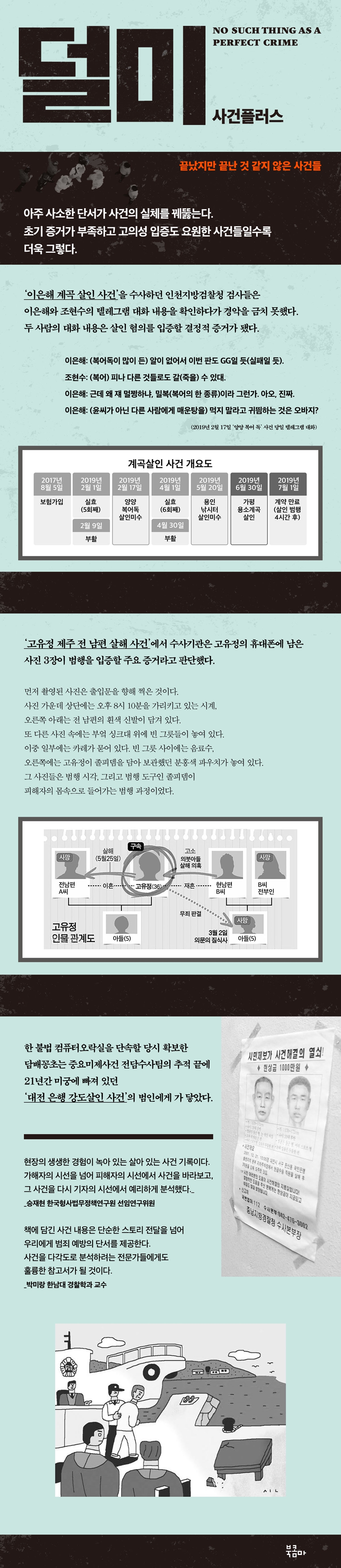 --- p.19 “극심한 생활고에 빠지고 주변 관계가 단절된 윤씨에게 다이빙은 이은해에 대한 구애이자 소속감 증명을 위한 행위였을 것이다.” --- p.35 한가롭기만 한 5월 한낮 동백항에 경차 한 대가 바다를 바라보고 주차돼 있다. 차량엔 두 명이 타고 있다. 둘은 남매간이다. --- p.45 대법원은 길게 말하지 않았다. “추측”에 불과하다고 했다. 산부인과에서 바꿔치기가 일어났다고 한 정황들을 하나도 인정하지 않았다. --- p.64 경찰은 집 안에서 ‘엄마가 숨을 쉬지 않는다. 2020년 8월’이라고 쓴 쪽지를 찾아냈다. 정씨는 시신 근처에서 턱을 괸 채 앉아 있었다. --- p.86 A씨의 항소심 재판부는 형법 제252조 1항의 ‘승낙’을 면밀히 살펴야 했다. 피고인 측이 피해자들로부터 함께 죽자는 취지의 승낙을 받았으므로 범행에 대해 형법상 ‘단순 살인’이 아니라 ‘승낙 살인’을 적용하는 게 맞다고 항소해서다. --- p.107 2022년 12월 16일 낮 12시 10분 김씨는 제주 오라동의 한 주택에 몰래 침입해 3시간이나 기다렸다. --- p.110 항소심은 사형 선고를 할지 말지 고민에 고민을 거듭한 끝에 검찰의 항소를 기각하고 이기영에게 원심과 같이 무기징역을 선고했다. --- p.197 “하루는 짐 싸들고 이동하고 있었는데 갑자기 숨을 못 쉬겠더라고요. 바로 여행 가방을 열어 길바닥에 다 쏟아낸 다음 그 안에 숨었어요.” --- p.267 둘이 함께 엘리베이터를 탔을 때 김씨는 뒤쪽의 거울로 다가가 얼굴을 보는 반면 윤씨는 가장자리에 서서 층수 버튼을 누르고 있었다. --- p.279 |