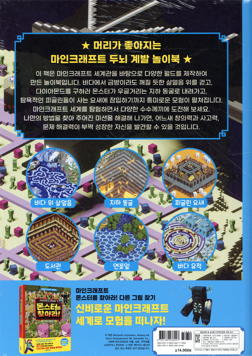 『마인크래프트 함정을 탈출하라! 미로 찾기』 전 세계 비디오 게임 판매 1위, 마인크래프트 마인크래프트 장인조합, 일본 아마존 누적 판매 300만 부 돌파! 마인크래프트는 2009년 모장 스튜디오가 출시한 게임으로, 네모난 블록으로 이루어진 세계에서 건축이나, 동굴, 전투 등을 하며 플레이합니다. 2014년 모장 스튜디오가 마이크로소프트사에 인수되면서 전 세계에서 가장 인기 있는 최고의 게임으로 자리 잡았습니다. 2020년 기준 역대 가장 많이 팔린 비디오 게임을 기록하고 있으며, 미국 TIME지에서 선정한 최고의 비디오 게임 10선과 50선에 모두 이름을 올렸습니다. 마인크래프트 세계를 탐험하며 주어진 미션을 해결하자! 이 책은 마인크래프트 세계관을 바탕으로 다양한 월드를 제작하여 만든 놀이북입니다. 몬스터가 우글거리는 지하 동굴부터 탐욕적인 피글린들이 사는 네더 요새까지 신비로운 마인크래프트 세계를 탐험하면서 다양한 미션을 수행합니다. 흥미로운 수수께끼를 해결하는 과정에서 사고력과 창의력, 문제 해결력 등을 기를 수 있습니다. |