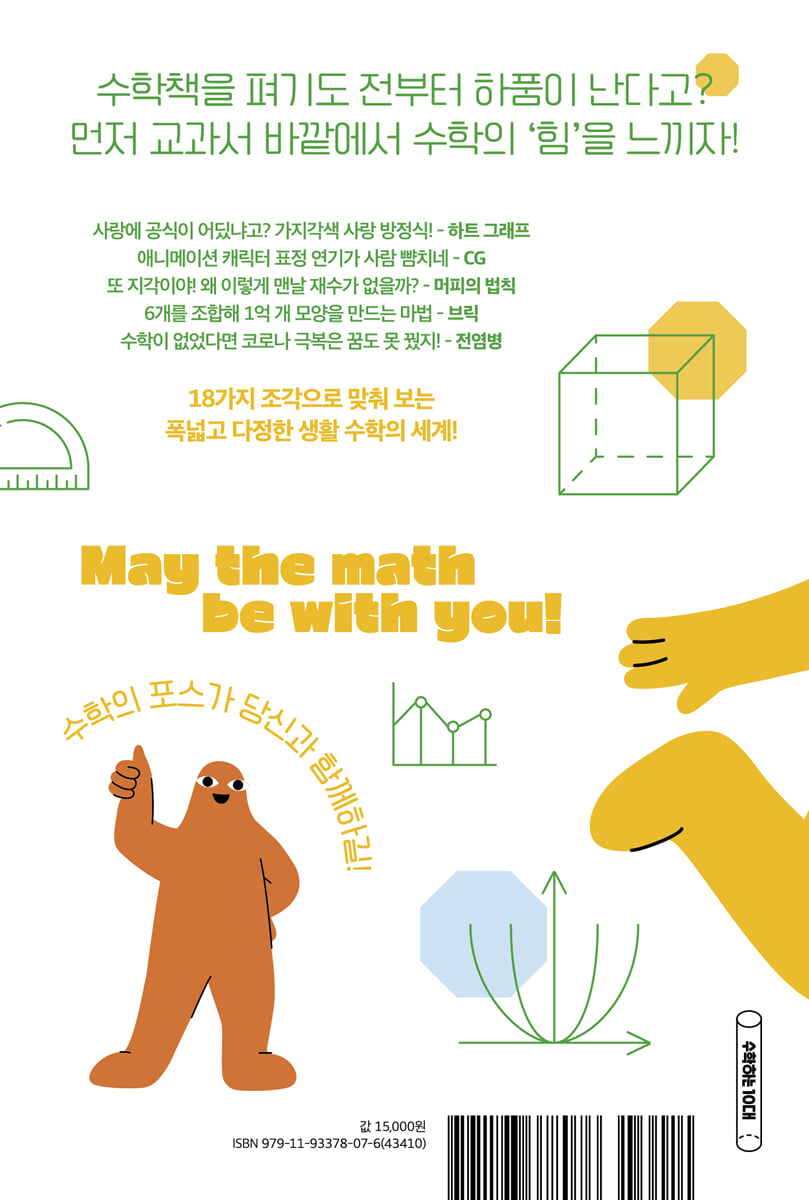 1부 ‘최애’ 콘텐츠와 함께하는 수학 01: 기러기 토마토 별똥별 우영우 · 데칼코마니 수 02: 유튜브와 넷플릭스가 ‘찐친’보다 내 맘을 잘 아는 비결 · 추천 알고리듬 03: 아이돌 노래 속에서 찾은 사랑 방정식 · 하트 그래프 04: 〈아바타〉의 판도라가 그토록 아름다운 이유 · CG 2부 아침부터 밤까지 일상과 함께하는 수학 05: 계산기에서 스마트워치까지, 컴퓨터의 진화 · 코드 06: 나는 왜 맨날 재수가 없을까? · 머피의 법칙 07: 라면은 곡선, 스파게티는 직선인 이유 · 면발 08: 황제펭귄이 가르쳐 준 보온의 비밀 · 패딩 09: ‘찰칵’ 찰나에 담긴 영원의 수학 · 카메라 3부 더 재밌고 더 안전한 놀이와 함께하는 수학 10: 모든 보드게임은 나로부터 · 주사위 11: 스릴과 안전을 동시에 · 롤러코스터 12: 아이들 놀이에서 최첨단 공학 기술까지 · 종이접기와 뫼비우스의 띠 13: 여섯 조각 레고로 만드는 1억 가지 세상 · 브릭 4부 막막한 미래와 함께하는 수학 14: 막을 순 없지만 대처할 순 있지 · 전염병 15: 내 손안의 드넓은 세상 · 메타버스와 라이프로깅 16: 내 얼굴도, 연어 얼굴도 식별 가능 · AI 얼굴 인식 17: 120년 넘은 수학 문제로 달리는 자동차 · 자율 주행 18: 지구 건강에는 수학이 특효약 · 기후 위기 나오며: ‘수’며드는 수학! |