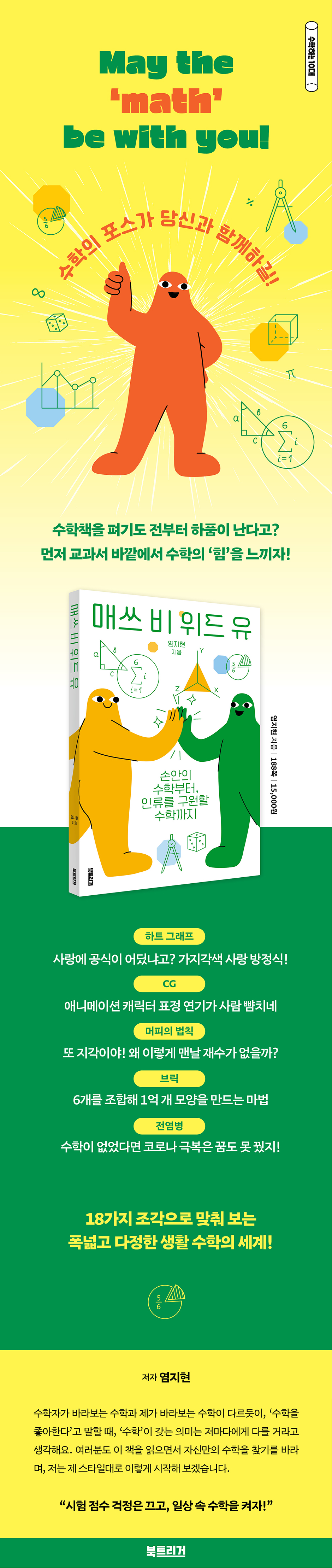 하지만 저처럼 다양한 형태의 ‘수학 콘텐츠’를 만드는 사람들은 조금 다른 방식으로 수학을 마주해요. 수학을 가볍게 다루고 싶거든요. 보통 여러분이 학교에서 만나는 수학은 언제나 심각하고 때론 괴롭기까지 하니까요. 적어도 학교 밖에서 수학을 만날 때는, 복잡하고 괴로운 수식은 빼고 생각하면 좋지 않을까요? 그래서 이 책에서는 어려운 수학 스위치는 잠시 끄고, 아주 쉽고 경쾌한 수학 스위치를 켜 보려고요. --- 「들어가며: 수학자의 수학이 아닌 ‘나의 수학’ 찾기」 중에서 예를 들어 볼까요? Y양은 평소 ‘썸’을 타던 C군에게 힘내라며 초콜릿을 건넸어요. 이때 ‘Y양이 C군에게 초콜릿을 건넬 확률’이 A이고, ‘Y양이 C군에게 고백할 확률’이 B라고 해 봅시다. 그럼 초콜릿을 건넸을 때 고백할 확률은 위의 조건부 확률 공식을 통해 구할 수 있다는 말이에요. ‘초콜릿을 건네지 않을 확률’이나 ‘고백하지 않을 확률’도 표본공간 S 안에 모두 존재하지만, P(고백|초콜릿을 건넸을 때)와 같은 조건부 확률을 계산할 때는 필요 없다고 보고 제외하는 겁니다. 이처럼 조건부 확률을 계산할 때는 확률 공간을 상황에 맞게 제한하고, 조건 밖에서 일어난 일은 전혀 고려하지 않아요. 이런 특징 때문에 조건부 확률이 추천 알고리듬에서 핵심 역할을 하는 거랍니다. 확률을 계산할 때 꼭 필요한 정보를 가려내 ‘특정 사건이 일어날 확률(사용자가 추천 제품이나 작품을 좋아할 확률)’의 정확도를 더 높일 수 있거든요. 이를테면 음악 스트리밍 사이트에서 최근 눈에 띄게 ‘남자 아이돌 가수의 노래’만 듣는 사용자에게는 굳이 트로트 장르의 노래를 추천하지 않는 것과 같은 맥락이죠. --- 「1부 ‘최애 콘텐츠와 함께하는 수학’」 중에서 매슈스는 2015년 11월, 스마트폰에 작용하는 중력을 토대로 ‘회전 운동 방정식’을 세웠습니다. 이 방정식에 따르면, 사람의 허리 높이에서 회전하며 떨어지는 스마트폰은 평균 한 바퀴 이상 돌기 때문에, 액정이 바닥에 닿을 확률이 더 높죠. 매슈스의 연구에서 보듯, 여러 차례의 반복된 실험을 통해 도출해 낸 확률을 경험적 확률이라고 합니다. 우리가 흔히 머피의 법칙이라고 여기는 현상 중 많은 경우가 경험적 확률이 높은 사건에 해당해요. 우산을 챙긴 날 비가 오지 않거나, 식빵을 떨어뜨렸을 때 잼을 바른 면이 바닥에 닿는 일도 그러한 경우라고 볼 수 있죠. 그러니까 나에게만 특별히 일어나는 불운이 아닌, 그저 발생할 확률이 높은 사건인 거예요. --- 「2부 ‘아침부터 밤까지 일상과 함께하는 수학’」 중에서 브릭은 여기서 더 나아가 인형처럼 다양한 캐릭터를 만드는 재미를 선사합니다. 서로 다른 얼굴 4개, 상의 3벌, 하의 2벌 브릭이 있다면, 서로 다른 스타일의 캐릭터를 몇 종류나 만들 수 있을까요? 얼굴 브릭 1개를 기준으로 3(상의)×2(하의)=6개 캐릭터를 만들 수 있는데 얼굴 브릭이 모두 4개이므로 전체 경우의 수는 4×6 =24개예요. 이렇게 여러 개 가운데서 순서에 상관없이 짝을 짓는 것을 ‘조합’이라고 해요. 1978년 처음 탄생한 브릭용 레고 캐릭터는 현재까지 1만 종류 이상이 나왔어요. 서로 다른 머리 스타일과 옷, 얼굴 표정 등을 다양하게 조합해 만들 수 있는 전체 경우의 수는 1,000조 개가 넘었고요. 레고 외의 다양한 회사가 만드는 캐릭터를 모두 포함하면 그 수는 상상을 초월하겠죠 --- 「3부 ‘더 재밌고 더 안전한 놀이와 함께하는 수학’」 중에서 얼굴 인식 기술을 최초로 연구한 사람은 누굴까요? 바로 수학자였어요. 1960년대 초 미국의 수학자 우디 블레소(1921~1995)는 동료와 함께 사람의 얼굴을 컴퓨터로 인식하는 프로그램을 개발해 이를 논문으로 자세히 공개했어요. 이 논문에는 얼굴의 눈·코·입·광대 등 스무 곳이 기준점으로 표시된 우디 블레소의 증명사진이 실렸어요. 우디 블레소는 자신의 사진 위에 펜으로 직접 그린 수십 개의 점과 선을 기준으로 그 원리를 설명했죠. 그다음 눈의 너비나 눈 사이의 거리, 입의 너비나 눈과 코 사이, 눈과 입 사이의 거리 등 두 점 사이의 거리를 측정해 그 값을 컴퓨터에 수치로 저장했어요. 여기에 자신들이 개발한 프로그램을 적용하면 컴퓨터가 여러 사진 속에서 같은 사람을 찾아낼 수 있다고 설명했습니다. 이렇게 컴퓨터를 활용한 얼굴 인식 기술이 세상의 주목을 받기 시작한 거죠. --- 「4부 ‘막막한 미래와 함께하는 수학’」 중에서 이 책에서는 수식을 최소로 하고, 최대한 그런 연결의 실마리를 담으려고 노력했어요. 꼭 수학 문제를 많이 풀고 어려운 문제를 잘 해결해야만 수학이 의미 있는 건 아니거든요. 여러분이 나중에 문학을 공부하든, 언어를 공부하든, 의학을 공부하든, 코딩언어를 공부하든 수학을 피해 갈 수 없다고 생각해요. 표면적으로 드러난 수식을 피할 수 있을지는 몰라도, 그 안에 잠재된 수학적인 생각과 시선을 놓치는 건 너무 아까운 일이니까요. 이렇게 서서히 ‘수數’며드는 방식으로, 부디 수학을 포기하지 말고 곁에 두어 주길 간곡히 부탁해 봅니다! --- 「나오며: ‘수’며드는 수학!」 중에서 |