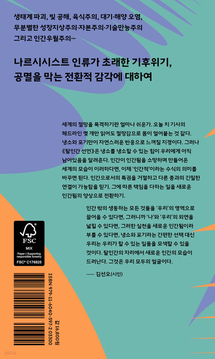 인간 밖의 생동하는 모든 것들을 ‘우리’의 영역으로 끌어올 수 있다면, 그러니까 ‘나’와 ‘우리’의 외연을 넓힐 수 있다면, 그러한 실천을 새로운 인간됨이라 부를 수 있다면, 냉소와 포기라는 간편한 선택 대신 우리는 우리가 할 수 있는 일들을 모색할 수 있을 것이다. 탈인간의 자리에서 새로운 인간의 모습이 드러난다. 그것은 우리 모두의 얼굴이다. - 김선오 (시인) |